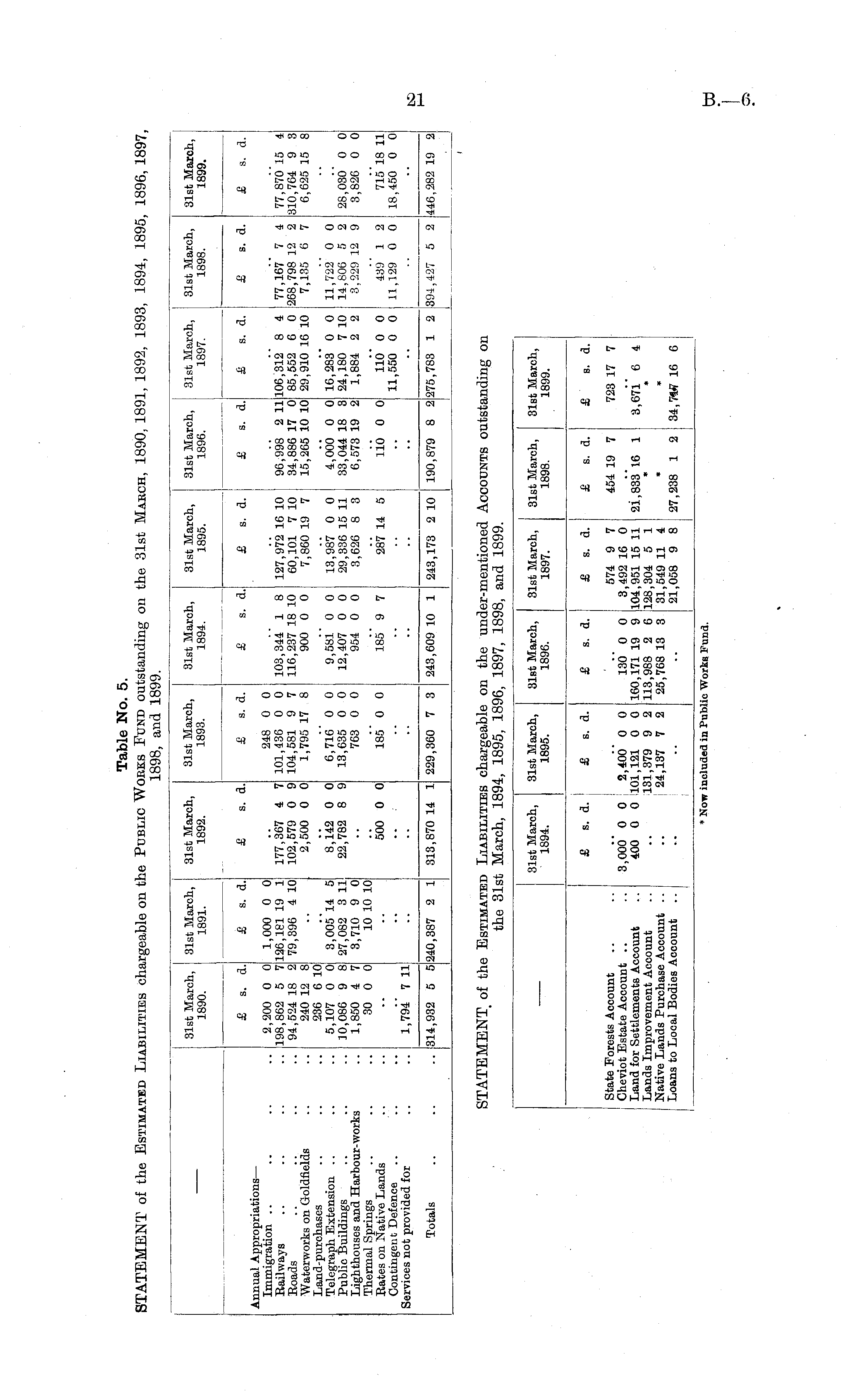 Table No. 5. STATEMENT of the Estimated Liabilities chargeable on the Public Works Fund outstanding on the 31st March, 1890, 1891, 1892, 1893, 1894, 1895, 1896, 1897, 1898, and 1899.
