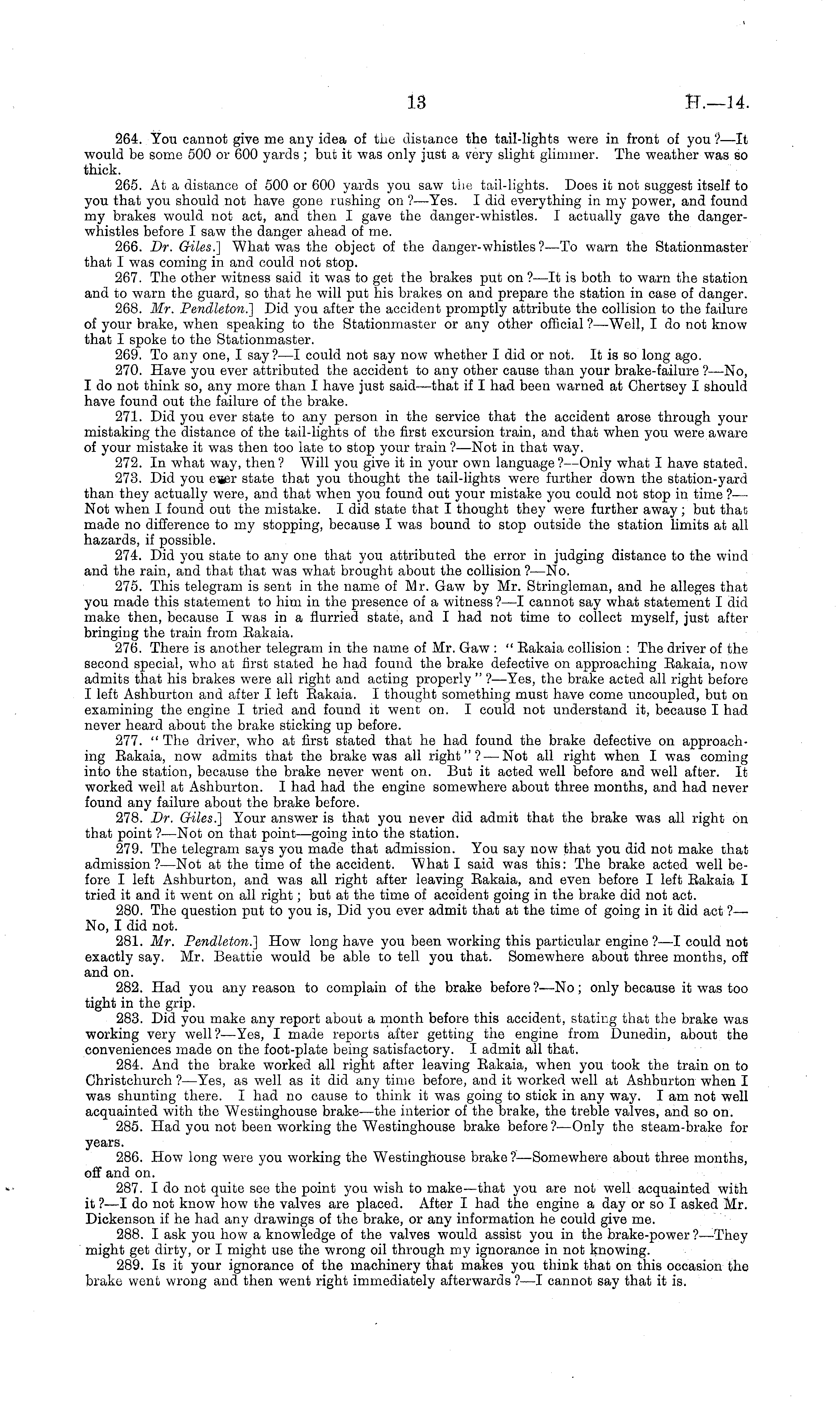 264. You cannot give me any idea of the distance the tail-lights were in front of you ?—lt would be some 500 or 600 yards ; but it was only just a very slight glimmer. The weather was so thick. 265. At a distance of 500 or 600 yards you saw the tail-lights. Does it not suggest itself to you that you should not have gone rushing on ?—Yes. I did everything in my power, and found my brakes would not act, and then I gave the danger-whistles. I actually gave the dangerwhistles before I saw the danger ahead of me. 266. Dr. Giles.] What was the object of the danger-whistles ?—To warn the Stationmaster that I was coming in and could not stop. 267. The other witness said it was to get the brakes put on ?—lt is both to warn the station and to warn the guard, so that he will put his brakes on and prepare the station in case of danger. 268. Mr. Pendleton.] Did you after the accident promptly attribute the collision to the failure of your brake, when speaking to the Stationmaster or any other official ?—Well, I do not know that I spoke to the Stationmaster. 269. To any one, I say?—l could not say now whether I did or not. It is so long ago. 270. Have you ever attributed the accident to any other cause than your brake-failure ?—No, I do not think so, any more than I have just said —that if I had been warned at Chertsey I should have found out the failure of the brake. 271. Did you ever state to any person in the service that the accident arose through your mistaking the distance of the tail-lights of the first excursion train, and that when you were aware of your mistake it was then too late to stop your train ?—Not in that way. 272. In what way, then? Will you give it in your own language?— Only what I have stated. 273. Did you eier state that you thought the tail-lights were further down the station-yard than they actually were, and that when you found out your mistake you could not stop in time ?— Not when I found out the mistake. I did state that I thought they were further away; but that made no difference to my stopping, because I was bound to stop outside the station limits at all hazards, if possible. 274. Did you state to any one that you attributed the error in judging distance to the wind and the rain, and that that was what brought about the collision ? —No. 275. This telegram is sent in the name of Mr. Gaw by Mr. Stringleman, and he alleges that you made this statement to him in the presence of a witness? —I cannot say what statement I did make then, because I was in a flurried state, and I had not time to collect myself, just after bringing the train from Eakaia. 276. There is another telegram in the name of Mr. Gaw : " Eakaia collision : The driver of the second special, who at first stated he had found the brake defective on approaching Eakaia, now admits that his brakes were all right and acting properly " ?—Yes, the brake acted all right before I left Ashburton and after I left Eakaia. I thought something must have come uncoupled, but on examining the engine I tried and found it went on. I could not understand it, because I had never heard about the brake sticking up before. 277. " The driver, who at first stated that he had found the brake defective on approaching Eakaia, now admits that the brake was all right"? — Not all right when I was coming into the station, because the brake never went on. But it acted well before and well after. It worked well at Ashburton. I had had the engine somewhere about three months, and had never found any failure about the brake before. 278. Dr. Giles.] Your answer is that you never did admit that the brake was all right on that point ?—Not on that point—going into the station. 279. The telegram says you made that admission. You say now that you did not make that admission?— Not at the time of the accident. "What I said was this: The brake acted well before I left Ashburton, and was all right after leaving Eakaia, and even before I left Eakaia I tried it and it went on all right; but at the time of accident going in the brake did not act. 280. The question put to you is, Did you ever admit that at the time of going in it did act ?— No, I did not. 281. Mr. Pendleton.] How long have you been working this particular engine ?—I could not exactly say. Mr. Beattie would be able to tell you that. Somewhere about three months, off and on. 282. Had you any reason to complain of the brake before ?—No; only because it was too tight in the grip. 283. Did you make any report about a month before this accident, stating that the brake was working very well?— Yes, I made reports after getting the engine from Dunedin, about the conveniences made on the foot-plate being satisfactory. I admit all that. 284. And the brake worked all right after leaving Eakaia, when you took the train on to Christchurch ? —Yes, as well as it did any time before, and it worked well at Ashburton when I was shunting there. I had no cause to think it was going to stick in any way. lam not well acquainted with the Westinghouse brake—the interior of the brake, the treble valves, and so on. 285. Had you not been working the Westinghouse brake before ? —Only the steam-brake for years. 286. How long were you working the Westinghouse brake ?—Somewhere about three months, off and on. 287. I do not quite see the point you wish to make—that you are not well acquainted with it ?—I do not know how the valves are placed. After I had the engine a day or so I asked Mr. Dickenson if he had any drawings of the brake, or any information he could give me. 288. I ask you how a knowledge of the valves would assist you in the brake-power ?—They might get dirty, or I might use the wrong oil through my ignorance in not knowing. 289. Is it your ignorance of the machinery that makes you think that on this occasion the brake went wrong and then went right immediately afterwards ?—I cannot say that it is.