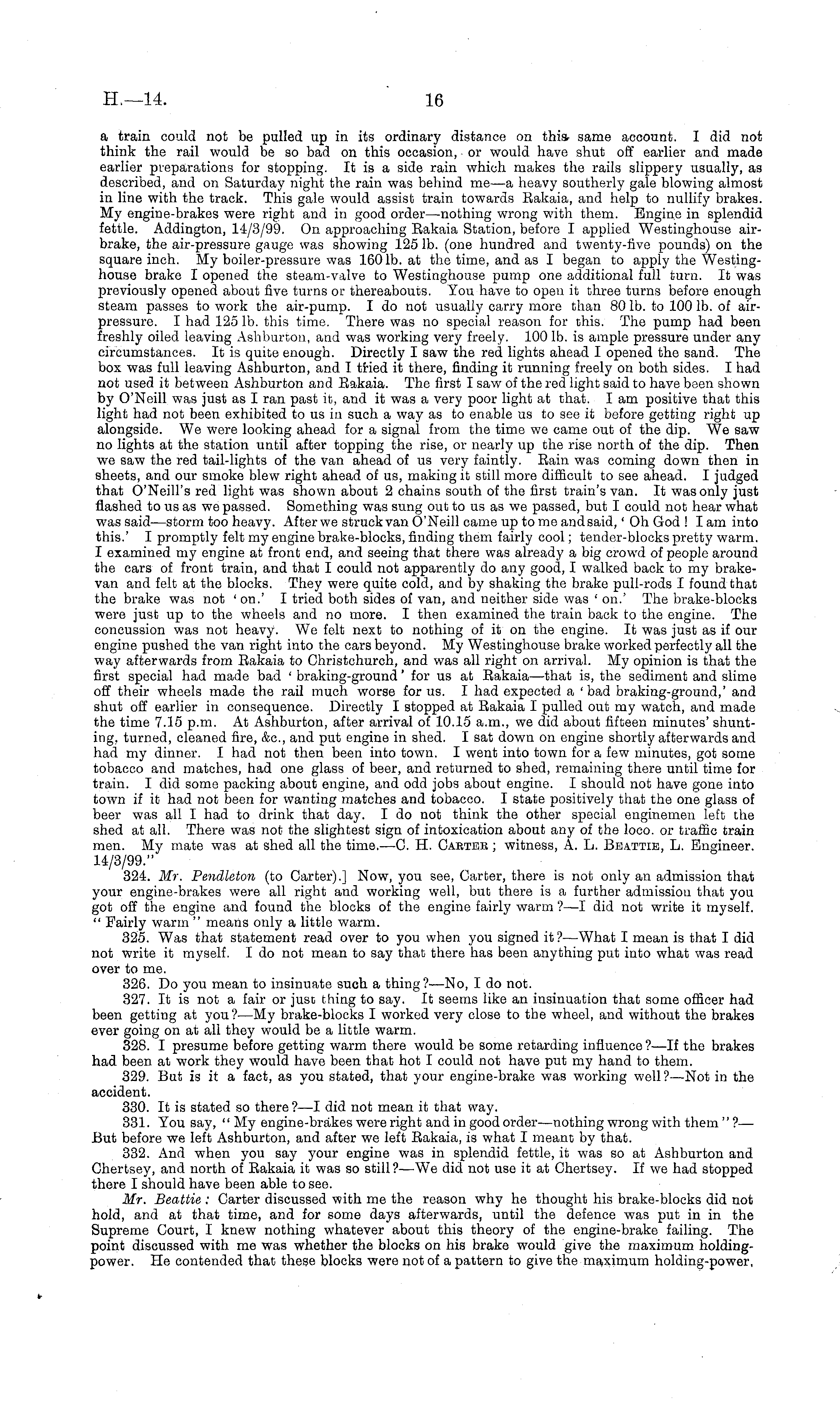 a train could not be pulled up in its ordinary distance on this same account. I did not think the rail would be so bad on this occasion, or would have shut off earlier and made earlier preparations for stopping. It is a side rain which makes the rails slippery usually, as described, and on Saturday night the rain was behind me—a heavy southerly gale blowing almost in line with the track. This gale would assist train towards Eakaia, and help to nullify brakes. My engine-brakes were right and in good order—nothing wrong with them. Engine in splendid fettle. Addington, 14/3/99. On approaching Bakaia Station, before I applied Westinghouse airbrake, the air-pressure gauge was showing 125 lb. (one hundred and twenty-five pounds) on the square inch. My boiler-pressure was 1601b. at the time, and as I began to apply the Westinghouse brake I opened the steam-valve to Westinghouse pump one additional full turn. It was previously opened about five turns or thereabouts. You have to open it three turns before enough steam passes to work the air-pump. I do not usually carry more than 80 lb. to 100 lb. of airpressure. I had 125 lb. this time. There was no special reason for this. The pump had been freshly oiled leaving Ashburton, and was working very freely. 100 lb. is ample pressure under any circumstances. It is quite enough. Directly I saw the red lights ahead I opened the sand. The box was full leaving Ashburton, and I tried it there, finding it running freely on both sides. I had not used it between Ashburton and Eakaia. The first I saw of the red light said to have been shown by O'Neill was just as I ran past it, and it was a very poor light at that. lam positive that this light had not been exhibited to us in such a way as to enable us to see it before getting right up alongside. We were looking ahead for a signal from the time we came out of the dip. We saw no lights at the station until after topping the rise, or nearly up the rise north of the dip. Then we saw the red tail-lights of the van ahead of us very faintly. Bain was coming down then in sheets, and our smoke blew right ahead of us, making it still more difficult to see ahead. I judged that O'Neill's red light was shown about 2 chains south of the first train's van. It was only just flashed to us as we passed. Something was sung out to us as we passed, but I could not hear what was said—storm too heavy. After we struck van O'Neill came up to me and said,' Oh God !I am into this.' I promptly felt my engine brake-blocks, finding them fairly cool; tender-blocks pretty warm. I examined my engine at front end, and seeing that there was already a big crowd of people around the cars of front train, and that I could not apparently do any good, I walked back to my brakevan and felt at the blocks. They were quite cold, and by shaking the brake pull-rods I found that the brake was not ' on.' I tried both sides of van, and neither side was ' on.' The brake-blocks were just up to the wheels and no more. I then examined the train back to the engine. The concussion was not heavy. We felt next to nothing of it on the engine. It was just as if our engine pushed the van right into the cars beyond. My Westinghouse brake worked perfectly all the way afterwards from Bakaia to Ghristchurch, and was all right on arrival. My opinion is that the first special had made bad ' braking-ground' for us at Bakaia—that is, the sediment and slime off their wheels made the rail much worse for us. I had expected a 'bad braking-ground,' and shut off earlier in consequence. Directly I stopped at Bakaia I pulled out my watch, and made the time 7.15 p.m. At Ashburton, after arrival of 10.15 a.m., we did about fifteen minutes' shunting, turned, cleaned fire, &c, and put engine in shed. I sat down on engine shortly afterwards and had my dinner. I had not then been into town. I went into town for a few minutes, got some tobacco and matches, had one glass of beer, and returned to shed, remaining there until time for train. I did some packing about engine, and odd jobs about engine. I should not have gone into town if it had not been for wanting matches and tobacco. I state positively that the one glass of beer was all I had to drink that day. I do not think the other special enginemen left the shed at all. There was not the slightest sign of intoxication about any of the loco, or traffic train men. My mate was at shed all the time.—o. H. Carter ; witness, A. L. Bbattib, L. Engineer. 14/3/99." 324. Mr. Pendleton (to Carter).] Now, you see, Carter, there is not only an admission that your engine-brakes were all right and working well, but there is a further admission that you got off the engine and found the blocks of the engine fairly warm ?—I did not write it myself. " Fairly warm " means only a little warm. 325. Was that statement read over to you when you signed it ?—What I mean is that I did not write it myself. Ido not mean to say that there has been anything put into what was read over to me. 326. Do you mean to insinuate such a thing?—No, I do not. 327. It is not a fair or just thing to say. It seems like an insinuation that some officer had been getting at you? —My brake-blocks I worked very close to the wheel, and without the brakes ever going on at ali they would be a little warm. 328. I presume before getting warm there would be some retarding influence ?—lf the brakes had been at work they would have been that hot I could not have put my hand to them. 329. But is it a fact, as you stated, that your engine-brake was working well ? —Not in the accident. 330. It is stated so there ? —I did not mean it that way. 331. You say, " My engine-brakes were right and in good order —nothing wrong with them " ?— But before we left Ashburton, and after we left Bakaia, is what I meant by that. 332. And when you say your engine was in splendid fettle, it was so at Ashburton and Chertsey, and north of Bakaia it was so still ?•—We did not use it at Cherts