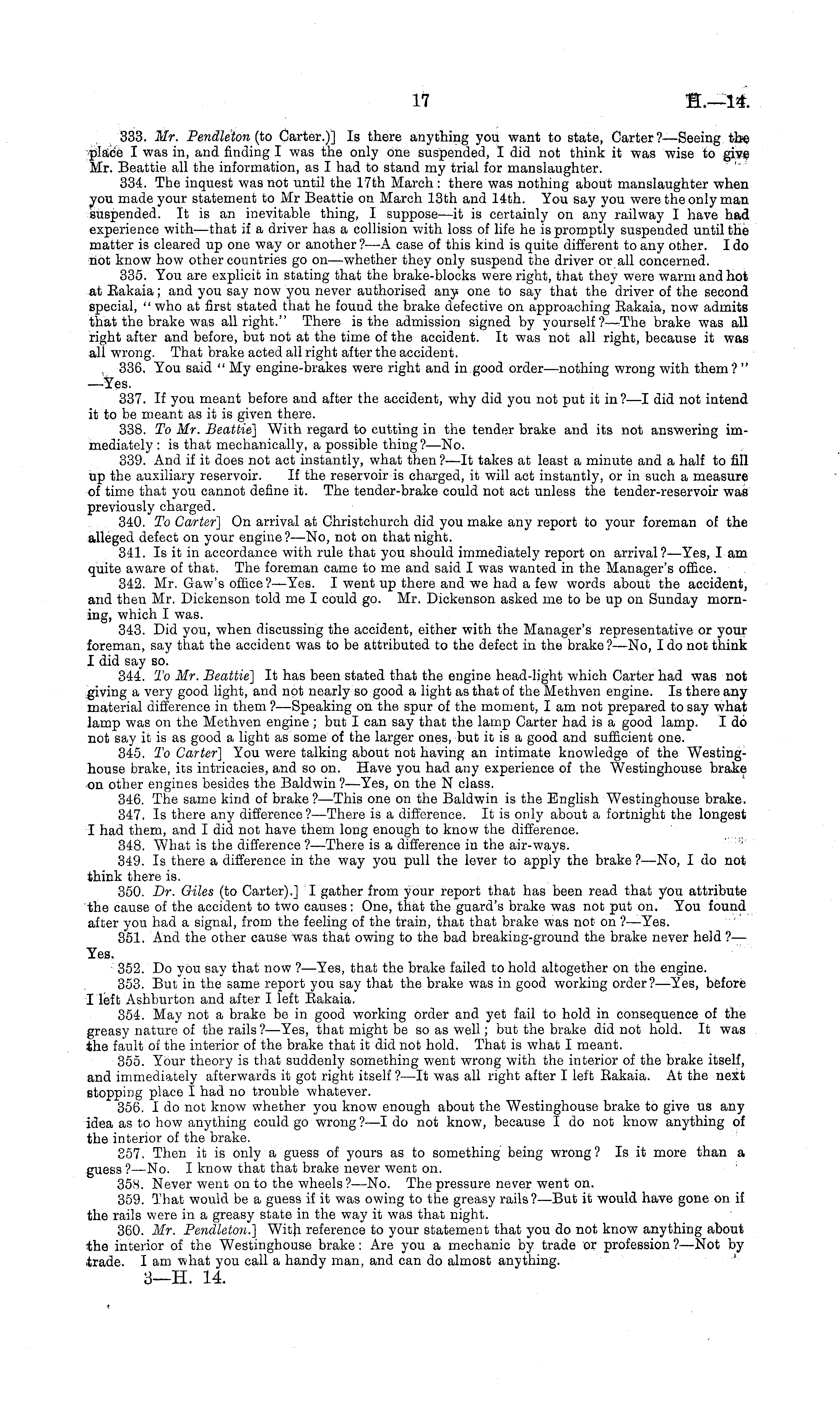 333. Mr. Pendleton (to Carter.)] Is there anything you want to state, Carter?— Seeing tbe iplace I was in, and finding I was the only one suspended, I did not think it was wise to give Mr. Beattie all the information, as I had to stand my trial for manslaughter. 334. The inquest was not until the 17th March : there was nothing about manslaughter when you made your statement to Mr Beattie on March 13th and 14th. You say you were the only man suspended. It is an inevitable thing, I suppose—it is certainly on any railway I have had experience with—that if a driver has a collision with loss of life he is promptly suspended until the matter is cleared up one way or another ?—A case of this kind is quite different to any other. Ido not know how other countries go on—whether they only suspend the driver or all concerned. 335. You are explicit in stating that the brake-blocks were right, that they were warm and hot at Eakaia; and you say now you never authorised any one to say that the driver of the second special, " who at first stated that he found the brake defective on approaching Eakaia, now admits that the brake was all right." There is the admission signed by vourself?—The brake was all right after and before, but not at the time of the accident. It was not all right, because it was all wrong. That brake acted all right after the accident. 336. You said " My engine-brakes were right and in good order—nothing wrong with them? " —Yes. 337. If you meant before and after the accident, why did you not put it in?—l did not intend it to be meant as it is given there. 338. To Mr. Beattie] With regard to cutting in the tender brake and its not answering immediately : is that mechanically, a possible thing?— No. 339. And if it does not act instantly, what then ?—lt takes at least a minute and a half to fill up the auxiliary reservoir. If the reservoir is charged, it will act instantly, or in such a measure of time that you cannot define it. The tender-brake could not act unless the tender-reservoir was previously charged. 340. To Carter] On arrival at Christchurch did you make any report to your foreman of the alleged defect on your engine ?—No, not on that night. 341. Is it in accordance with rule that you should immediately report on arrival?— Yes, I am quite aware of that. The foreman came to me and said I was wanted in the Manager's office. 342. Mr. Gaw's office?— Yes. I went up there and we had a few words about the accident, and then Mr. Dickenson told me I could go. Mr. Dickenson asked me to be up on Sunday morning, which I was. 343. Did you, when discussing the accident, either with the Manager's representative or your foreman, say that the accident was to be attributed to the defect in the brake ?—No, I do not think I did say bo. 344. To Mr. Beattie] It has been stated that the engine head-light which Carter had was not giving a very good light, and not nearly so good a light as that of the Methven engine. Is there any material difference in them ? —Speaking on the spur of the moment, I am not prepared to say what lamp was on the Methven engine ; but I can say that the lamp Carter had is a good lamp. Ido not say it is as good a light as some of the larger ones, but it is a good and sufficient one. 345. To Carter] You were talking about not having an intimate knowledge of the Westinghouse brake, its intricacies, and so on. Have you had any experience of the Westinghouse brake on other engines besides the Baldwin?— Yes, on the N class. 346. The same kind of brake ? —This one on the Baldwin is the English Westinghouse brake. 347. Is there any difference? —There is a difference. It is only about a fortnight the longest I had them, and I did not have them long enough to know the difference. 348. What is the difference ?—There is a difference in the air-ways. 349. Is there a difference in the way you pull the lever to apply the brake ?—No, I do not think there is. 350. Dr. Giles (to Carter).] I gather from your report that has been read that you attribute the cause of the accident to two causes: One, that the guard's brake was not put on. You found after you had a signal, from the feeling of the train, that that brake was not on ?—Yes. 351. And the other cause was that owing to the bad breaking-ground the brake never held ? — Yes. 352. Do you say that now ?—Yes, that the brake failed to hold altogether on the engine. 353. But in the same report you say that the brake was in good working order?— Yes, before I left Ashburton and after I left Eakaia. 354. May not a brake be in good working order and yet fail to hold in consequence of the greasy nature of the rails ? —Yes, that might be so as well; but the brake did not hold. It was the fault of the interior of the brake that it did not hold. That is what I meant. 355. Your theory is that suddenly something went wrong with the interior of the brake itself, and immediately afterwards it got right itself ?—lt was all right after I left Eakaia. At the next stopping place I had no trouble whatever. 356. I do not know whether you know enough about the Westinghouse brake to give us any idea as to how anything could go wrong?—l do not know, because Ido not know anything of the interior of the brake. 357. Then it is only a guess of yours as to something being wrong? Is it more than a guess ? —No. I know that that brake never went on. 355. Never went on to the wheels ?—No. The pressure never went on. 359. That would be a guess if it was owing to the greasy rails?— But it would have gone on if the rails were in a greasy state in the way it was that night. 360. Mr. Pendleton.] With reference to your statement that you do not know anything about the interior of the Westinghouse brake: Are you a mechanic by trade or profession ? —Not by trade. lam what you call a handy man, and can do almost anything. 3—H. 14.
