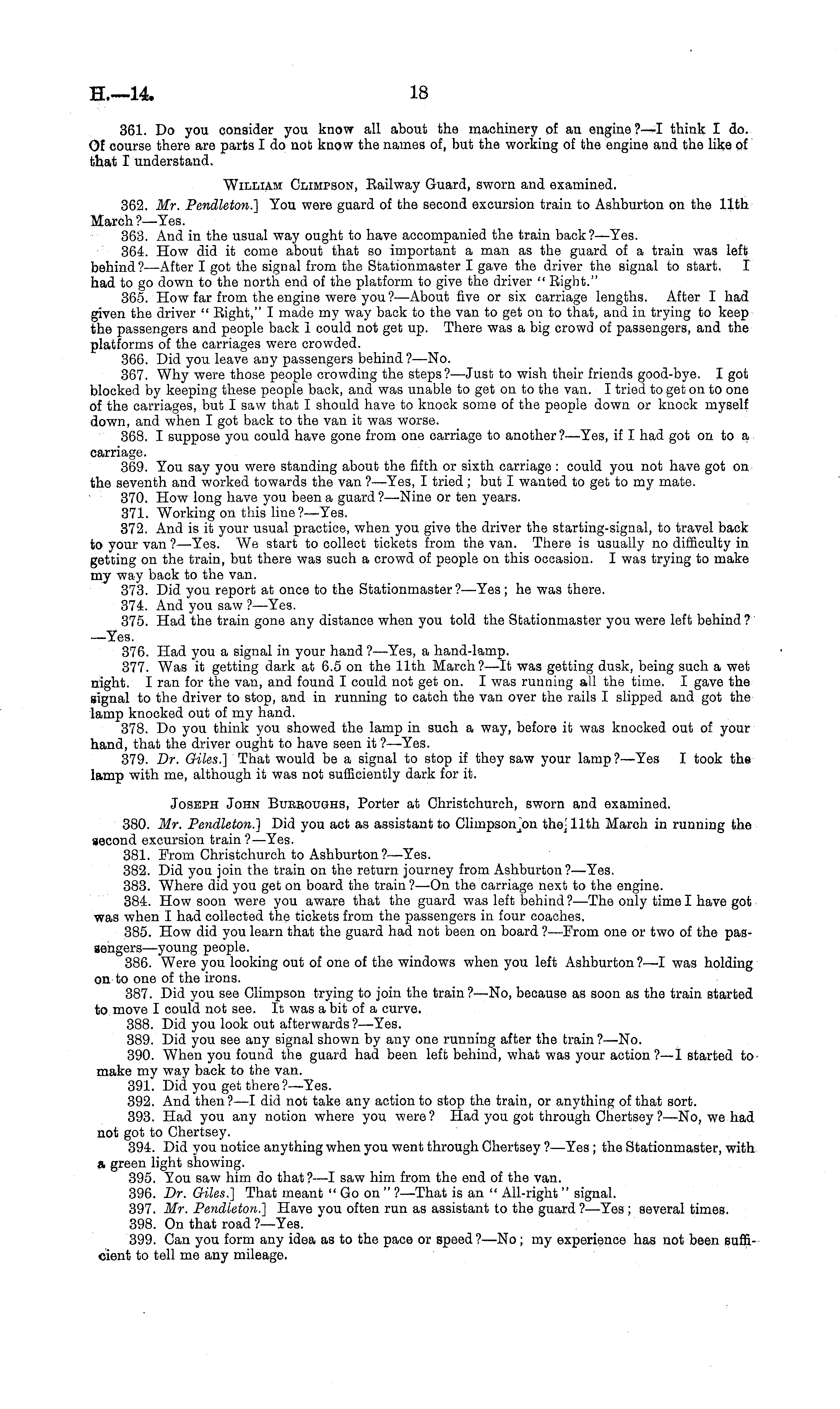 361. Do you consider you know all about the machinery of an engine ?—I think I do. Of course there are parts I do not know the names of, but the working of the engine and the like of that I understand. William Climpson, Railway Guard, sworn and examined. 362. Mr. Pendleton.] You were guard of the second excursion train to Ashburton on the 11th March?— Yes. 363. And in the usual way ought to have accompanied the train back?— Yes. 364. How did it come about that so important a man as the guard of a train was left behind? —After I got the signal from the Stationmaster I gave the driver the signal to start. I had to go down to the north end of the platform to give the driver " Right." 365. How far from the engine were you ? —About five or six carriage lengths. After I had given the driver " Right," I made my way back to the van to get on to that, and in trying to keep the passengers and people back I could not get up. There was a big crowd of passengers, and the platforms of the carriages were crowded. 366. Did you leave any passengers behind ? —No. 367. Why were those people crowding the steps? —Just to wish their friends good-bye. I got blocked by keeping these people back, and was unable to get on to the van. I tried to get on to one of the carriages, but I saw that I should have to knock some of the people down or knock myself down, and when I got back to the van it was worse. 368. I suppose you could have gone from one carriage to another?— Yes, if I had got on to a carriage. 369. You say you were standing about the fifth or sixth carriage : could you not have got on the seventh and worked towards the van ?—Yes, I tried; but I wanted to get to my mate. 370. How long have you been a guard ?—Nine or ten years. 371. Working on this line?— Yes. 372. And is it your usual practice, when you give the driver the starting-signal, to travel back to your van ? —Yes. We start to collect tickets from the van. There is usually no difficulty in getting on the train, but there was such a crowd of people on this occasion. I was trying to make my way back to the van. 373. Did you report at once to the Stationmaster?—Yes; he was there. 374. And you saw ? —Yes. 375. Had the train gone any distance when you told the Stationmaster you were left behind? —Yes. 376. Had you a signal in your hand ? —Yes, a hand-lamp. 377. Was it getting dark at 6.5 on the 11th March?—lt was getting dusk, being such a wet night. I ran for the van, and found I could not get on. I was running all the time. I gave the signal to the driver to stop, and in running to catch the van over the rails I slipped and got the lamp knocked out of my hand. 378. Do you think you showed the lamp in such a way, before it was knocked out of your hand, that the driver ought to have seen it ? —-Yes. 379. Dr. Giles.] That would be a signal to stop if they saw your lamp ?—Yes I took the lamp with me, although it was not sufficiently dark for it. Joseph John Bueboughs, Porter at Ohristchurch, sworn and examined. 380. Mr. Pendleton.] Did you act as assistant to the.! 11th March in running the second excursion train? —Yes. 381. From Christchurch to Ashburton?—Yes. 382. Did you join the train on the return journey from Ashburton ?—Yes. 383. Where did you get on board the train ?—On the carriage next to the engine. 384. How soon were you aware that the guard was left behind?— The only time I have got was when I had collected the tickets from the passengers in four coaches. 385. How did you learn that the guard had not been on board ?—From one or two of the passengers—young people. 386. Were you looking out of one of the windows when you left Ashburton?—l was holding on to one of the irons. 387. Did you see Climpson trying to join the train?—No, because as soon as the train started to move I could not see. It was a bit of a curve. 388. Did you look out afterwards?— Yes. 389. Did you see any signal shown by any one running after the train ?—No. 390. When you found the guard had been left behind, what was your action?—l started to make my way back to the van. 391. Did you get there?— Yes. 392. And then?—l did not take any action to stop the train, or anything of that sort. 393. Had you any notion where you were? Had you got through Ghertsey ?—No, we had not got to Chertsey. 394. Did you notice anything when you went through Ghertsey ?—Yes ; the Stationmaster, with a green light showing. 395. You saw him do that ?—I saw him from the end of the van. 396. Dr. Giles.] That meant "Go on " ?—That is an " All-right " signal. 397. Mr. Pendleton.] Have you often run as assistant to the guard ?—Yes ; several times. 398. On that road ?—Yes. 399. Can you form any idea as to the pace or speed ?—No; my experience has not been sufficient to tell me any mileage.