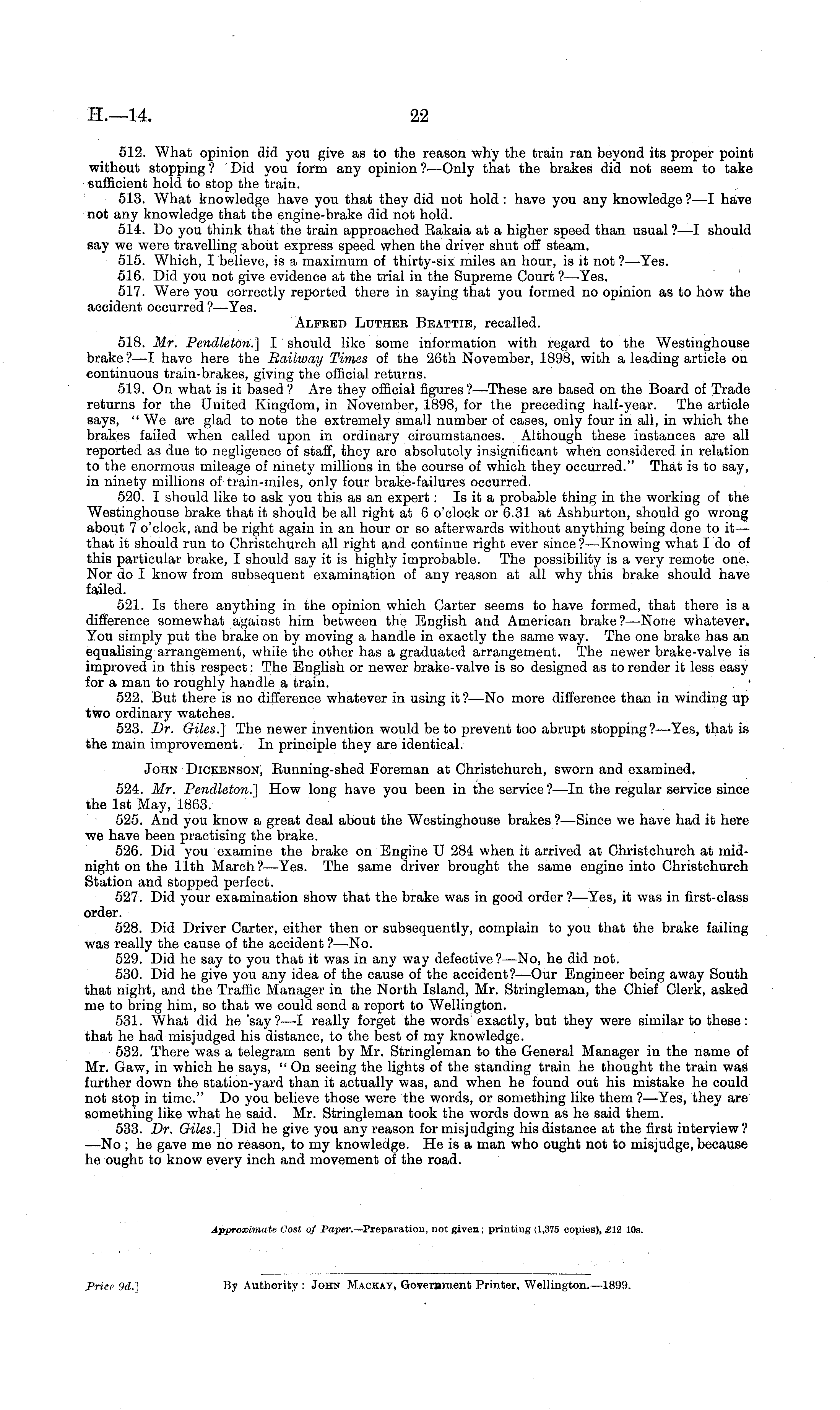 512. What opinion did you give as to the reason why the train ran beyond its proper point without stopping ? Did you form any opinion ?—Only that the brakes did not seem to take sufficient hold to stop the train. 513. What knowledge have you that they did not hold : have you any knowledge ?—I have not any knowledge that the engine-brake did not hold. 514. Do you think that the train approached Rakaia at a higher speed than usual ?—I should say we were travelling about express speed when the driver shut off steam. 515. Which, I believe, is a maximum of thirty-six miles an hour, is it not ? —Yes. 516. Did you not give evidence at the trial in the Supreme Court ?—-Yes. 517. Were you correctly reported there in saying that you formed no opinion as to how the accident occurred ?—Yes. Alfked Luthbe Beattib, recalled. 518. Mr. Pendletori.] I should like some information with regard to the Westinghouse brake ?—I have here the Railway Times of the 26th November, 1898, with a leading article on continuous train-brakes, giving the official returns. 519. On what is it based ? Are they official figures ?—These are based on the Board of Trade returns for the United Kingdom, in November, 1898, for the preceding half-year. The article says, "We are glad to note the extremely small number of cases, only four in all, in which the brakes failed when called upon in ordinary circumstances. Although these instances are all reported as due to negligence of staff, they are absolutely insignificant when considered in relation to the enormous mileage of ninety millions in the course of which they occurred." That is to say, in ninety millions of train-miles, only four brake-failures occurred. 520. I should like to ask you this as an expert: Is it a probable thing in the working of the Westinghouse brake that it should be all right at 6 o'clock or 6.31 at Ashburton, should go wrong about 7 o'clock, and be right again in an hour or so afterwards without anything being done to it— that it should run to Christchurch all right and continue right ever since ?—Knowing what I do of this particular brake, I should say it is highly improbable. The possibility is a very remote one. Nor do I know from subsequent examination of any reason at all why this brake should have failed. 521. Is there anything in the opinion which Carter seems to have formed, that there is a difference somewhat against him between the English and American brake?— None whatever. You simply put the brake on by moving a handle in exactly the same way. The one brake has an equalising arrangement, while the other has a graduated arrangement. The newer brake-valve is improved in this respect: The English or newer brake-valve is so designed as to render it less easy for a man to roughly handle a train. 522. But there is no difference whatever in using it?—No more difference than in winding up two ordinary watches. 523. Dr. Giles.] The newer invention would be to prevent too abrupt stopping?—-Yes, that is the main improvement. In principle they are identical. John Dickenson, Eunning-shed Foreman at Christchurch, sworn and examined. 524. Mr. Pendleton.] How long have you been in the service ? —ln the regular service since the Ist May, 1863. 525. And you know a great deal about the Westinghouse brakes ?—Since we have had it here we have been practising the brake. 526. Did you examine the brake on Engine U 284 when it arrived at Christchurch at midnight on the 11th March?— Yes. The same driver brought the same engine into Christchurch Station and stopped perfect. 527. Did your examination show that the brake was in good order ? —Yes, it was in first-class order. 528. Did Driver Carter, either then or subsequently, complain to you that the brake failing was really the cause of the accident ?—No. 529. Did he say to you that it was in any way defective ? —No, he did not. 530. Did he give you any idea of the cause of the accident?— Our Engineer being away South that night, and the Traffic Manager in the North Island, Mr. Stringleman, the Chief Clerk, asked me to bring him, so that we could send a report to Wellington. 531. What did he 'say?—l really forget the words exactly, but they were similar to these: that he had misjudged his distance, to the best of my knowledge. 532. There was a telegram sent by Mr. Stringleman to the General Manager in the name of Mr. Gaw, in which he says, " On seeing the lights of the standing train he thought the train was further down the station-yard than it actually was, and when he found out his mistake he could not stop in time." Do you believe those were the words, or something like them ?—Yes, they are something like what he said. Mr. Stringleman took the words down as he said them. 533. Dr. Giles.] Did he give you any reason for misjudging his distance at the first interview? —No ;he gave me no reason, to my knowledge. He is a man who ought not to misjudge, because he ought to know every inch and movement of the road.