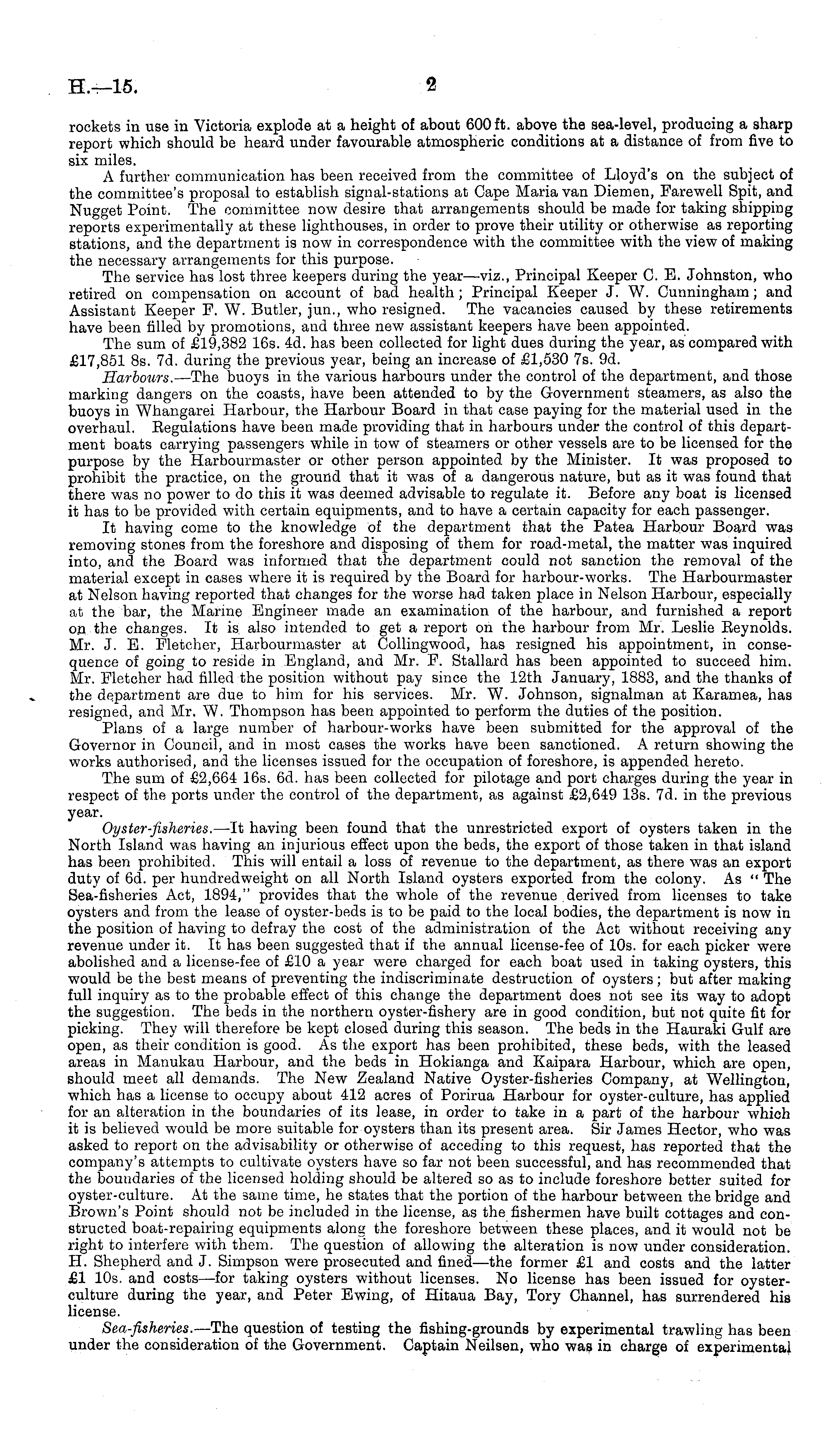 rockets in use in Victoria explode at a height of about 600 ft. above the sea-level, producing a sharp report which should be heard under favourable atmospheric conditions at a distance of from five to six miles. A further communication has been received from the committee of Lloyd's on the subject of the committee's proposal to establish signal-stations at Cape Maria van Diemen, Farewell Spit, and Nugget Point. The committee now desire that arrangements should be made for taking shipping reports experimentally at these lighthouses, in order to prove their utility or otherwise as reporting stations, and the department is now in correspondence with the committee with the view of making the necessary arrangements for this purpose. The service has lost three keepers during the year —viz., Principal Keeper C. B. Johnston, who retired on compensation on account of bad health; Principal Keeper J. W. Cunningham; and Assistant Keeper P. W. Butler, jun., who resigned. The vacancies caused by these retirements have been filled by promotions, and three new assistant keepers have been appointed. The sum of £19,382 16s. 4d. has been collected for light dues during the year, as compared with £17,851 Bs. 7d. during the previous year, being an increase of £1,530 7s. 9d. Harbours. —The buoys in the various harbours under the control of the department, and those marking dangers on the coasts, have been attended to by the Government steamers, as also the buoys in Whangarei Harbour, the Harbour Board in that case paying for the material used in the overhaul. Eegulations have been made providing that in harbours under the control of this department boats carrying passengers while in tow of steamers or other vessels are to be licensed for the purpose by the Harbourmaster or other person appointed by the Minister. It was proposed to prohibit the practice, on the ground that it was of a dangerous nature, but as it was found that there was no power to do this it was deemed advisable to regulate it. Before any boat is licensed it has to be provided with certain equipments, and to have a certain capacity for each passenger. It having come to the knowledge of the department that the Patea Harbour Board was removing stones from the foreshore and disposing of them for road-metal, the matter was inquired into, and the Board was informed that the department could not sanction the removal of the material except in cases where it is required by the Board for harbour-works. The Harbourmaster at Nelson having reported that changes for the worse had taken place in Nelson Harbour, especially at the bar, the Marine Engineer made an examination of the harbour, and furnished a report on the changes. It is also intended to get a report on the harbour from Mr. Leslie Eeynolds. Mr. J. E. Fletcher, Harbourmaster at Collingwood, has resigned his appointment, in consequence of going to reside in England, and Mr. F. Stallard has been appointed to succeed him. Mr. Fletcher had filled the position without pay since the 12th January, 1883, and the thanks of the department are due to him for his services. Mr. W. Johnson, signalman at Karamea, has resigned, and Mr. W. Thompson has been appointed to perform the duties of the position. Plans of a large number of harbour-works have been submitted for the approval of the Governor in Council, and in most cases the works have been sanctioned. A return showing the works authorised, and the licenses issued for the occupation of foreshore, is appended hereto. The sum of £2,664 16s. 6d. has been collected for pilotage and port charges during the year in respect of the ports under the control of the department, as against £2,649 13s. 7d. in the previous year. Oyster-fisheries. —lt having been found that the unrestricted export of oysters taken in the North Island was having an injurious effect upon the beds, the export of those taken in that island has been prohibited. This will entail a loss of revenue to the department, as there was an export duty of 6d. per hundredweight on all North Island oysters exported from the colony. As " The Sea-fisheries Act, 1894," provides that the whole of the revenue derived from licenses to take oysters and from the lease of oyster-beds is to be paid to the local bodies, the department is now in the position of having to defray the cost of the administration of the Act without receiving any revenue under it. It has been suggested that if the annual license-fee of 10s. for each picker were abolished and a license-fee of £10 a year were charged for each boat used in taking oysters, this would be the best means of preventing the indiscriminate destruction of oysters; but after making full inquiry as to the probable effect of this change the department does not see its way to adopt the suggestion. The beds in the northern oyster-fishery are in good condition, but not quite fit for picking. They will therefore be kept closed during this season. The beds in the Hauraki Gulf are open, as their condition is good. As the export has been prohibited, these beds, with the leased areas in Manukau Harbour, and the beds in Hokianga and Kaipara Harbour, which are open, should meet all demands. The New Zealand Native Oyster-fisheries Company, at Wellington, which has a license to occupy about 412 acres of Porirua Harbour for oyster-culture, has applied for an alteration in the boundaries of its lease, in order to take in a part of the harbour which it is believed would be more suitable for oysters than its present area. Sir James Hector, who was asked to report on the advisability or otherwise of acceding to this request, has reported that the company's attempts to cultivate oysters have so far not been successful, and has recommended that the boundaries of the licensed holding should be altered so as to include foreshore better suited for oyster-culture. At the same time, he states that the portion of the harbour between the bridge and Brown's Point should not be include