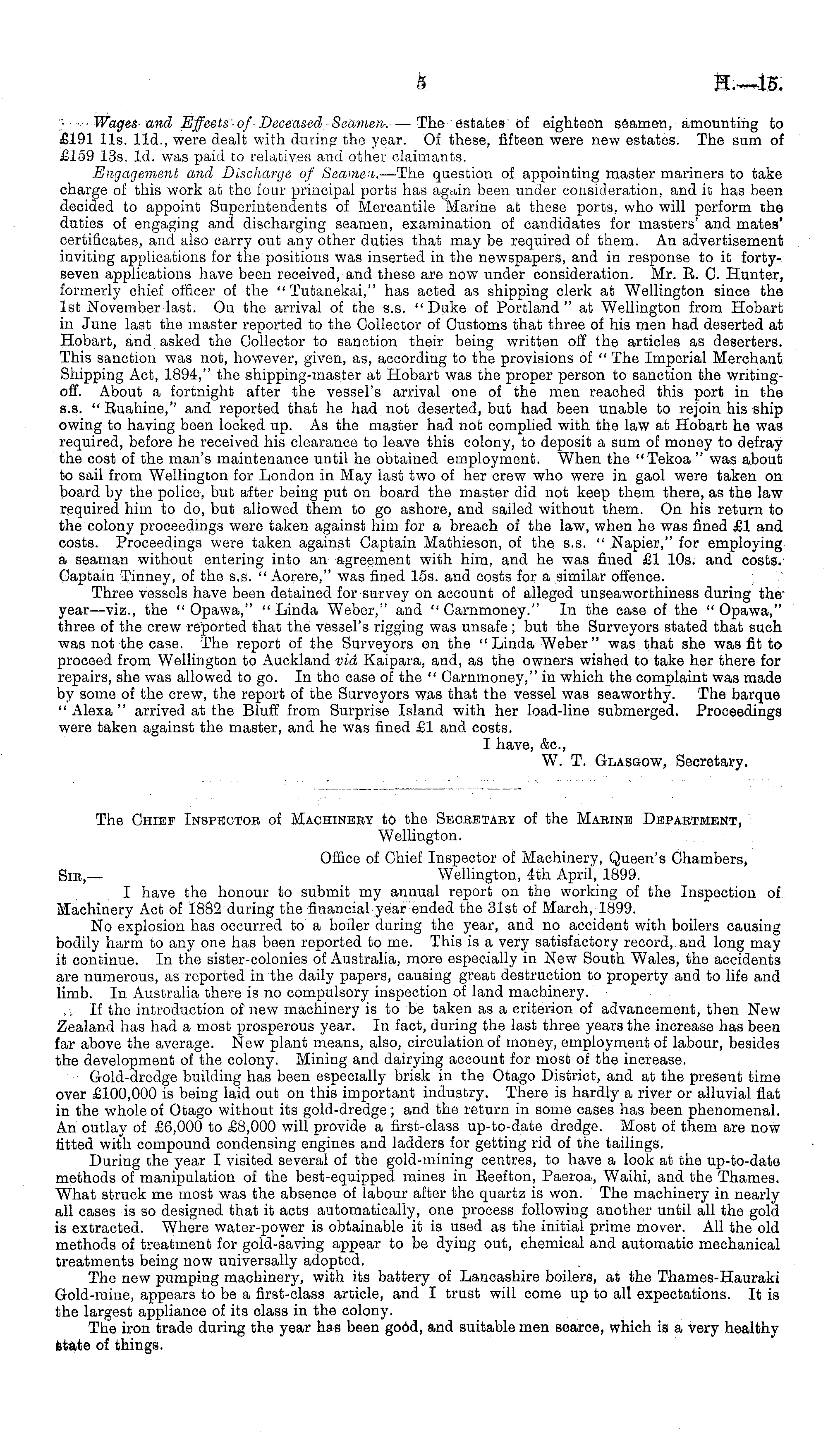 The Chief Inspector of Machinery to the Secretary of the Marine Department, Wellington. Office of Chief Inspector of Machinery, Queen's Chambers, Sir,— Wellington, 4th April, 1899. I have the honour to submit my annual report on the working of the Inspection of Machinery Act of 1882 during the financial year ended the 31st of March, 1899. No explosion has occurred to a boiler during the year, and no accident with boilers causing bodily harm to any one has been reported to me. This is a very satisfactory record, and long may it continue. In the sister-colonies of Australia, more especially in New South Wales, the accidents are numerous, as reported in the daily papers, causing great destruction to property and to life and limb. In Australia there is no compulsory inspection of land machinery. ,v If the introduction of new machinery is to be taken as a criterion of advancement, then New Zealand has had a most prosperous year. In fact, during the last three years the increase has been far above the average. New plant means, also, circulation of money, employment of labour, besides the development of the colony. Mining and dairying account for most of the increase. Gold-dredge building has been especially brisk in the Otago District, and at the present time over £100,000 is being laid out on this important industry. There is hardly a river or alluvial flat in the whole of Otago without its gold-dredge; and the return in some cases has been phenomenal. An outlay of £6,000 to £8,000 will provide a first-class up-to-date dredge. Most of them are now fitted with compound condensing engines and ladders for getting rid of the tailings. During the year I visited several of the gold-mining centres, to have a look at the up-to-date methods of manipulation of the best-equipped mines in Eeefton, Paeroa, Waihi, and the Thames. What struck me most was the absence of labour after the quartz is won. The machinery in nearly all cases is so designed that it acts automatically, one process following another until all the gold is extracted. Where water-power is obtainable it is used as the initial prime mover. All the old methods of treatment for gold-saving appear to be dying out, chemical and automatic mechanical treatments being now universally adopted. The new pumping machinery, with its battery of Lancashire boilers, at the Thames-Hauraki Gold-mine, appears to be a first-class article, and I trust will come up to all expectations. It is the largest appliance of its class in the colony. The iron trade during the year has been good, and suitable men scarce, which is a very healthy fetate of things.