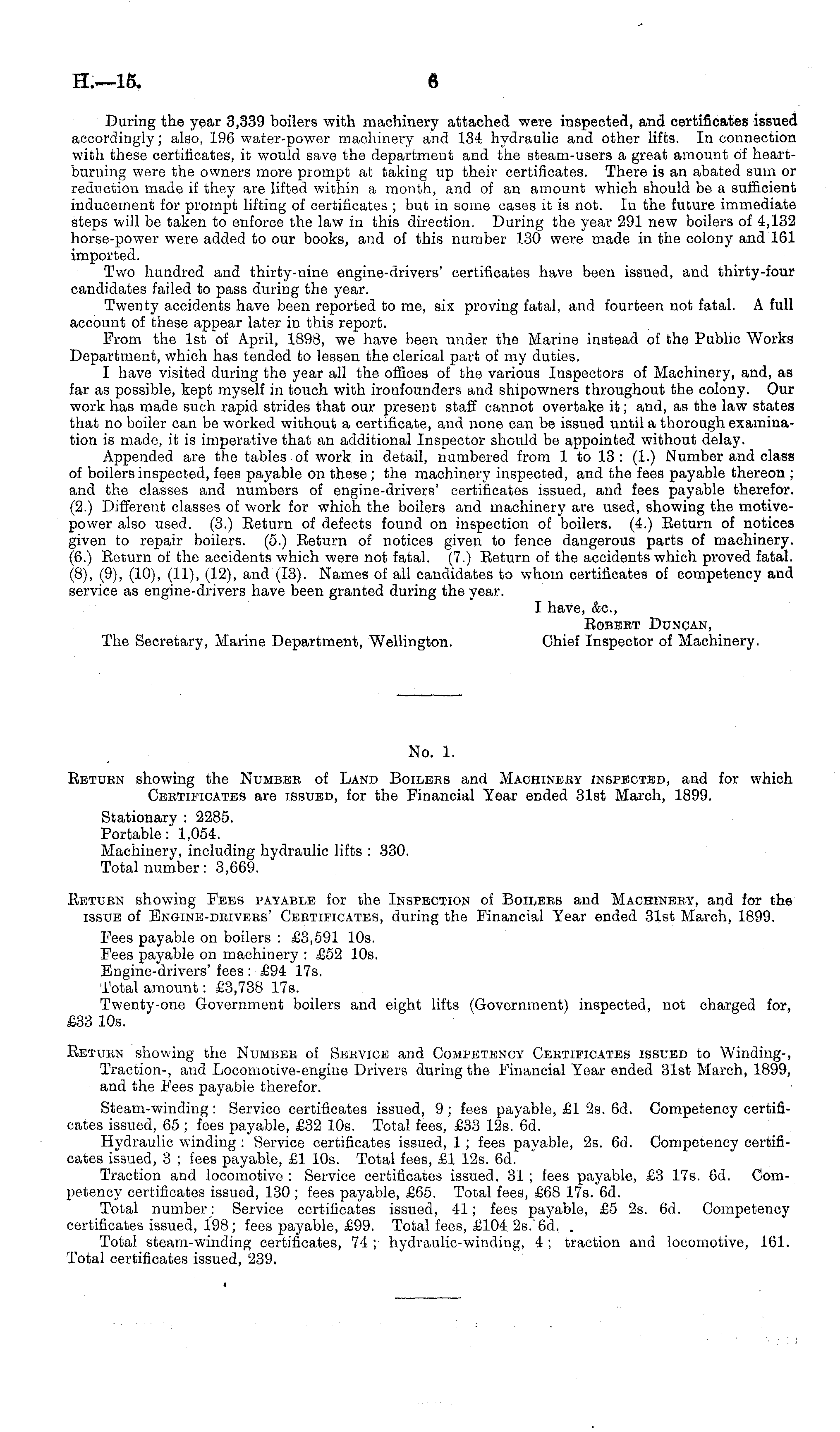 During the year 3,339 boilers with machinery attached were inspected, and certificates issued accordingly; also, 196 water-power machinery and 134 hydraulic and other lifts. In connection with these certificates, it would save the department and the steam-users a great amount of heartburning were the owners more prompt at taking up their certificates. There is an abated sum or reduction made if they are lifted within a month, and of an amount which should be a sufficient inducement for prompt lifting of certificates ; but in some cases it is not. In the future immediate steps will be taken to enforce the law in this direction. During the year 291 new boilers of 4,132 horse-power were added to our books, and of this number 130 were made in the colony and 161 imported. Two hundred and thirty-nine engine-drivers' certificates have been issued, and thirty-four candidates failed to pass during the year. Twenty accidents have been reported to me, six proving fatal, and fourteen not fatal. A full account of these appear later in this report. From the Ist of April, 1898, we have been under the Marine instead of the Public Works Department, which has tended to lessen the clerical part of my duties. I have visited during the year all the offices of the various Inspectors of Machinery, and, as far as possible, kept myself in touch with ironfounders and shipowners throughout the colony. Our work has made such rapid strides that our present staff cannot overtake it; and, as the law states that no boiler can be worked without a certificate, and none can be issued until a thorough examination is made, it is imperative that an additional Inspector should be appointed without delay. Appended are the tables of work in detail, numbered from 1 to 13 : (1.) Number and class of boilers inspected, fees payable on these ; the machinery inspected, and the fees payable thereon ; and the classes and numbers of engine-drivers' certificates issued, and fees payable therefor. (2.) Different classes of work for which the boilers and machinery are used, showing the motivepower also used. (3.) Eeturn of defects found on inspection of boilers. (4.) Eeturn of notices given to repair boilers. (5.) Return of notices given to fence dangerous parts of machinery. (6.) Return of the accidents which were not fatal. (7.) Eeturn of the accidents which proved fatal. (8), (9), (10), (11), (12), and (13). Names of all candidates to whom certificates of competency and service as engine-drivers have been granted during the year. I have, &c, Egbert Duncan, The Secretary, Marine Department, Wellington. Chief Inspector of Machinery.