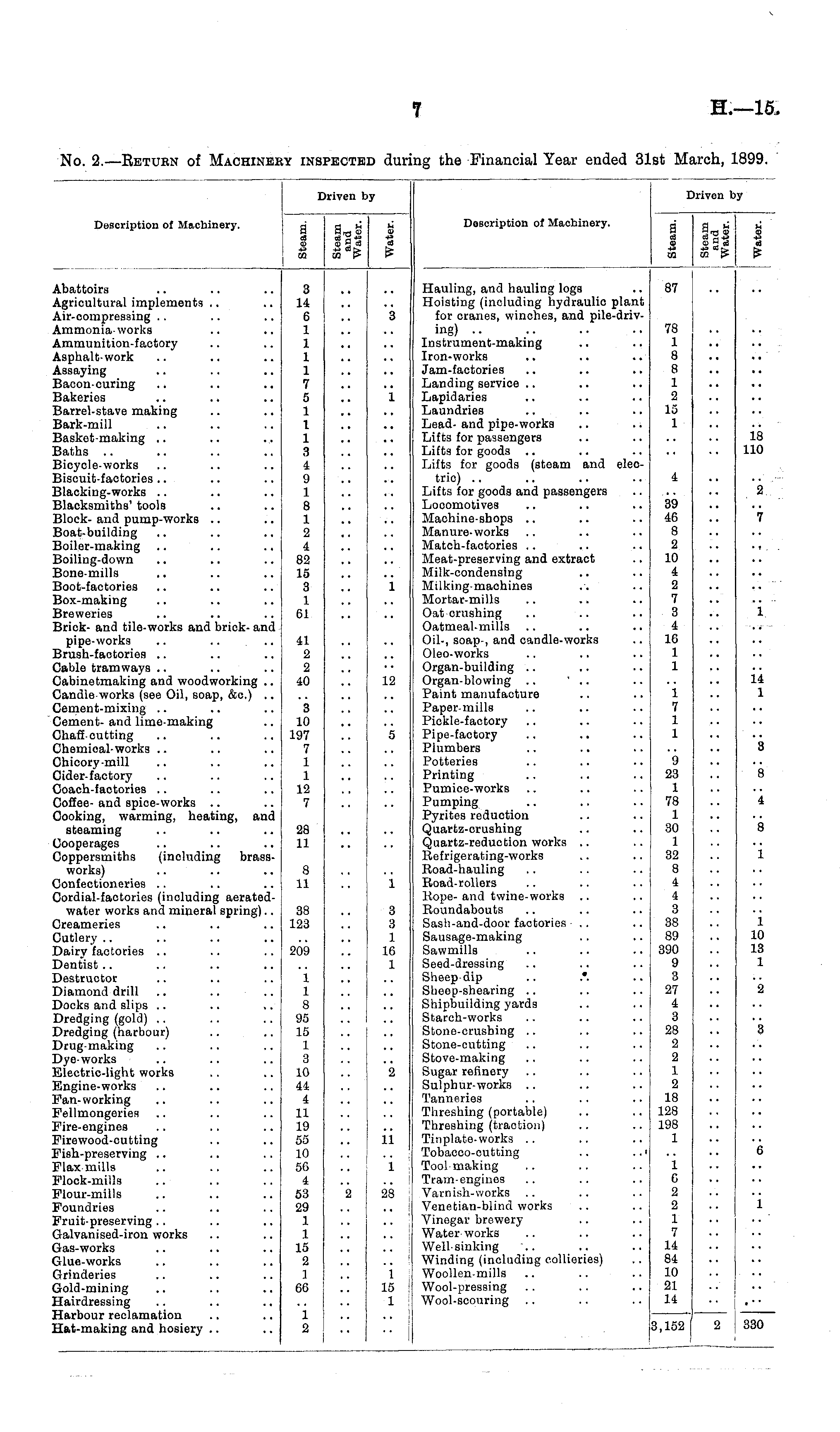 Description of Machinery. I a I ax )riven Sag CO t> I Description of Machinery. a s Iriven m t> s Abattoirs Agricultural implements Air-compressing Ammonia-works .. .. Ammunition-factory Asphalt-work Assaying Bacon-curing Bakeries Barrel-stave making Bark-mill Basket-making Baths .. Bicycle-works Biscuit-factories Blacking-works Blacksmiths' tools Block- and pump-works Boat-building Boiler-making Boiling-down Bone-mills Boot-factories Box-making Breweries Brick- and tile-works and brick- and pipe-works Brush-factories Cable tramways Cabinetmaking and woodworking .. Candle works (see Oil, soap, &c.) .. Cement-mixing Cement- and lime-making Chaff-cutting Chemical-works Chicory-mill Cider-factory Coach-factories Coffee- and spice-works Cooking, warming, heating, and steaming Cooperages Coppersmiths (including brassworks) Confectioneries Cordial-factories (including aeratedwater works and mineral spring).. Creameries Cutlery Dairy factories Dentist Destructor Diamond drill Docks and slips Dredging (gold) Dredging (harbour) Drug-making Dye-works Electric-light works Engine-works Fan-working Pellmongeries Fire-engines Firewood-cutting Fish-preserving Flax mills Flock-mills Flour-mills Foundries Fruit-preserving.. Galvanised-iron works Gas-works Glue-works Grinderies Gold-mining Hairdressing Harbour reclamation Hat-making and hosiery .. 3 14 6 1 1 1 1 7 5 1 t 1 3 4 9 1 8 1 2 4 82 15 3 1 61 41 2 2 40 3 10 197 7 1 1 12 7 *3 1 1 12 5 Hauling, and hauling logs Hoisting (including hydraulic plant for cranes, winches, and pile-driv-ing) .. Instrument-making Iron-works Jam-factories Landing service Lapidaries Laundries Lead- and pipe-works Lifts for passengers Lifts for goods Lifts for goods (steam and eleotric) Lifts for goods and passengers Locomotives Machine-shops Manure-works Match-factories Meat-preserving and extract Milk-condensing Milking-machines Mortar-mills Oat crushing Oatmeal-mills Oil-, soap-, and candle-works Oleo-works Organ-building Organ-blowing .. ' .. Paint manufacture Paper-mills Pickle-factory Pipe-factory Plumbers Potteries Printing Pumice-works Pumping Pyrites reduction Quartz-crushing Quartz-reduction works .. Refrigerating-works Road-hauling Road-rollers Rope-and twine-works Roundabouts Sash-and-door factories Sausage-making Sawmills Seed-dressing Sheep-dip .. .*. Slieep-shearing Shipbuilding yards Starch-works Stone-crushing Stone-cutting Stove-making Sugar refinery Sulphur-works Tanneries Threshing (portable) Threshing (traction) Tinplate-works Tobacco-cutting .. .. > Tool making Tram-engines Varnish-works Venetian-blind works Vinegar breweryWater works Well-sinking Winding (including collieries) Woollen-mills Wool-pressing Wool-scouring 87 78 1 8 8 1 2 15 1 4 39 46 8 2 10 4 2 7 3 4 16 1 1 1 7 1 1 9 23 1 78 1 30 1 32 8 4 4 3 38 89 390 9 3 27 4 3 28 2 2 1 2 18 128 198 1 18 110 2 'k 1 14 1 3 "I 4 28 11 8 1 8 11 1 38 123 209 3 3 1 16 1 1 10 13 1 1 1 8 95 15 1 3 10 44 4 11 19 55 10 56 4 53 29 1 1 15 2 1 66 2 ii 2 3 6 i 1 6 2 2 1 7 14 84 10 21 14 2 28 1 1 15 1 1 2 3,152 330 2