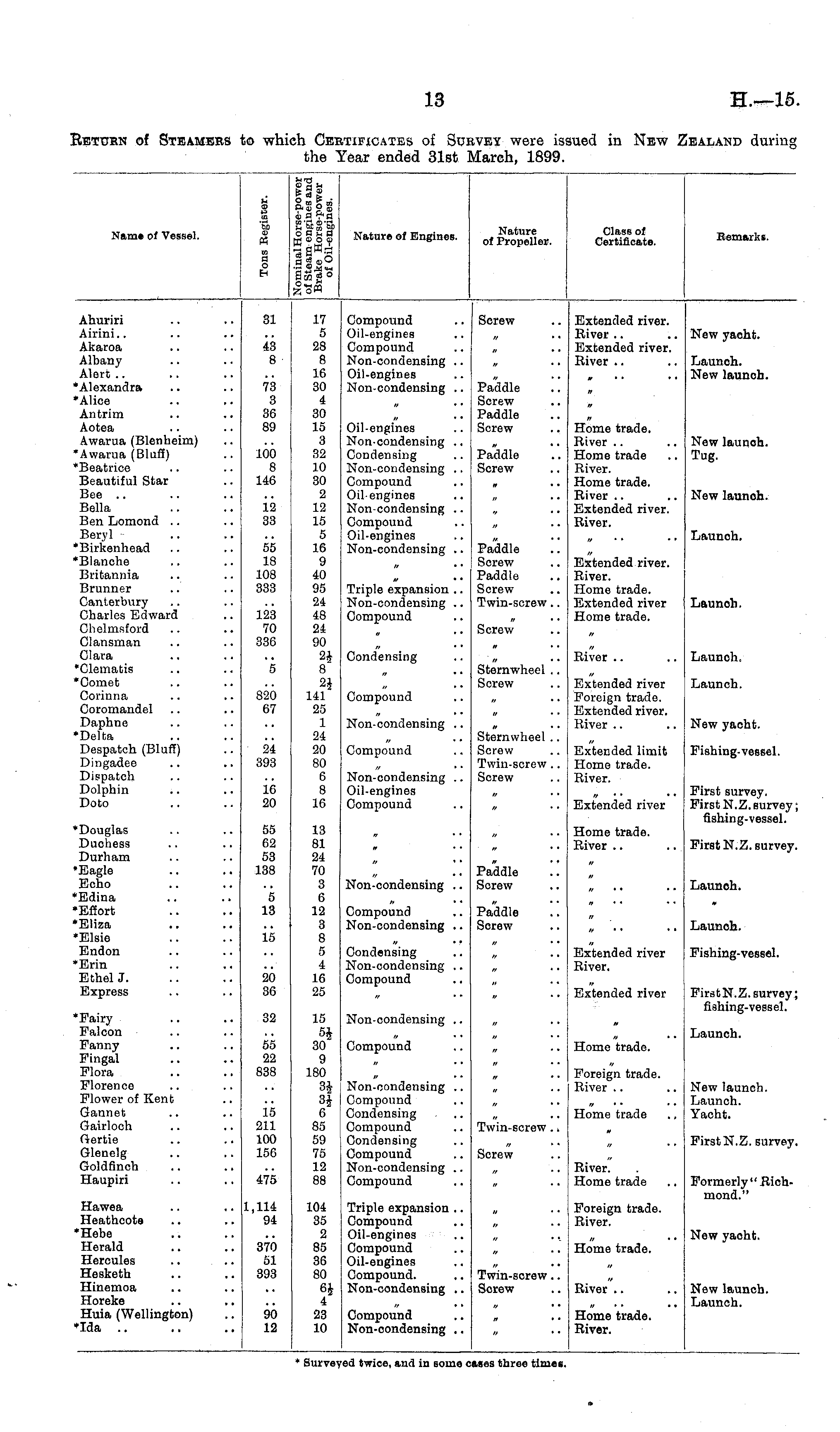 Nam* of Vessel. u to a o Pi HIS w oo<j) dS H 3 ■ss.s2 S£g° Nature of Engines. Nature of Propeller. Class of Certificate. Remarks. Ahuriri Airini.. Akaroa Albany Alert.. •Alexandra •Alice Antrim Aotea Awarua (Blenheim) •Awarua (Bluff) •Beatrice Beautiful Star Bee Bella Ben Lomond .. Beryl 'Birkenhead •Blanche Britannia Brunner Canterbury Charles Edward Chelmsford Clansman Clara •Clematis * Comet Corinna Coromandel Daphne •Delta Despatch (Bluff) Dingadee Dispatch Dolphin Doto 31 43 8 73 3 36 89 100 8 146 12 33 55 18 108 333 17 5 28 8 16 30 4 30 15 3 32 10 30 2 12 15 5 16 9 40 95 24 48 24 90 H 8 2J 141 25 1 24 20 80 6 8 16 Compound Oil-engines Compound Non-condensing .. Oil-engines Non-condensing .. Oil-engines Non-condensing .. Condensing Non-condensing .. Compound Oilengines Non-condensing .. Compound Oil-engines Non-condensing .. Screw Paddle ! '. Screw Paddle Screw Paddle Screw Paddle Screw Paddle Screw Twin-screw.. Extended river. River Extended river. River Home trade. River Home trade River. Home trade. River Extended river. River. Extended river. River. Home trade. Extended river Home trade. New yaoht. Launch. New launch. New launch. Tug. New launch. Launch. 123 70 336 Triple expansion .. Non-condensing .. Compound Launch. Screw Condensing River Launoh. 5 Sternwheel .. Screw Extended river Foreign trade. Extended river. River Launch. 820 67 Compound Non-condensing .. Sternwheel .. Screw Twin-screw .. Screw New yaeht. 24 393 Compound Extended limit Home trade. River. Fishing-vessel. 16 20 Non-condensing .. Oil-engines Compound Extended river First survey. First N.Z. survey; fishing-vessel. •Douglas Duchess Durham •Eagle Echo •Edina •Effort •Eliza •Elsie Endon •Erin Ethel J. Express 55 62 53 138 5 13 13 81 24 70 3 6 12 3 8 5 4 16 25 Non-condensing .. Compound Non-condensing .. Paddle 1 '. Screw Paddle ! '. Screw Home trade. River First N.Z. survey. Launoh. ft 15 Launoh. 20 36 Condensing Non-condensing .. Compound Extended river River. Fishing-vessel. Extended river FirstN.Z. survey; fishing-vessel. •Fairy Falcon Fanny Fingal Flora Florence Flower of Kent Gannet Gairloch Gertie Glenelg Goldfinch Haupiri 32 55 22 838 15 211 100 156 15 5J 30 9 180 8* 3* 6 85 59 75 12 88 Non-condensing .. Compound Non-condensing .. Compound Condensing Compound Condensing Compound Non-condensing .. Compound Home trade. Foreign trade. River Home trade Launch. New launch. Launch. Yacht. Twin-screw .. Screw First N.Z. survey. 475 River. Home trade Formerly " .Richmond." Hawea Heathcote •Hebe Herald Hercules Heaketh Hinemoa Horeke Huia (Wellington) •Ida 1,114 94 370 51 393 104 35 2 85 36 80 6i 4 23 10 Triple expansion .. Compound Oil-engines Compound Oil-engines Compound. Non-condensing .. Twin-screw.. Screw Foreign trade. River. Home trade. New yaoht. River New launch. Launch. 90 12 Compound Non-condensing .. Home trade. River. ♦ Surve , red twice, and in some cases three times.