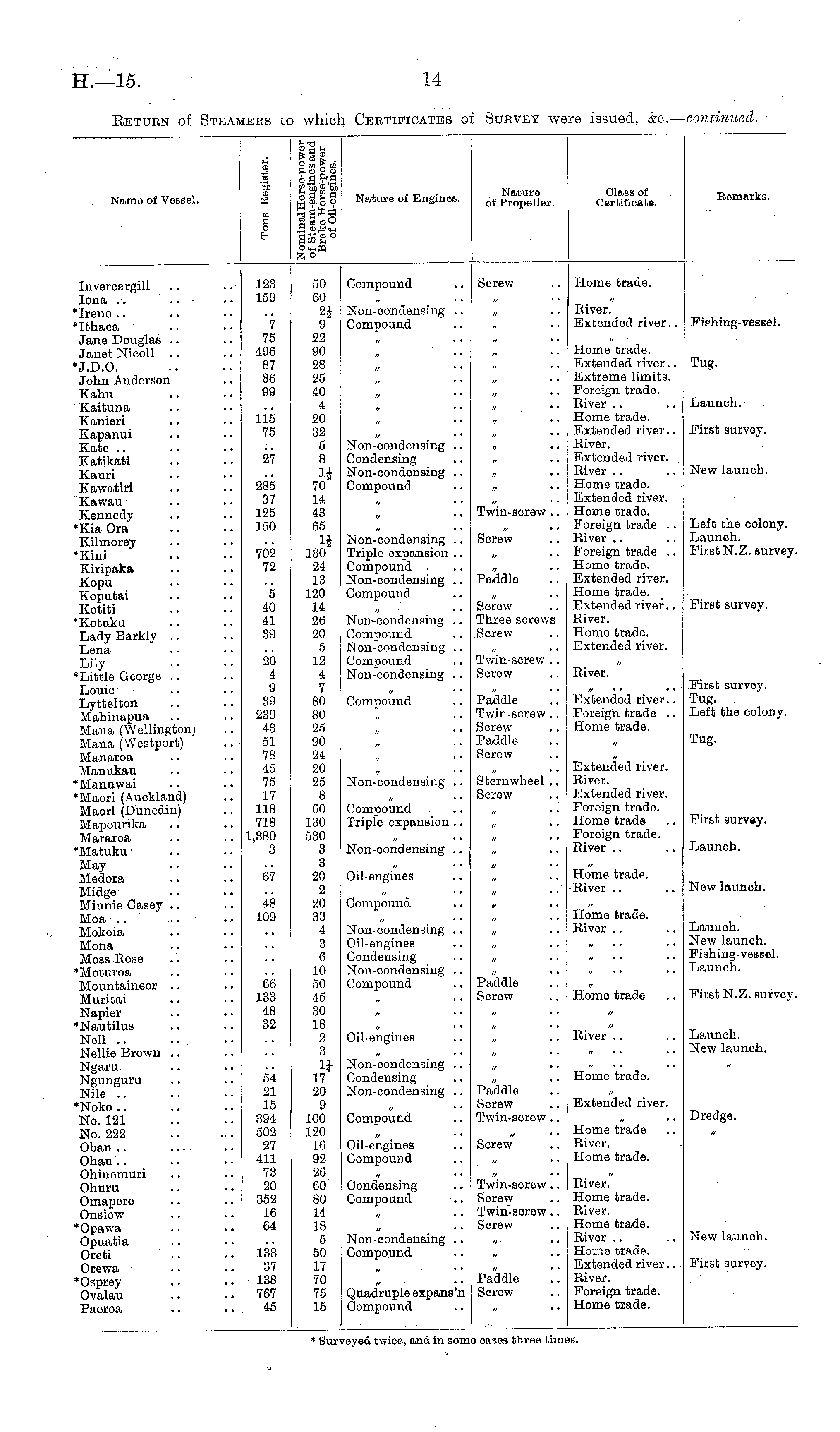 Name of Vessel. i o M PiO m g cc III! ■Up |3 B Nature of Engines. Nature o( Propeller. Class of Certificate. Bcmarks. g Invercargill Iona "Irene "Ithaca Jane Douglas .. Janet Nicoll .. "J.D.O. John Anderson Kahu Kaituna Kanieri Kapanui Kate .. Katikati Kauri Kawatiri Kawau Kennedy •Kia Ora Kilmorey *Kini Kiripaka Kopu Koputai Kotiti •Kotuku Lady Barkly .. Lena Lily ♦Little George .. Louie Lyttelton Mahinapua Mana (Wellington) Mana (Westport) Manaroa Manukau 'Manuwai * Maori (Auckland) Maori (Dunedin) Mapourika Mararoa *Matuku May Medora Midge Minnie Casey .. Moa Mokoia Mona Moss Rose *Moturoa Mountaineer .. Muritai Napier ♦Nautilus Nell .. Nellie Brown .. Ngaru Ngunguru Nile .. *Noko No. 121 No. 222 Oban .. .. Ohau Ohinemuri Ohuru Omapere Onslow *Opawa Opuatia Oreti Orewa "Osprey Ovalau Paeroa 123 159 7 75 496 87 36 99 115 75 27 285 37 125 150 702 72 5 40 41 39 20 4 9 39 239 43 51 78 45 75 17 118 718 1,380 3 50 Compound 60 2J Non-condensing .. 9 Compound 22 90 28 25 40 4 20 ;, 32 5 Non-condensing .. 8 Condensing 1J Non-condensing .. 70 Compound 14 43 65 1J Non-condensing .. 130 Triple expansion .. 24 Compound 13 Non-condensing .. 120 Compound 14 26 Non-condensing .. 20 Compound 5 Non-condensing .. 12 Compound 4 Non-condensing .. 7 80 Compound 80 25 90 24 20 25 Non-condensing .. 8 60 Compound 130 Triple expansion .. 530 3 Non-condensing .. 3 20 Oil-engines 2 20 Compound 33 4 Non-condensing .. 3 Oil-engines 6 Condensing 10 Non-condensing .. 50 Compound 45 30 18 2 Oil-engines 3 1J Non-condensing .. 17 Condensing 20 Non-condensing .. 9 100 Compound 120 16 Oil-engines 92 Compound 26 60 Condensing 80 Compound 14 18 5 Non-condensing .. . 50 Compound 17 70 75 Quadruple expans'n 15 Compound Screw Twin-screw .. Screw Paddle Screw Three screws Screw Twin-screw .. Screw Paddle Twin-screw .. Screw Paddle Screw Sternwheel .. Screw Home trade. River. Extended river.. Home trade. Extended river.. Extreme limits. Foreign trade. River Home trade. Extended river.. River. Extended river. River Home trade. Extended river. Home trade. Foreign trade .. River Foreign trade .. Home trade. Extended river. Home trade. Extended river.. River. Home trade. Extended river. River. Extended river.. Foreign trade .. Home trade. Extended river. River. Extended river. Foreign trade. Home trade Foreign trade. River Fishing-vessel. Tug. Launch. First survey. New launch. Left the colony. Launch. First N.Z. survey. First survey. First survey. Tug. Left the colony. Tug. First survey. Launch. 67 Home trade. ■River New launch. 48 109 Home trade. River Launch. New launch. Fishing-vessel. Launch. 66 133 48 32 Paddle Screw Home trade First N.Z. survey. River Launch. New launch. 54 21 15 394 502 27 411 73 20 352 16 64 Paddle Screw Twin-screw.. Screw Home trade. Extended river. Home trade River. Home trade. Dredge. 138 37 138 767 45 Twin-screw.. Screw Twin-screw.. Screw River. Home trade. River. Home trade. River .. Home trade. Extended river.. River. Foreign trade. Home trade. New launch. Paddle Screw : .. First survey. * Survo; r ed twice, and in some cases three times.