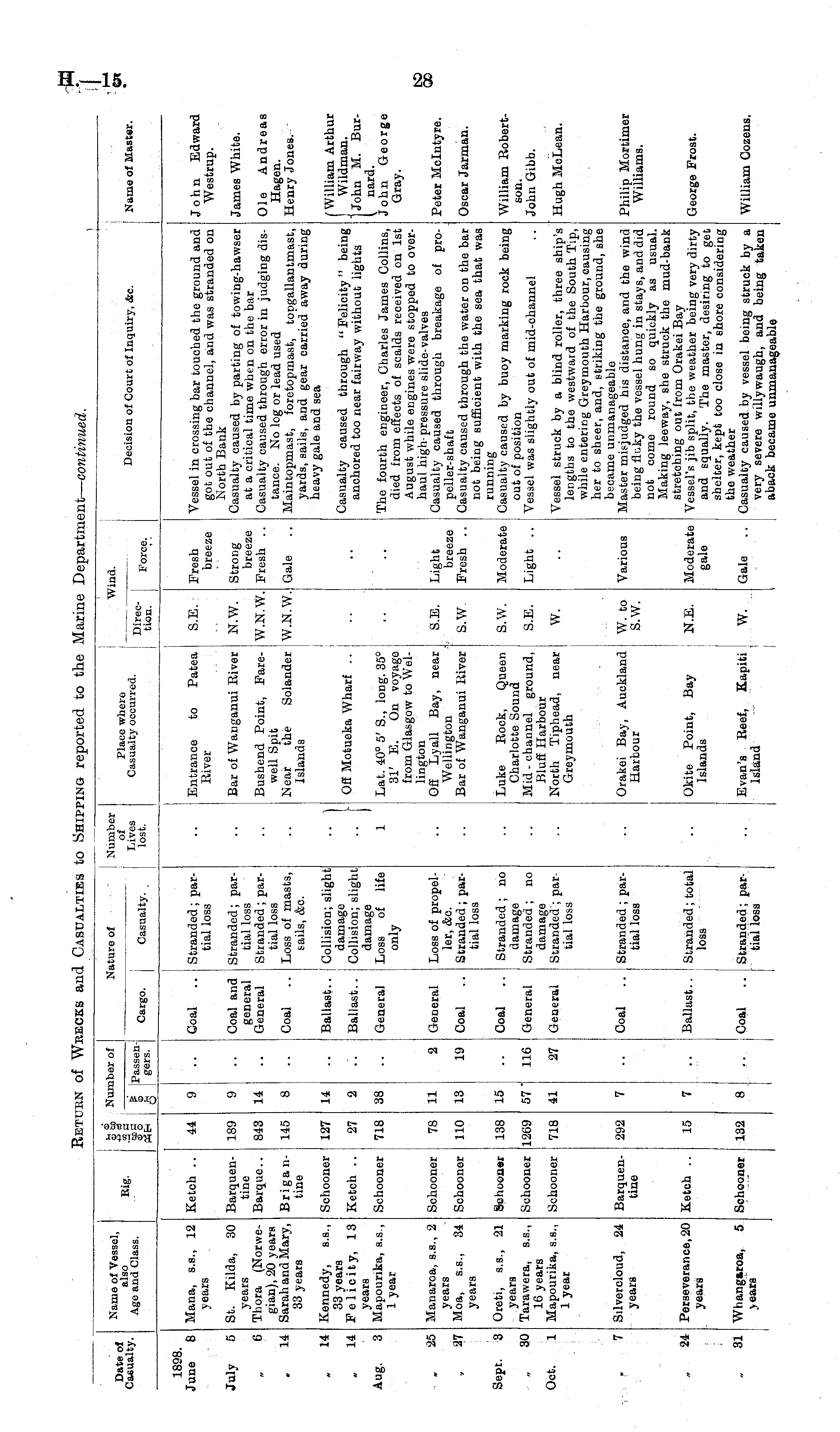 Date of Name of Vessel, Casualty. Age a a n T class . Ri, I; Si Number of Nature of Number of Lives lost. Place where Casualty occurred. Direction. ind. Decision of Court of Inquiry, &c. Name of Master. 'IS I Passenu gers. Cargo. Casualty. Force. 1898. June 8 Mana, s.s., 12 years Ketch .. 44 Goal .. Stranded; partial loss Entrance to Patea River S.E. ; Fresh breeze Vessel in crossing bar touched the ground and got out of the channel, and was stranded on North Bank Casualty caused by parting of towing-hawser at a critical time when on the bar Casualty caused through error in judging distance. No log or lead used Maintopmast, foretopmast, topgallantmast, yards, sails, and gear carried away during heavy gale and sea John Edward Westrup. July 5 St. Kilda, 30 years Thora (Norwegian), 20 years Sarah and Mary, 33 years Barquentine 189 9 Goal and general General Stranded; partial loss Stranded; partial loss Loss of masts, tails, &o. Bar of Wanganui Eiver N.W. Strong breeze Fresh .. James White. 6 14 Barque.. Briga ntine 843 145 14 8 Coal .. Bushend Point, Farewell Spit Near the Solander Islands W.N.W. W.N.W. Gale .. Ole Andreas Hagen. Henry Jones. 14 Kennedy, s.s., 33 years Felicity, 13 years Mapourika, s.s., 1 year Schooner 127 14 Ballast.. Collision; slight damage Collision; slight damage Loss of life only - ) (■William Arthur Wildman. Ijohn M. Bur- \ nard. John George Gray. „ 14 Ketch .. 27 2 Ballast.. Off Motueka Wharf .. Casualty caused through "Felicity" being anchored too near fairway without lights Aug. 3 . 25 Manaroa, s.s., 2 years Moa, s.s., 34 years Schooner Schooner 718 33 General General Loss of propeller, &o. Stranded; partial loss 1 Lat. 40° 5' S., long. 35° 31' B. On voyage from Glasgow to Wellington Off Lyall Bay, near Wellington Bar of Wanganui Kiver S.E. The fourth engineer, Charles James Collins, died from effects of scalds received on 1st August while engines were stopped to overhaul high pressure slide-valves Casualty caused through breakage of pro-peller-shaft Casualty caused through the water on the bar not being sufficient with the sea that was running Casualty caused by buoy marking rock being out of position Vessel was slightly out of mid-channel Peter Mclntyre. 27 Schooner 78 110 11 13 2 19 Coal S.W. Light breeze Fresh .. Oscar Jarman. Sept. 3 Oreti, s.s., 21 years Tarawera, s.s., 16 years Mapourika, s.s., 1 year Schooner 138 Coal .. Stranded ; no damage Stranded; no damage Stranded ; partial loss Luke Bock, Queen Charlotte Sound Mid - channel ground, Bluff Harbour North Tiphead, near Greymouth s.w. Moderate William Eobertson. John Gibb. 15 i 30 Schooner 1269 571 116 General S.E. Light .. Oct. 1 Schooner 718 41 27 General W. Vessel struck by a blind roller, three ship's lengths to the westward of the South Tip, while entering Greymouth Harbour, causing her to sheer, and, striking the ground, she became unmanageable Master misjudged his distance, and the wind being fluky the vessel hung in stays, and did not come round so quickly as usual. Making leeway, she struck the mud-bank stretching out from Orakei Bay Vessel's jib split, the weather being very dirty and squally. The master, desiring to get shelter, kept too close in shore considering the weather Casualty caused by vessel being struck by a very severe willywaugh, and being taken aback became unmanageable Hugh McLean. 7 Silveroloud, 24 years Barquentine 292 Coal .. Stranded ; partial loss ,..,.. Orakei Bay, Auckland Harbour W. to S.W. Various Philip Mortimer Williams. 24 Perseverance, 20 years Ketch .. Ballast.. Stranded; total loss Okite Point, Bay Islands N.E. Moderate gale George Frost. 15 „ 31 Whangaroa, 5 >ears Schooner Coal Stranded; partial loss Evan's Beef, Kiipiti Island w. Gale .. William Cozens. 132 8