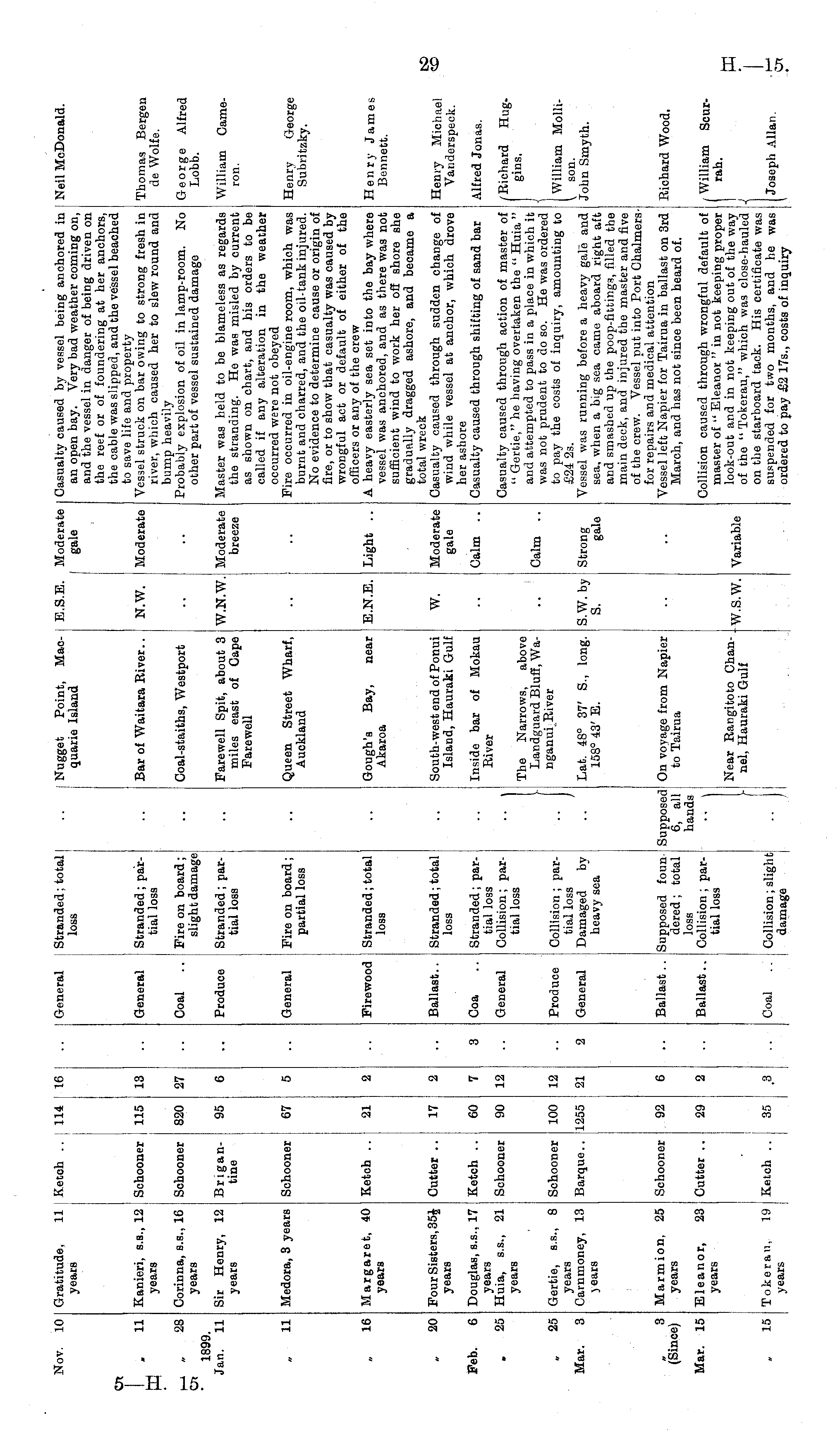 Nov. 10 Gratitude, 11 years Ketch .. 114 16 General Stranded; total loss Nugget Point, Macquarie Island E.S.E. Moderate gale Casualty caused by vessel being anchored in an open bay. Very bad weather coming on, and the vessel in danger of being driven on the reef or of foundering at her anchors, the cable was slipped, and the vessel beached to save life and property Vessel struck on bar owing to strong fresh in river, which caused her to slew round and bump heavily Probably explosion of oil in lamp-room. No other part of vessel sustained damage Neil McDonald. Kanieri, s.s., 12 years Schooner Stranded; partial loss Bar of Waitara River.. Moderate Thomas Bergen de Wolfe. 11 115 13 General N.W. I . „ 28 Comma, s.s., 16 years Schooner 820 27 Coal .. Fire on board; slight damage Coal-staiths, Westport George Alfred Lobb. 1899. Jan. 11 Sir Henry, 12 Brigantine 95 Produce Stranded; partial loss Farewell Spit, about 3 miles east of Cape Farewell W.N.W. Moderate breeze Master was held to be blameless as regards the stranding. He was misled by current as shown on chart, and his orders to be called if any alteration in the weather occurred were not obeyed Fire occurred in oil-engine room, which was burnt and charred, and the oil-tank injured. No evidence to determine cause or origin of fire, or to show that casualty was caused by wrongful act or default of either of the officers or any of the crew A heavy easterly sea set into the bay where vessel was anchored, and as there was not sufficient wind to work her off shore she gradually dragged ashore, and became a total wreck Casualty caused through sudden change of wind while vessel at anchor, which drove her ashore Casualty caused through shifting of sand bar William Cameron. years „ 11 Medora, 3 years Schooner General Fire on board; partial loss Queen Street Wharf, Auckland Henry George Subritzky. 67 16 Margaret, 40 years Ketch .. 21 Firewood Stranded; total loss Gough's Bay, near Akaroa E.N.E. Light .. Henry James Bennett. Four Sisters, 35£ years Cutter .. Ballast.. Stranded; total loss South-west end of Ponui Island, Hauraki Gulf Moderate gale Henry Michael Vanderspeck. 20 17 W. Feb. 6 Douglas, s.s., 17 years Huia, s.s., 21 years Ketch .. 60 7 3 Coa Stranded; partial loss Collision; partial loss Inside bar of Mokau River Calm .. Alfred Jonas. m 25 Schooner 90 12 General The Narrows, above Landguard Bluff, Wanganui River Calm .. Casualty caused through action of master of " Gertie," he having overtaken the " Huia " and attempted to pass in a place in which it was not prudent to do so. He was ordered to pay the costs of inquiry, amounting to £24 2s. Vessel was running before a heavy gale and sea, when a big sea came aboard right aft and smashed up the poop-fittings, filled the main deck, and injured the master and five of the crew. Vessel put into Port Chalmers for repairs and medical attention Vessel left Napier for Tairua in ballast on 3rd March, and has not since been heard of. Richard Huggins. William Mollison. John Smyth. 25 Gertie, s.s., 8 years Carnmoney, 13 Schooner Produce Collision ; partial loss Damaged by heavy sea 100 12 Mar. 3 Barque.. 1255 21 2 General Lat. 48° 37' S., long. 158° 43' E. S.W. by S. Strong gale years 3 (Since) Marmion, 25 years Schooner 92 Ballast.. Supposed foun dered ; total loss Collision ; partial loss Supposed 6, all hands On voyage from Napier to Tairua Richard Wood. Mar. 15 Eleanor, 23 years Cutter .. 29 Ballast.. •• \ Collision caused through wrongful default of master of " Eleanor " in not keeping proper look-out and in not keeping out of the way of the " Tokerau," which was close-hauled on the starboard tack. His certificate was suspended for two months, and he was ordered to pay £2 17s., costs of inquiry / William Scurrah. J . 15 Coal .. Near Rangitoto Channel, Hauraki Gulf w.s.w. Variable Tokerau, 19 years Ketch .. 35 .3 Collision; slight damage Joseph Allan.