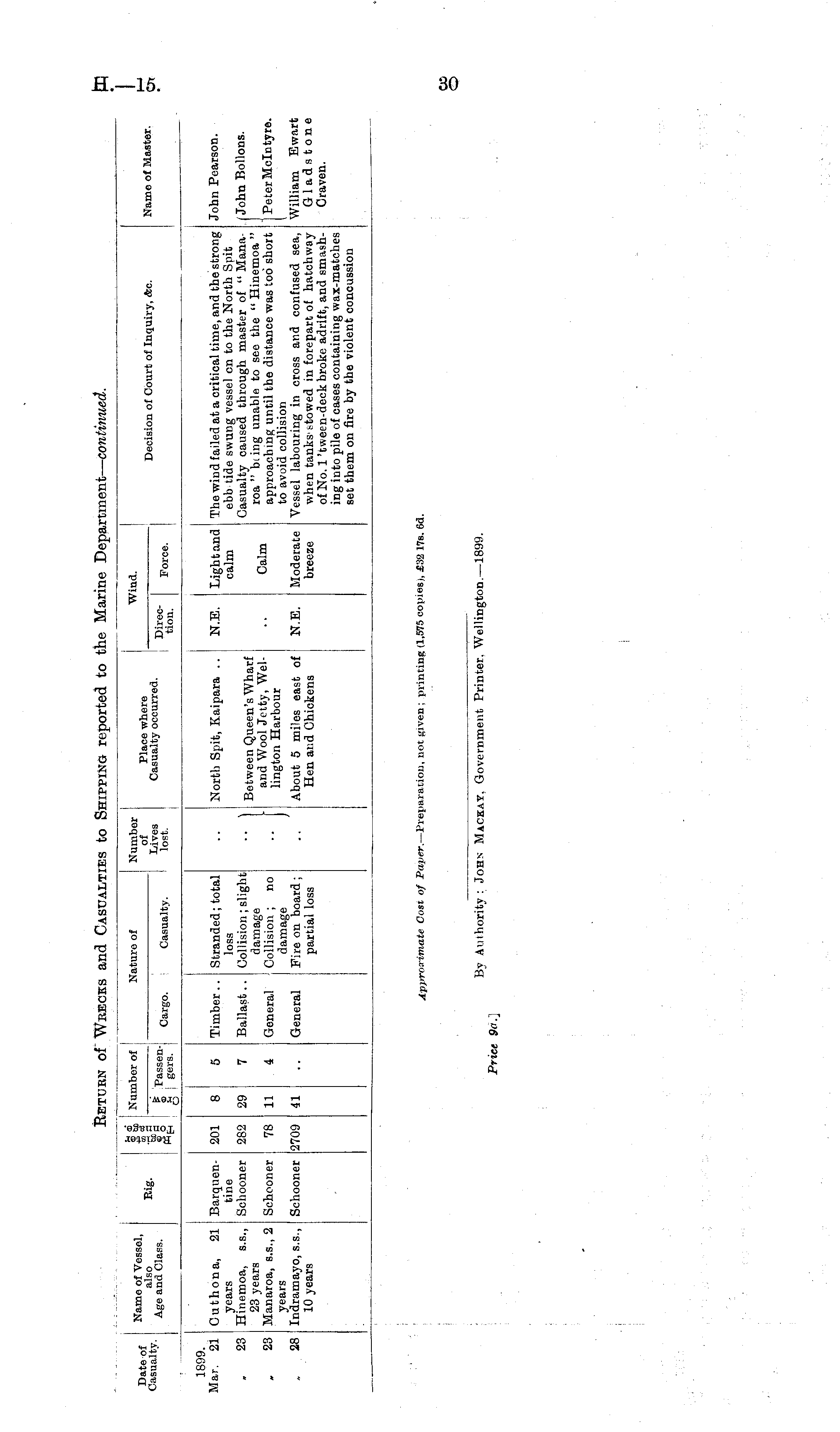 Date of Casualty. Name of Vessel, also Age and Class. Eig. Number of Nature of Number of Lives lost. Place where Casualty occurred. Direction. Wind. Name of Master. Decision of Court of Inquiry, (tec. n § Passeng J gers. Cargo. Casualty. Force. 1899. Mar. 21 Cuthona, 21 Barquentine Schooner 201 8 5 Timber .. Stranded; total loss Collision; slight damage Collision ; no damage Fire on board; partial loss North Spit, Kaipara .. N.E. Light and calm The wind failed at a critical time, and the strong ebb tide swung vessel on to the North Spit Casualty caused through master of " Manaroa " bsing unable to see the " Hinemoa " approaching until the distance was too short to avoid collision Vessel labouring in cross and confused sea, when tanks 1 ttowed in forepart of hatchway of No. 1 'tween-deck broke adrift, and smashing into pile of cases containing wax-matches set them on fire by the violent concussion John Pearson. . 23 23 years Hinemoa, s.s., 23 years Manaroa, s.s., 2 years Indramayo, s.s., 10 years Schooner 282 78 29 11 7 4 Ballast.. Genera] ") Between Queen's Wharf and Wool Jetty, Wellington Harbour Calm John Bollons. PeterMcIntyre. William Bwart Gladstone Craven. 28 Schooner 2709 41 General About 5 miles east of Hen and Chickens N.E. Moderate breeze Approximate Cost of Paper.— Preparation, not given ; printing (1,575 copies), £32 17s. 6d. By Authority : John Mackay, Government Printer. Wellington. —1899. Price 9ct.t