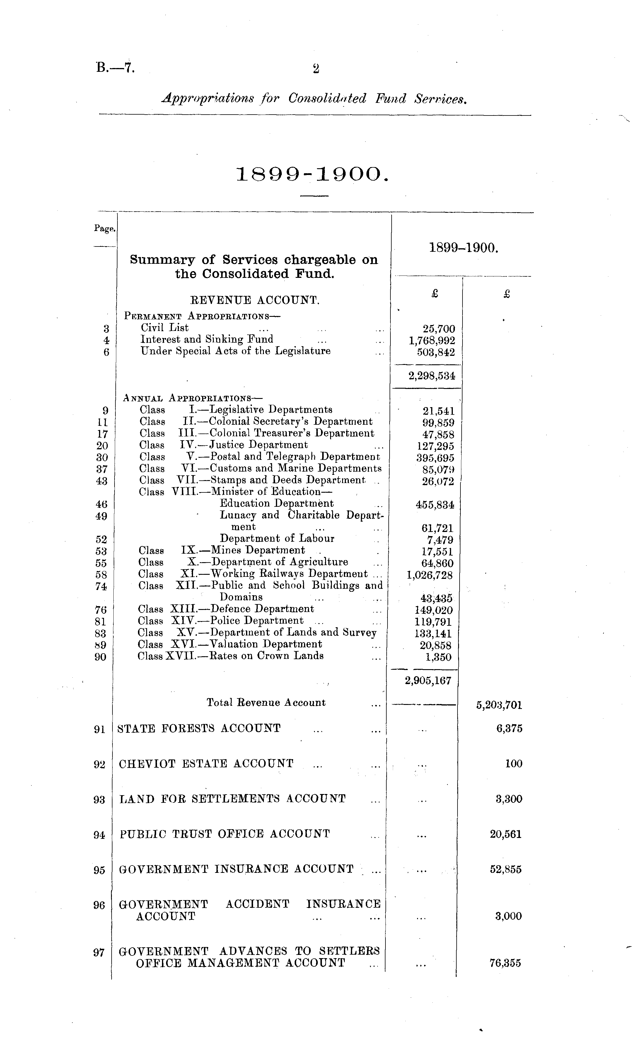 Page. 1899-1900. Summary of Services chargeable on the Consolidated Fund. EEVENUE ACCOUNT. £ £ 3 4 6 Permanent Appropriations— Civil List Interest and Sinking Fund Under Special Acts of the Legislature 25,700 1,768,992 503,842 2,298,534 9 11 17 20 30 37 43 46 49 52 53 55 58 74 Annual Appropriations— Class I. —Legislative Departments Class II. —Colonial Secretary's Department Class TIL —Colonial Treasurer's Department Class IV.—Justice Department Class V. —Postal and Telegraph Department Class VI. —Customs and Marine Departments Class VII. —Stamps and Deeds Department Class VIIL —Minister of EducationEducation Department Lunacy and Charitable Department Department of Labour Class IX.—Mines Department Class X.—Department of Agriculture Class XL —Working Bailways Department ... Class XII. —Public and School Buildings and Domains Class XIII. —Defence Department Class XIV.—Police Department ... Class XV.—Department of Lands and Survey Class XVI.—Valuation Department Class XVII. —Bates on Crown Lands 21,541 99,859 47,858 127,295 395,695 85,079 26,072 455,834 61,721 7,479 17,551 64,860 1,026,728 76 81 83 *9 90 43,435 149,020 119,791 133,141 20,858 1,350 2,905,167 Total Eevenue Account 5,203,701 91 STATE FOEESTS ACCOUNT 6,375 92 CHEVIOT ESTATE ACCOUNT 100 93 LAND FOE SETTLEMENTS ACCOUNT 3,300 94 PUBLIC TBUST OFFICE ACCOUNT 20,561 95 GOVEBNMENT INSUEANCE ACCOUNT ... 52,855 96 GOVEBNMENT ACCIDENT INSUEANCE ACCOUNT 3,000 97 GOVEBNMENT ADVANCES TO SETTLEES OFFICE MANAGEMENT ACCOUNT 76,355