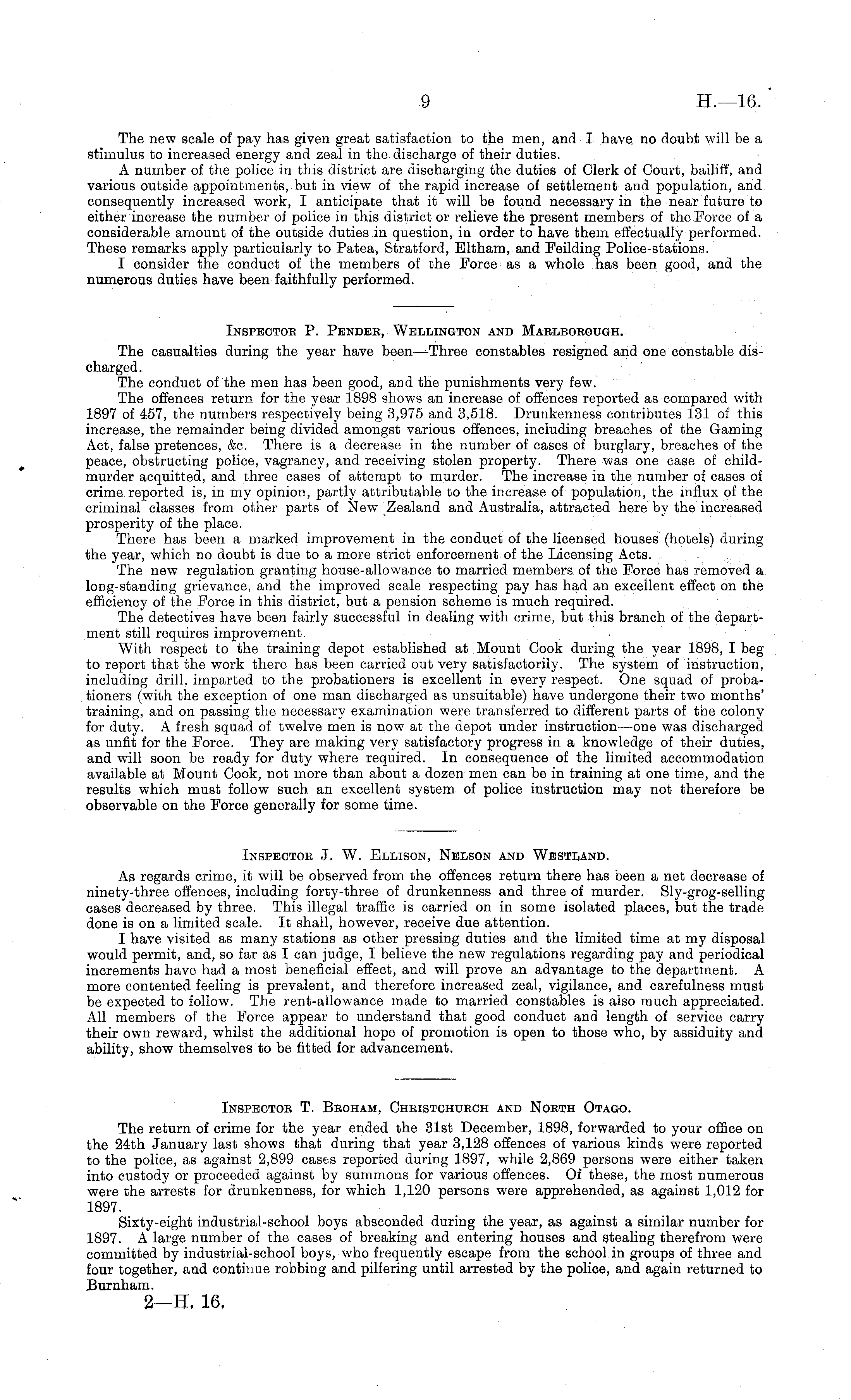 Inspectob P. Pendee, Wellington and Maelbobough. The casualties during the year have been—Three constables resigned and one constable discharged. The conduct of the men has been good, and the punishments very few. The offences return for the year 1898 shows an increase of offences reported as compared with 1897 of 457, the numbers respectively being 3,975 and 3,518. Drunkenness contributes 131 of this increase, the remainder being divided amongst various offences, including breaches of the Gaming Act, false pretences, &c. There is a decrease in the number of cases of burglary, breaches of the peace, obstructing police, vagrancy, and receiving stolen property. There was one case of childmurder acquitted, and three cases of attempt to murder. The increase in the number of cases of crime reported is, in my opinion, partly attributable to the increase of population, the influx of the criminal classes from other parts of New Zealand and Australia, attracted here by the increased prosperity of the place. There has been a marked improvement in the conduct of the licensed houses (hotels) during the year, which no doubt is due to a more strict enforcement of the Licensing Acts. The new regulation granting house-allowance to married members of the Force has removed a long-standing grievance, and the improved scale respecting pay has had an excellent effect on the efficiency of the Force in this district, but a pension scheme is much required. The detectives have been fairly successful in dealing with crime, but this branch of the department still requires improvement. With respect to the training depot established at Mount Cook during the year 1898, I beg to report that the work there has been carried out very satisfactorily. The system of instruction, including drill, imparted to the probationers is excellent in every respect. One squad of probationers (with the exception of one man discharged as unsuitable) have undergone their two months' training, and on passing the necessary examination were transferred to different parts of the colony for duty. A fresh squad of twelve men is now at the depot under instruction—one was discharged as unfit for the Force. They are making very satisfactory progress in a knowledge of their duties, and will soon be ready for duty where required. In consequence of the limited accommodation available at Mount Cook, not more than about a dozen men can be in training at one time, and the results which must follow such an excellent system of police instruction may not therefore be observable on the Force generally for some time.