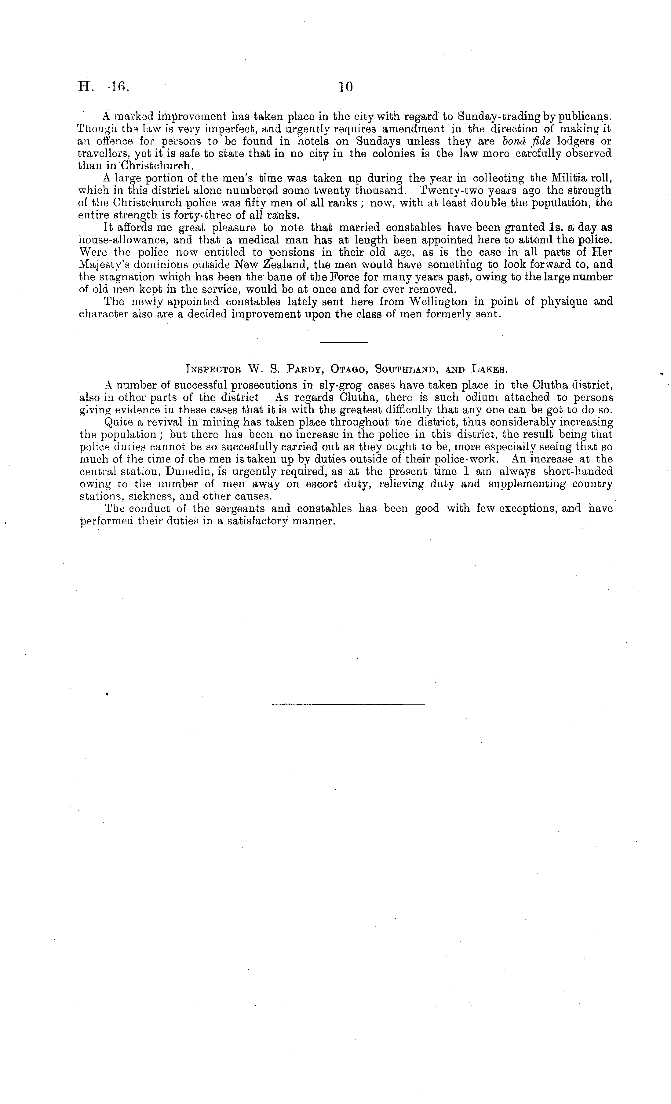 A marked improvement has taken place in the city with regard to Sunday-trading by publicans. Though the law is very imperfect, and urgently requires amendment in the direction of making it an offence for persons to be found in hotels on Sundays unless they are bond fide lodgers or travellers, yet it is safe to state that in no city in the colonies is the law more carefully observed than in Christchurch. A large portion of the men's time was taken up during the year in collecting the Militia roll, which in this district alone numbered some twenty thousand. Twenty-two years ago the strength of the Christchurch police was fifty men of all ranks ; now, with at least double the population, the entire strength is forty-three of all ranks. It affords me great pleasure to note that married constables have been granted Is. a day as house-allowance, and that a medical man has at length been appointed here to attend the police. Were the police now entitled to pensions in their old age, as is the case in all parts of Her Majesty's dominions outside New Zealand, the men would have something to look forward to, and the stagnation which has been the bane of the Force for many years past, owing to the large number of old men kept in the service, would be at once and for ever removed. The newly appointed constables lately sent here from Wellington in point of physique and character also are a decided improvement upon the class of men formerly sent.