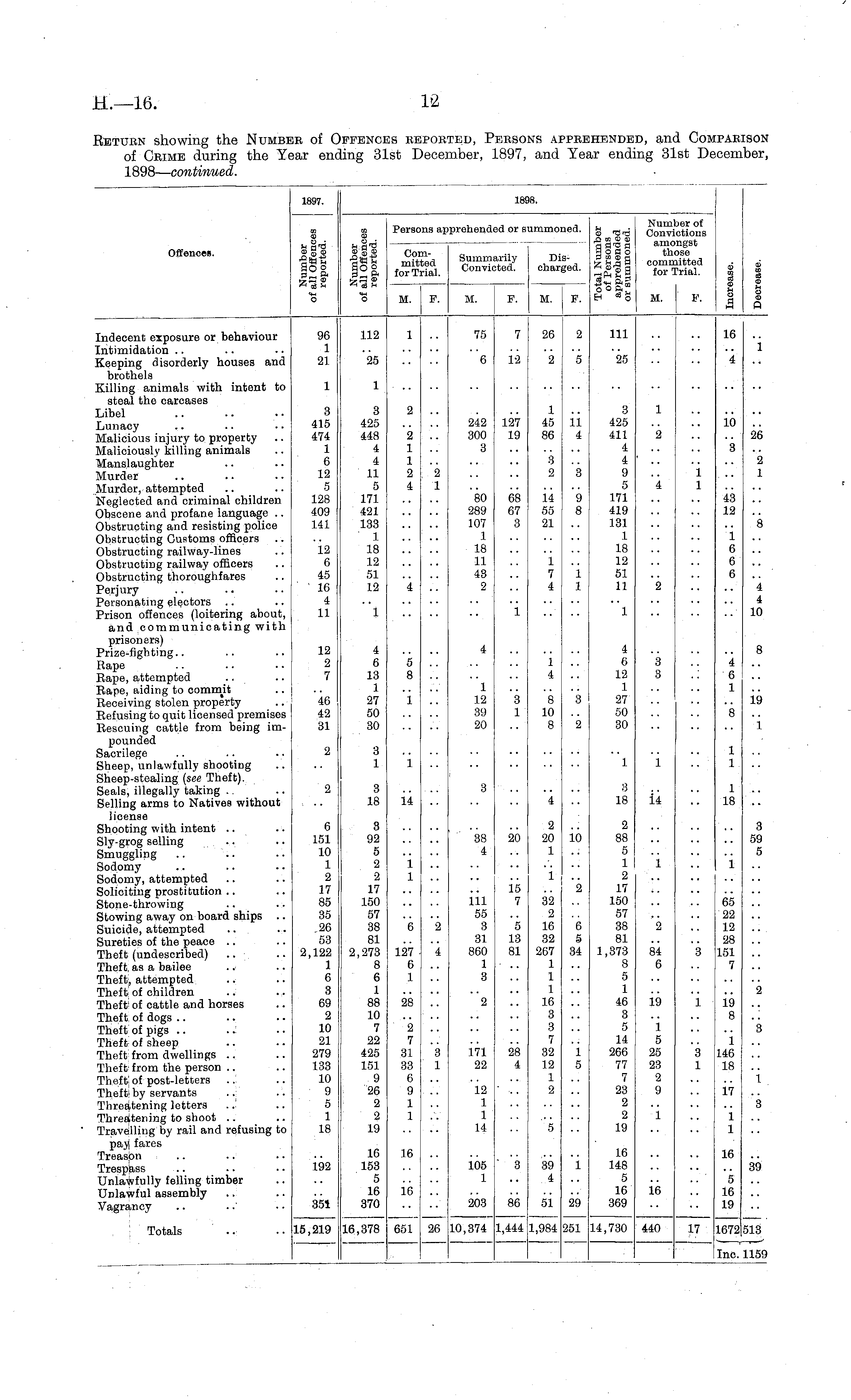 1897. 1898. Offences. m Persons a] Committed for Trial. iprehended or summoned. " _O ffl O <D ag'gg Spa Pig Number of Convictions amongst those committed for Trial. Summarily DisConvicted. charged. 6 I a i I p "o JVI. F. M. F. M. F. M. P. Indecent exposure or behaviour Intimidation Keeping disorderly houses and brothels Killing animals with intent to steal the carcases Libel Lunacy Malicious injury to property Maliciously killing animals Manslaughter Murder Murder, attempted Neglected and criminal children Obscene and profane language .. Obstructing and resisting police Obstructing Customs officers Obstructing railway-lines Obstructing railway officers Obstructing thoroughfares Perjury Personating electors Prison offences (loitering about, and communicating with prisoners) Prize-fighting.. Rape Rape, attempted Rape, aiding to commit Receiving stolen property Eefusing to quit licensed premises Rescuing cattle from being impounded Sacrilege Sheep, unlawfully shooting Sheep-stealing (see Theft). Seals, illegally taking Selling arms to Natives without license Shooting with intent Sly-grog selling Smuggling Sodomy Sodomy, attempted Soliciting prostitution Stone-throwing Stowing away on board ships Suicide, attempted Sureties of the peace Theft (undescribed) Theft as a bailee Theft, attempted Theft' of children Theft of cattle and horses Theft of dogs Theft of pigs Theft of sheep Theft from dwellings Theft from the person Thefti of post-letters ..! Theft: by servants ..: Threatening letters .J Threatening to shoot Travelling by rail and refusing to pay fares Treaspn Trespass Unlawfully felling timber Unlawful assembly Vagrancy 96 1 21 1 3 415 474 1 6 12 5 128 409 141 12 6 45 16 4 11 12 2 7 46 42 31 2 4 6 13 1 27 50 30 3 1 112 25 1 3 425 448 4 4 11 5 171 421 133 1 18 12 51 12 1 5 8 1 1 1 2 2 1 1 2 4 4 2 1 242 300 3 80 289 107 1 18 11 43 2 4 1 12 39 20 75 6 3 1 7 12 127 19 68 67 3 1 1 4 8 10 8 26 2 1 45 80 2 11 55 21 1 7 4 2 5 11 4 3 9 8 1 1 3 2 4 6 12 1 27 50 30 1 3 18 111 '25 3 425 411 4 4 9 5 171 419 131 1 18 12 51 11 1 1 2 4 2 3 3 1 1 1 10 3 43 12 1 6 6 6 4 6 1 8 1 1 16 4 1 26 2 1 8 4 4 10 8 19 1 2 3 18 14 3 4 i4 1 18 6 151 10 1 2 17 85 35 26 53 2,122 1 6 3 69 2 10 21 279 133 10 9 5 1 18 3 92 5 2 2 17 150 57 38 81 2,273 8 6 1 88 10 7 22 425 151 9 26 2 2 19 1 1 6 127 6 1 2 4 38 4 111 55 3 31 860 1 3 20 15 5 13 81 2 20 1 1 32 2 16 32 267 1 1 1 16 3 3 7 32 12 1 2 10 2 6 5 34. 2 88 5 1 2 17 150 57 38 81 1,373 8 5 1 46 3 5 14 266 77 7 23 2 2 19 1 2 84 6 3 1 65 22 12 28 151 7 3 59 5 2 Oft 2 19 1 19 8 2 7 31 33 6 9 1 1 1 5 25 23 2 9 1 146 18 3 3 1 171 22 28 4 1 5 3 1 12 1 1 14 17 1 1 3 5 1 1 192 16 153 5 16 370 16 16 105 1 3 39 4 1 16 148 5 16 369 16 16 5 16 19 39 351 203 86 51 29 Totals 15,219 16,378 651 26 10,374 1,444 1,984 251 14,730 440 17 513 1672 Inc 1159