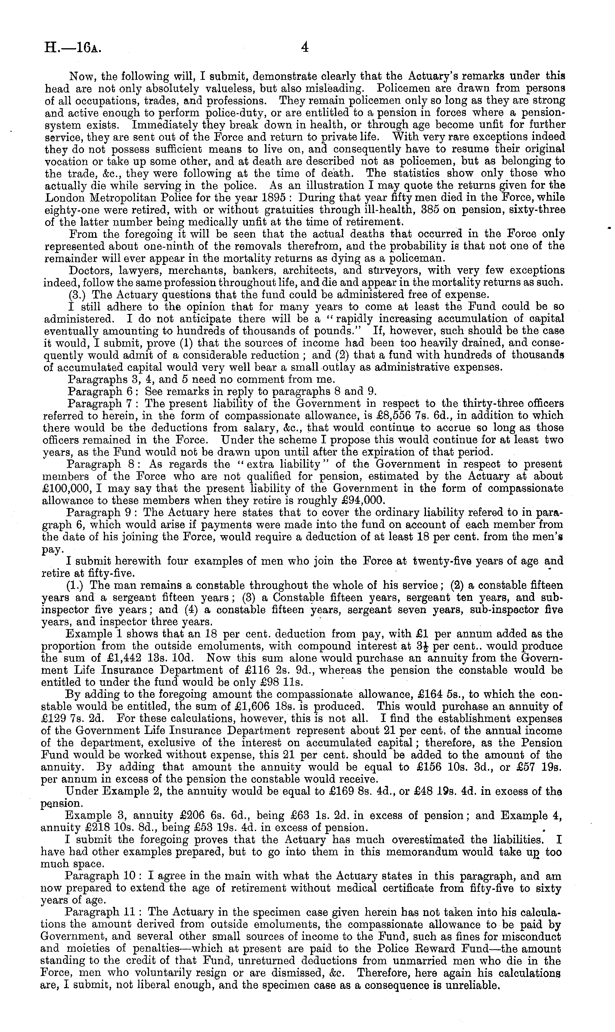 Now, the following will, I submit, demonstrate clearly that the Actuary's remarks under this head are not only absolutely valueless, but also misleading. Policemen are drawn from persons of all occupations, trades, and professions. They remain policemen only so long as they are strong and active enough to perform police-duty, or are entlitled to a pension in forces where a pensionsystem exists. Immediately they break down in health, or through age become unfit for further service, they are sent out of the Force and return to private life. With very rare exceptions indeed they do not possess sufficient means to live on, and consequently have to resume their original vocation or take up some other, and at death are described not as policemen, but as belonging to the trade, &c, they were following at the time of death. The statistics show only those who actually die while serving in the police. As an illustration I may quote the returns given for the London Metropolitan Police for the year 1895 : During that year fifty men died in the Force, while eighty-one were retired, with or without gratuities through ill-health, 385 on pension, sixty-three of the latter number being medically unfit at the time of retirement. From the foregoing it will be seen that the actual deaths that occurred in the Force only represented about one-ninth of the removals therefrom, and the probability is that not one of the remainder will ever appear in the mortality returns as dying as a policeman. Doctors, lawyers, merchants, bankers, architects, and surveyors, with very few exceptions indeed, follow the same profession throughout life, and die and appear in the mortality returns as such. (3.) The Actuary questions that the fund could be administered free of expense. I still adhere to the opinion that for many years to come at least the Fund could be so administered. I do not anticipate there will be a " rapidly increasing accumulation of capital eventually amounting to hundreds of thousands of pounds." If, however, such should be the case it would, I submit, prove (1) that the sources of income had been too heavily drained, and consequently would admit of a considerable reduction ; and (2) that a fund with hundreds of thousands of accumulated capital would very well bear a small outlay as administrative expenses. Paragraphs 3, 4, and 5 need no comment from me. Paragraph 6 : See remarks in reply to paragraphs 8 and 9. Paragraph 7 : The present liability of the Government in respect to the thirty-three officers referred to herein, in the form of compassionate allowance, is £8,556 7s. 6d., in addition to which there would be the deductions from salary, &c, that would continue to accrue so long as those officers remained in the Force. Under the scheme I propose this would continue for at least two years, as the Fund would not be drawn upon until after the expiration of that period. Paragraph 8: As regards the " extra liability" of the Government in respect to present members of the Force who are not qualified for pension, estimated by the Actuary at about £100,000, I may say that the present liability of the Government in the form of compassionate allowance to these members when they retire is roughly £94,000. Paragraph 9 : The Actuary here states that to cover the ordinary liability refered to in paragraph 6, which would arise if payments were made into the fund on account of each member from the date of his joining the Force, would require a deduction of at least 18 per cent, from the men's pay. I submit herewith four examples of men who join the Force at twenty-five years of age and retire at fifty-five. (1.) The man remains a constable throughout the whole of his service; (2) a constable fifteen years and a sergeant fifteen years; (3) a Constable fifteen years, sergeant ten years, and subinspector five years; and (4) a constable fifteen years, sergeant seven years, sub-inspector five years, and inspector three years. Example 1 shows that an 18 per cent, deduction from pay, with £1 per annum added as the proportion from the outside emoluments, with compound interest at 3£ per cent., would produce the sum of £1,442 13s. 10d. Now this sum alone would purchase an annuity from the Government Life Insurance Department of £116 2s. 9d., whereas the pension the constable would be entitled to under the fund would be only £98 11s. By adding to the foregoing amount the compassionate allowance, £164 55., to which the constable would be entitled, the sum of £1,606 18s. is produced. This would purchase an annuity of £129 7s. 2d. For these calculations, however, this is not all. I find the establishment expenses of the Government Life Insurance Department represent about 21 per cent, of the annual income of the department, exclusive of the interest on accumulated capital; therefore, as the Pension Fund would be worked without expense, this 21 per cent, should be added to the amount of the annuity. By adding that amount the annuity would be equal to £156 10s. 3d., or £57 19s. per annum in excess of the pension the constable would receive. Under Example 2, the annuity would be equal to £169 Bs. 4d., or £48 19s. 4d. in excess of the pension. Example 3, annuity £206 6s. 6d., being £63 Is. 2d. in excess of pension; and Example 4, annuity £218 10s. Bd., being £53 19s. 4d. in excess of pension. I submit the foregoing proves that the Actuary has much overestimated the liabilities. I have had other examples prepared, but to go into them in this memorandum would take ug too much space. Paragraph 10 : I agree in the main with what the Actuary states in this paragraph, and am now prepared to extend the age of retirement without medical certificate from fifty-five to sixty years of age. Paragraph 11: The Actuary in the specimen case given herein has not taken into his calculations the amount derived from outside emoluments, the compassionate allowance to be paid by Government, and several other small sources of income to t