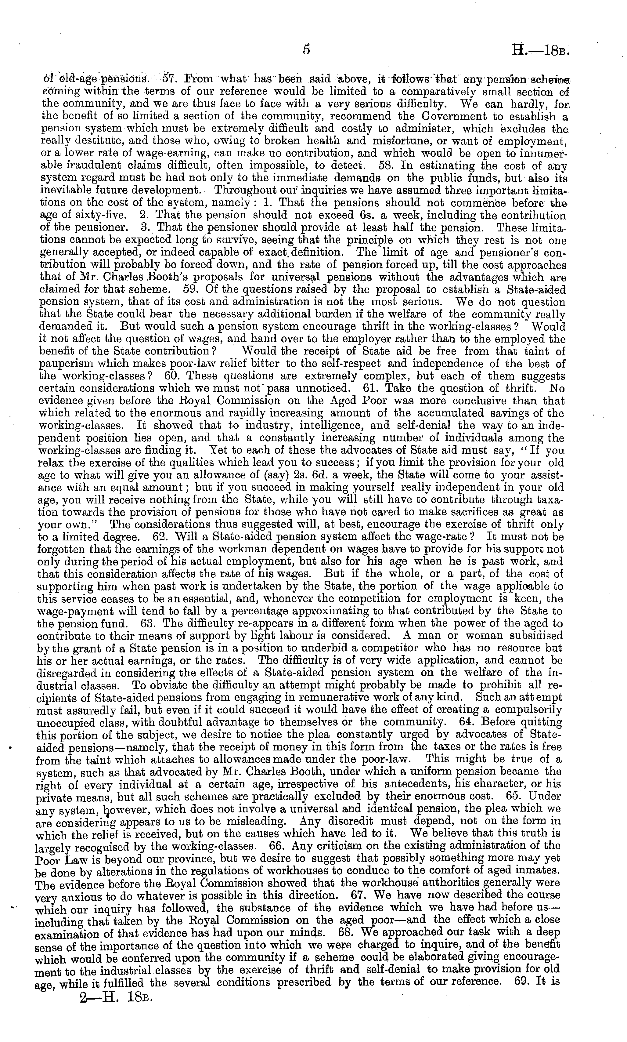 of old-age pensions. 57. From what has been said above, it follows that any pension scheme coming within the terms of our reference would be limited to a comparatively small section of the community, and we are thus face to face with a very serious difficulty. We can hardly, for the benefit of so limited a section of the community, recommend the Government to establish a pension system which must be extremely difficult and costly to administer, which excludes the really destitute, and those who, owing to broken health and misfortune, or want of employment, or a lower rate of wage-earning, can make no contribution, and which would be open to innumerable fraudulent claims difficult, often impossible, to detect. 58. In estimating the cost of any system regard must be had not only to the immediate demands on the public funds, but also its inevitable future development. Throughout our inquiries we have assumed three important limitations on the cost of the system, namely : 1. That the pensions should not commence before the age of sixty-five. 2. That the pension should not exceed 6s. a week, including the contribution of the pensioner. 3. That the pensioner should provide at least half the pension. These limitations cannot be expected long to survive, seeing that the principle on which they rest is not one generally accepted, or indeed capable of exact definition. The limit of age and pensioner's contribution will probably be forced down, and the rate of pension forced up, till the cost approaches that of Mr. Charles Booth's proposals for universal pensions without the advantages which are claimed for that scheme. 59. Of the questions raised by the proposal to establish a State-aided pension system, that of its cost and administration is not the most serious. We do not question that the State could bear the necessary additional burden if the welfare of the community really demanded it. But would such a pension system encourage thrift in the working-classes ? Would it not affect the question of wages, and hand over to the employer rather than to the employed the benefit of the State contribution ? Would the receipt of State aid be free from that taint of pauperism which makes poor-law relief bitter to the self-respect and independence of the best of the working-classes ? 60. These questions are extremely complex, but each of them suggests certain considerations which we must not' pass unnoticed. 61. Take the question of thrift. No evidence given before the Boyal Commission on the Aged Poor was more conclusive than that which related to the enormous and rapidly increasing amount of the accumulated savings of the working-classes. It showed that to industry, intelligence, and self-denial the way to an independent position lies open, and that a constantly increasing number of individuals among the working-classes are finding it. Yet to each of these the advocates of State aid must say, "If you relax the exercise of the qualities which lead you to success; if you limit the provision for your old age to what will give you an allowance of (say) 2s. 6d. a week, the State will come to your assistance with an equal amount; but if you succeed in making yourself really independent in your old age, you will receive nothing from the State, while you will still have to contribute through taxation towards the provision of pensions for those who have not cared to make sacrifices as great as your own." The considerations thus suggested will, at best, encourage the exercise of thrift only to a limited degree. 62. Will a State-aided pension system affect the wage-rate ? It must not be forgotten that the earnings of the workman dependent on wages have to provide for his support not only during the period of his actual employment, but also for his age when he is past work, and that this consideration affects the rate of his wages. But if the whole, or a part, of the cost of supporting him when past work is undertaken by the State, the portion of the wage applicable to this service ceases to be an essential, and, whenever the competition for employment is keen, the wage-payment will tend to fall by a percentage approximating to that contributed by the State to the pension fund. 63. The difficulty re-appears in a different form when the power of the aged to contribute to their means of support by light labour is considered. A man or woman subsidised by the grant of a State pension is in a position to underbid a competitor who has no resource but his or her actual earnings, or the rates. The difficulty is of very wide application, and cannot be disregarded in considering the effects of a State-aided pension system on the welfare of the industrial classes. To obviate the difficulty an attempt might probably be made to prohibit all recipients of State-aided pensions from engaging in remunerative work of any kind. Such an attempt must assuredly fail, but even if it could succeed it would have the effect of creating a compulsorily unoccupied class, with doubtful advantage to themselves or the community. 64. Before quitting this portion of the subject, we desire to notice the plea constantly urged by advocates of Stateaided pensions—namely, that the receipt of money in this form from the taxes or the rates is free from the taint which attaches to allowances made under the poor-law. This might be true of a system, such as that advocated by Mr. Charles Booth, under which a uniform pension became the right of every individual at a certain age, irrespective of his antecedents, his character, or his private means, but all such schemes are practically excluded by their enormous cost. 65. Under any system, however, which does not involve a universal and identical pension, the plea which we are considering appears to us to be misleading. Any discredit must depend, not on the form in which the relief is received, but on the causes which have led to it. We believe that this truth is largely recognised by the working-classes. 66. A