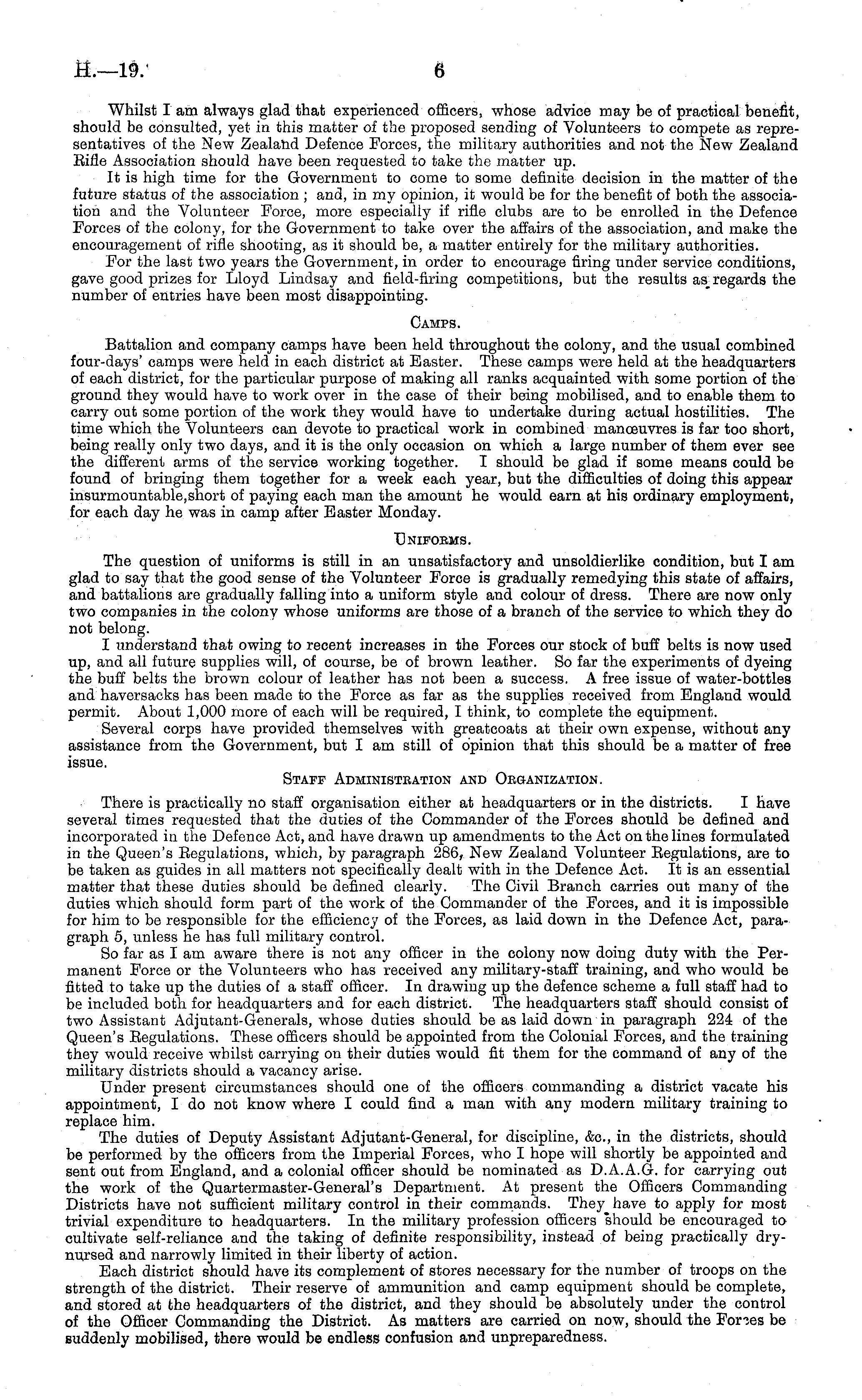 Whilst I am always glad that experienced officers, whose advice may be of practical benefit, should be consulted, yet in this matter of the proposed sending of Volunteers to compete as representatives of the New Zealand Defence Forces, the military authorities and not the New Zealand Eifle Association should have been requested to take the matter up. It is high time for the Government to come to some definite decision in the matter of the future status of the association ; and, in my opinion, it would be for the benefit of both the association and the Volunteer Force, more especially if rifle clubs are to be enrolled in the Defence Forces of the colony, for the Government to take over the affairs of the association, and make the encouragement of rifle shooting, as it should be, a matter entirely for the military authorities. For the last two years the Government, in order to encourage firing under service conditions, gave good prizes for Lloyd Lindsay and field-firing competitions, but the results as_ regards the number of entries have been most disappointing. Camps. Battalion and company camps have been held throughout the colony, and the usual combined four-days' camps were held in each district at Easter. These camps were held at the headquarters of each district, for the particular purpose of making all ranks acquainted with some portion of the ground they would have to work over in the case of their being mobilised, and to enable them to carry out some portion of the work they would have to undertake during actual hostilities. The time which the Volunteers can devote to practical work in combined manoeuvres is far too short, being really only two days, and it is the only occasion on which a large number of them ever see the different arms of the service working together. I should be glad if some means could be found of bringing them together for a week each year, but the difficulties of doing this appear insurmountable,short of paying each man the amount he would earn at his ordinary employment, for each day he was in camp after Easter Monday. Uniforms. The question of uniforms is still in an unsatisfactory and unsoldierlike condition, but I am glad to say that the good sense of the Volunteer Force is gradually remedying this state of affairs, and battalions are gradually falling into a uniform style and colour of dress. There are now only two companies in the colony whose uniforms are those of a branch of the service to which they do not belong. I understand that owing to recent increases in the Forces our stock of buff belts is now used up, and all future supplies will, of course, be of brown leather. So far the experiments of dyeing the buff belts the brown colour of leather has not been a success. A free issue of water-bottles and haversacks has been made to the Force as far as the supplies received from England would permit. About 1,000 more of each will be required, I think, to complete the equipment. Several corps have provided themselves with greatcoats at their own expense, without any assistance from the Government, but I am still of opinion that this should be a matter of free issue. Staff Administration and Organization. There is practically no staff organisation either at headquarters or in the districts. I have several times requested that the duties of the Commander of the Forces should be defined and incorporated in the Defence Act, and have drawn up amendments to the Act on the lines formulated in the Queen's Eegulations, which, by paragraph 286, New Zealand Volunteer Eegulations, are to be taken as guides in all matters not specifically dealt with in the Defence Act. It is an essential matter that these duties should be defined clearly. The Civil Branch carries out many of the duties which should form part of the work of the Commander of the Forces, and it is impossible for him to be responsible for the efficiency of the Forces, as laid down in the Defence Act, paragraph 5, unless he has full military control. So far as I am aware there is not any officer in the colony now doing duty with the Permanent Force or the Volunteers who has received any military-staff training, and who would be fitted to take up the duties of a staff officer. In drawing up the defence scheme a full staff had to be included both for headquarters and for each district. The headquarters staff should consist of two Assistant Adjutant-Generals, whose duties should be as laid down in paragraph 224 of the Queen's Eegulations. These officers should be appointed from the Colonial Forces, and the training they would receive whilst carrying on their duties would fit them for the command of any of the military districts should a vacancy arise. Under present circumstances should one of the officers commanding a district vacate his appointment, I do not know where I could find a man with any modern military training to replace him. The duties of Deputy Assistant Adjutant-General, for discipline, &c, in the districts, should be performed by the officers from the Imperial Forces, who I hope will shortly be appointed and sent out from England, and a colonial officer should be nominated as D.A.A.G. for carrying out the work of the Quartermaster-General's Department. At present the Officers Commanding Districts have not sufficient military control in their commands. They have to apply for most trivial expenditure to headquarters. In the military profession officers should be encouraged to cultivate self-reliance and the taking of definite responsibility, instead of being practically drynursed and narrowly limited in their liberty of action. Each district should have its complement of stores necessary for the number of troops on the strength of the district. Their reserve of ammunition and camp equipment should be complete, and stored at the headquarters of the district, and they should be absolutely under the control of the Officer Commanding the District. As matters are carried on now, should the Forces be