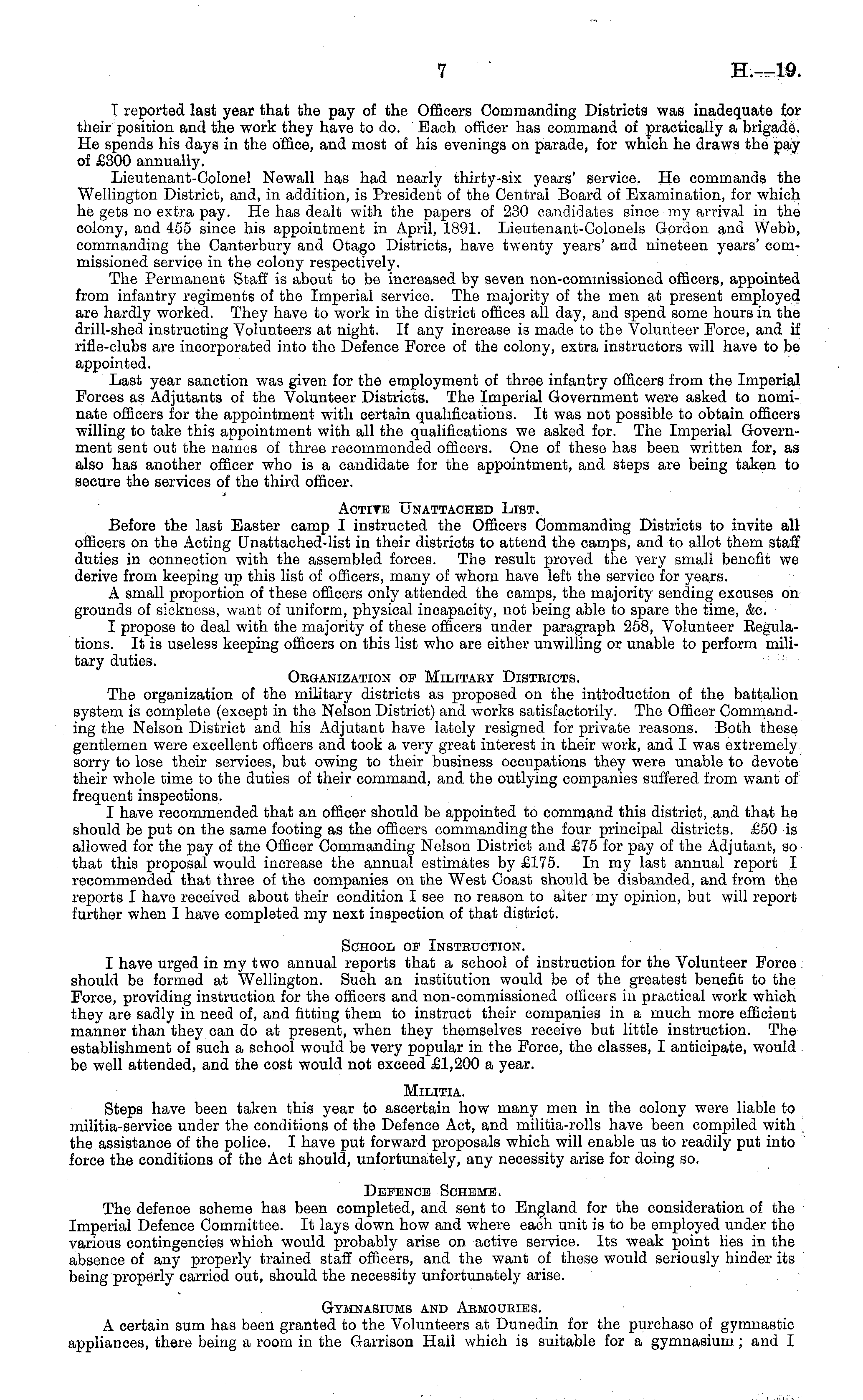 I reported last year that the pay of the Officers Commanding Districts was inadequate for their position and the work they have to do. Each officer has command of practically a brigade. He spends his days in the office, and most of his evenings on parade, for which he draws the pay of £300 annually. Lieutenant-Colonel Newall has had nearly thirty-six years' service. He commands the Wellington District, and, in addition, is President of the Central Board of Examination, for which he gets no extra pay. He has dealt with the papers of 230 candidates since my arrival in the colony, and 455 since his appointment in April, 1891. Lieutenant-Colonels Gordon and Webb, commanding the Canterbury and Otago Districts, have twenty years' and nineteen years' commissioned service in the colony respectively. The Permanent Staff is about to be increased by seven non-commissioned officers, appointed from infantry regiments of the Imperial service. The majority of the men at present employed are hardly worked. They have to work in the district offices all day, and spend some hours in the drill-shed instructing Volunteers at night. If any increase is made to the Volunteer Force, and if rifle-clubs are incorporated into the Defence Force of the colony, extra instructors will have to be appointed. Last year sanction was given for the employment of three infantry officers from the Imperial Forces as Adjutants of the Volunteer Districts. The Imperial Government were asked to nominate officers for the appointment with certain qualifications. It was not possible to obtain officers willing to take this appointment with all the qualifications we asked for. The Imperial Government sent out the names of three recommended officers. One of these has been written for, as also has another officer who is a candidate for the appointment, and steps are being taken to secure the services of the third officer. Actite Unattached List. Before the last Easter camp I instructed the Officers Commanding Districts to invite all officers on the Acting Unattached-list in their districts to attend the camps, and to allot them staff duties in connection with the assembled forces. The result proved the very small benefit we derive from keeping up this list of officers, many of whom have left the service for years. A small proportion of these officers only attended the camps, the majority sending excuses on grounds of sickness, want of uniform, physical incapacity, not being able to spare the time, &c. I propose to deal with the majority of these officers under paragraph 258, Volunteer Eegulations. It is useless keeping officers on this list who are either unwilling or unable to perform military duties. Organization of Military Districts. The organization of the military districts as proposed on the introduction of the battalion system is complete (except in the Nelson District) and works satisfactorily. The Officer Commanding the Nelson District and his Adjutant have lately resigned for private reasons. Both these gentlemen were excellent officers and took a very great interest in their work, and I was extremely sorry to lose their services, but owing to their business occupations they were unable to devote their whole time to the duties of their command, and the outlying companies suffered from want of frequent inspections. I have recommended that an officer should be appointed to command this district, and that he should be put on the same footing as the officers commanding the four principal districts. £50 is allowed for the pay of the Officer Commanding Nelson District and £75 for pay of the Adjutant, so that this proposal would increase the annual estimates by £175. In my last annual report I recommended that three of the companies on the West Coast should be disbanded, and from the reports I have received about their condition I see no reason to alter my opinion, but will report further when I have completed my next inspection of that district. School of Instruction. I have urged in my two annual reports that a school of instruction for the Volunteer Force should be formed at Wellington. Such an institution would be of the greatest benefit to the Force, providing instruction for the officers and non-commissioned officers in practical work which they are sadly in need of, and fitting them to instruct their companies in a much more efficient manner than they can do at present, when they themselves receive but little instruction. The establishment of such a school would be very popular in the Force, the classes, I anticipate, would be well attended, and the cost would not exceed £1,200 a year. Militia. Steps have been taken this year to ascertain how many men in the colony were liable to militia-service under the conditions of the Defence Act, and militia-rolls have been compiled with the assistance of the police. I have put forward proposals which will enable us to readily put into force the conditions of the Act should, unfortunately, any necessity arise for doing so. Defence Scheme. The defence scheme has been completed, and sent to England for the consideration of the Imperial Defence Committee. It lays down how and where each unit is to be employed under the various contingencies which would probably arise on active service. Its weak point lies in the absence of any properly trained staff officers, and the want of these would seriously hinder its being properly carried out, should the necessity unfortunately arise. Gymnasiums and Armouries. A certain sum has been granted to the Volunteers at Dunedin for the purchase of gymnastic appliances, there being a room in the Garrison Hall which is suitable for a gymnasium ; and I