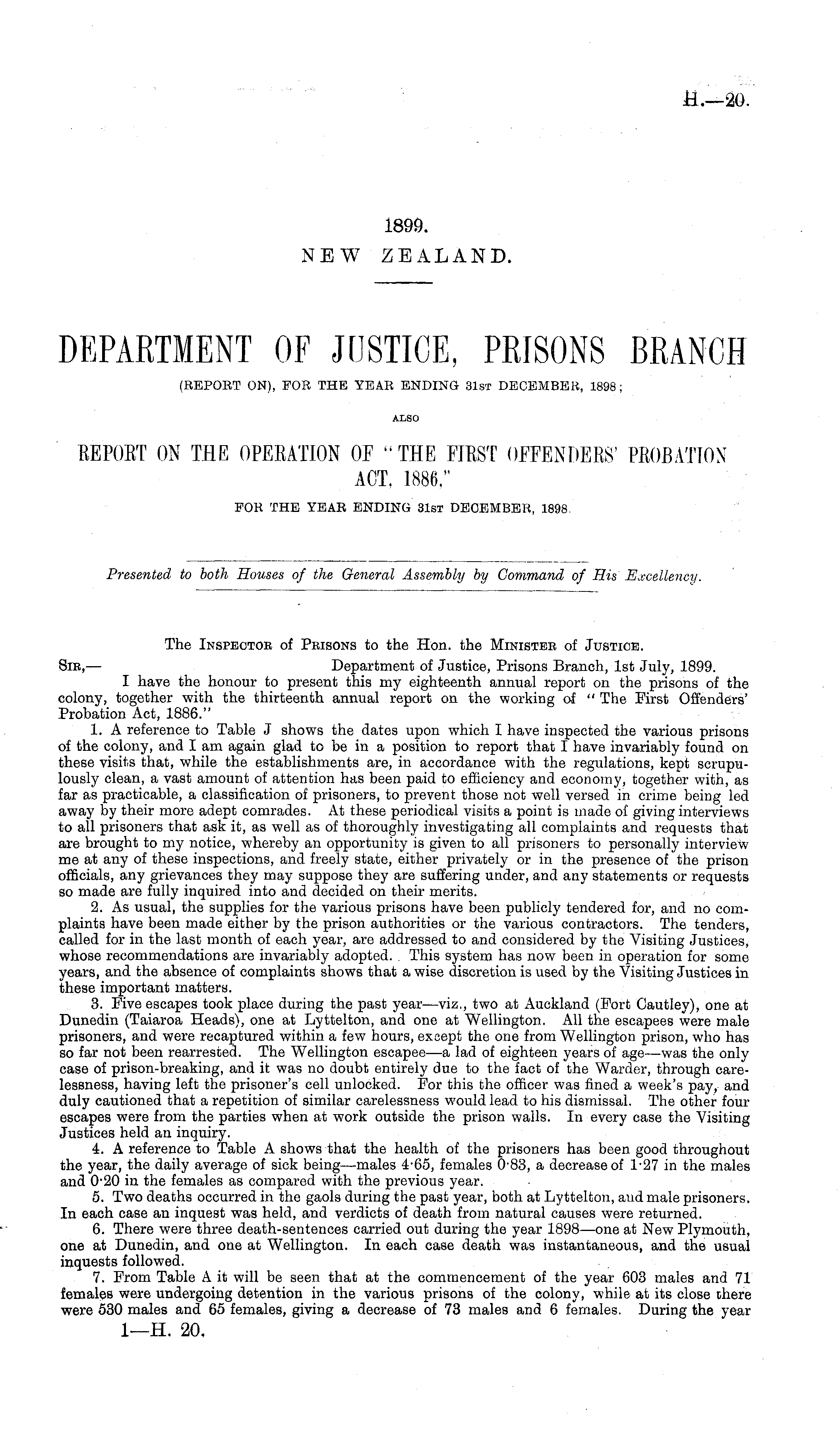 DEPARTMENT OF JUSTICE, PRISONS BRANCH (REPORT ON), FOR THE YEAR ENDING 31st DECEMBER, 1898; ALSO REPORT ON THE OPERATION OF "THE FIRST OFFENDERS' PROBATION ACT, 1886," FOR THE YEAR ENDING 31st DECEMBER, 1898.