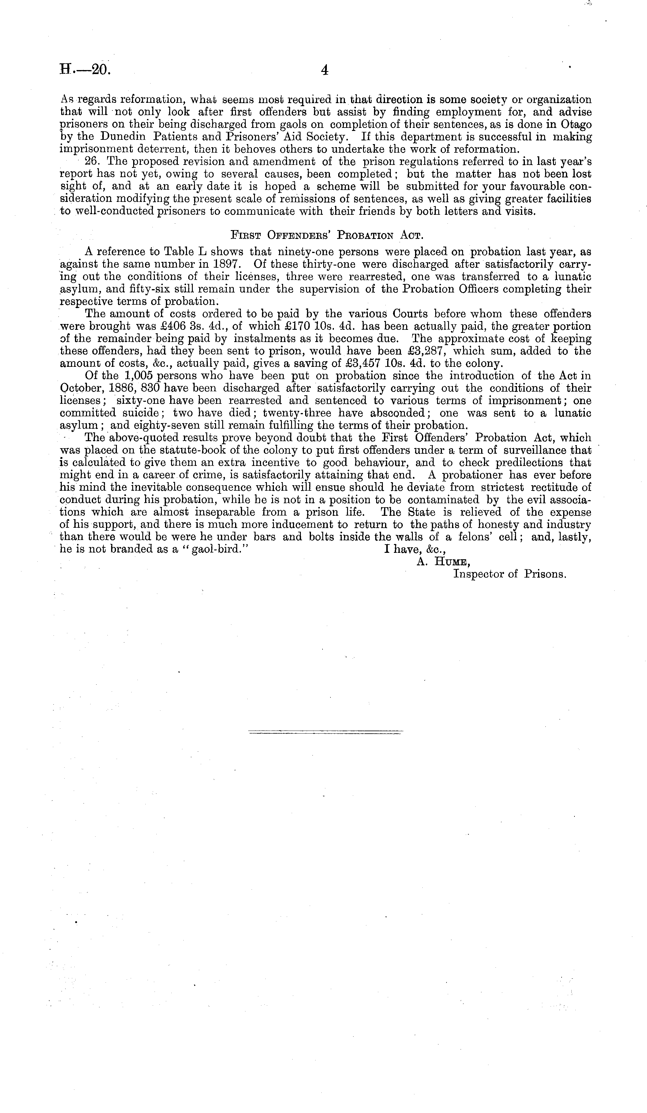 As regards reformation, what seems most required in that direction is some society or organization that will not only look after first offenders but assist by finding employment for, and advise prisoners on their being discharged from gaols on completion of their sentences, as is done in Otago by the Dunedin Patients and Prisoners' Aid Society. If this department is successful in making imprisonment deterrent, then it behoves others to undertake the work of reformation. 26. The proposed revision and amendment of the prison regulations referred to in last year's report has not yet, owing to several causes, been completed; but the matter has not been lost sight of, and at an early date it is hoped a scheme will be submitted for your favourable consideration modifying the present scale of remissions of sentences, as well as giving greater facilities to well-conducted prisoners to communicate with their friends by both letters and visits. First Offenders' Probation Act. A reference to Table L shows that ninety-one persons were placed on probation last year, as against the same number in 1897. Of these thirty-one were discharged after satisfactorily carrying out the conditions of their licenses, three were rearrested, one was transferred to a lunatic asylum, and fifty-six still remain under the supervision of the Probation Officers completing their respective terms of probation. The amount of costs ordered to be paid by the various Courts before whom these offenders were brought was £406 3s. 4d., of which £170 10s. 4d. has been actually paid, the greater portion of the remainder being paid by instalments as it becomes due. The approximate cost of keeping these offenders, had they been sent to prison, would have been £3,287, which sum, added to the amount of costs, &c, actually paid, gives a saving of £3,457 10s. 4d. to the colony. Of the 1,005 persons who have been put on probation since the introduction of the Act in October, 1886, 830 have been discharged after satisfactorily carrying out the conditions of their licenses; sixty-one have been rearrested and sentenced to various terms of imprisonment; one committed suicide; two have died; twenty-three have absconded; one was sent to a lunatic asylum ; and eighty-seven still remain fulfilling the terms of their probation. The above-quoted results prove beyond doubt that the First Offenders' Probation Act, which was placed on the statute-book of the colony to put first offenders under a term of surveillance that is calculated to give them an extra incentive to good behaviour, and to check predilections that might end in a career of crime, is satisfactorily attaining that end. A probationer has ever before his mind the inevitable consequence which will ensue should he deviate from strictest rectitude of conduct during his probation, while he is not in a position to be contaminated by the evil associations which are almost inseparable from a prison life. The State is relieved of the expense of his support, and there is much more inducement to return to the paths of honesty and industry than there would be were he under bars and bolts inside the walls of a felons' cell; and, lastly, he is not branded as a " gaol-bird." I have, &c, A. Hume, Inspector of Prisons.