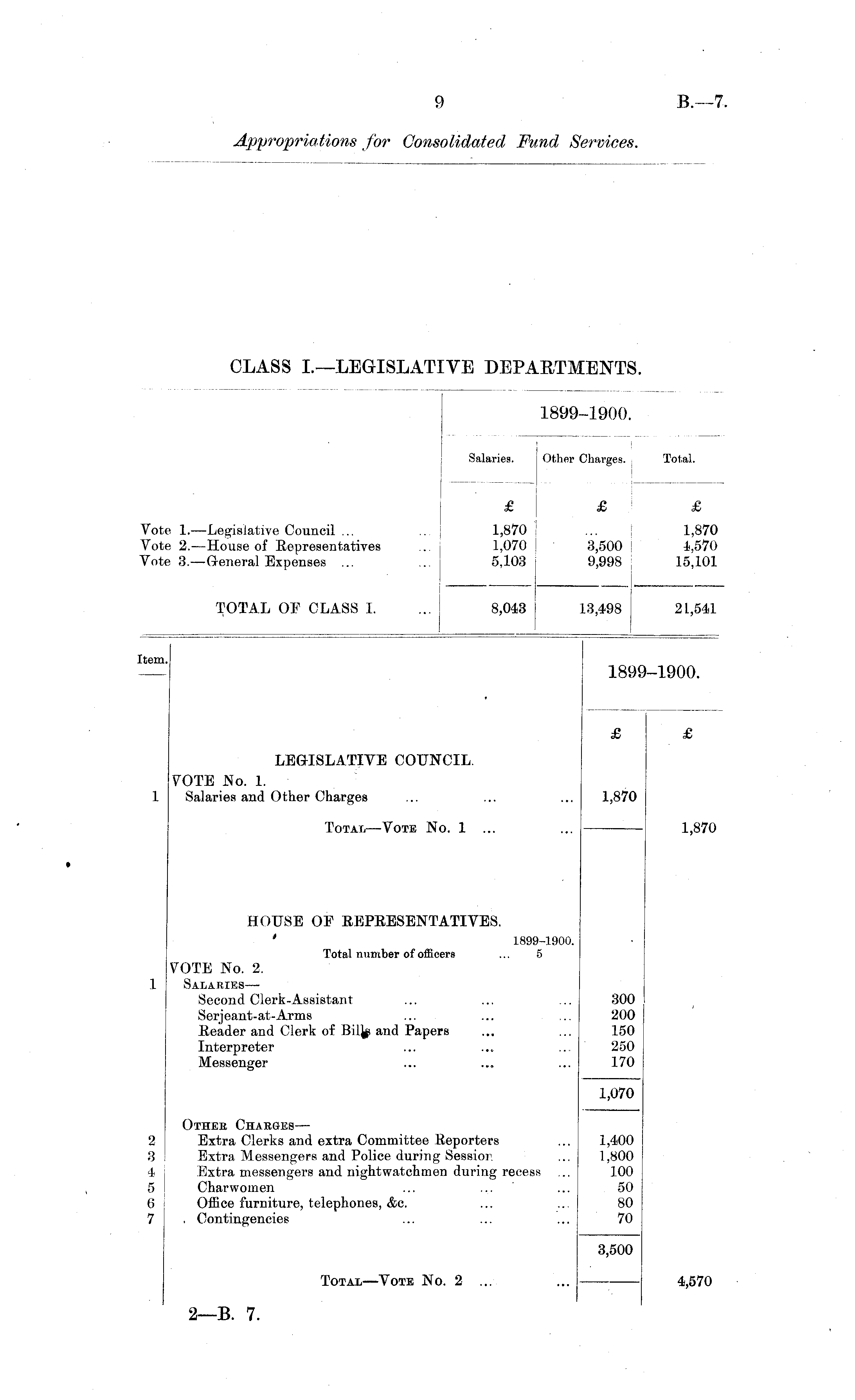 1899-1900. Salaries. Other Charges. Total. Vote 1. —Legislative Council ... Vote 2.—House of Bepresentatives Vote 3.—General Expenses ... £ 1,870 1,070 5,103 £ 3,500 9,998 £ 1,870 4,570 15,101 TOTAL OF CLASS I. 3,498 21,541 8,043 item. 1899-1900. LEGISLATIVE COUNCIL. £ £ VOTE No. 1. Salaries and Other Charges 1,870 Total —Vote No. 1 ... 1,870 HOUSE OF EEPEESENTATIVES. 1 ' 1899-1900. Total number of officers ... 5 VOTE No. 2. Salaries— Second Clerk-Assistant Serjeant-at-Arms ... ... ... Beader and Clerk of Bi% and Papers Interpreter Messenger 300 200 150 250 170 300 200 150 250 170 1,070 1.400 1,070 2 3 4 5 6 7 Other Charges— Extra Clerks and extra Committee Beporters Extra Messengers and Police during Sessior. Extra messengers and nightwatchmen during recess Charwomen Office furniture, telephones, &c. . Contingencies 1,400 1,800 100 50 80 70 1,800 100 50 80 70 3,500 4,570 3,500 Total —Vote No. 2 ...