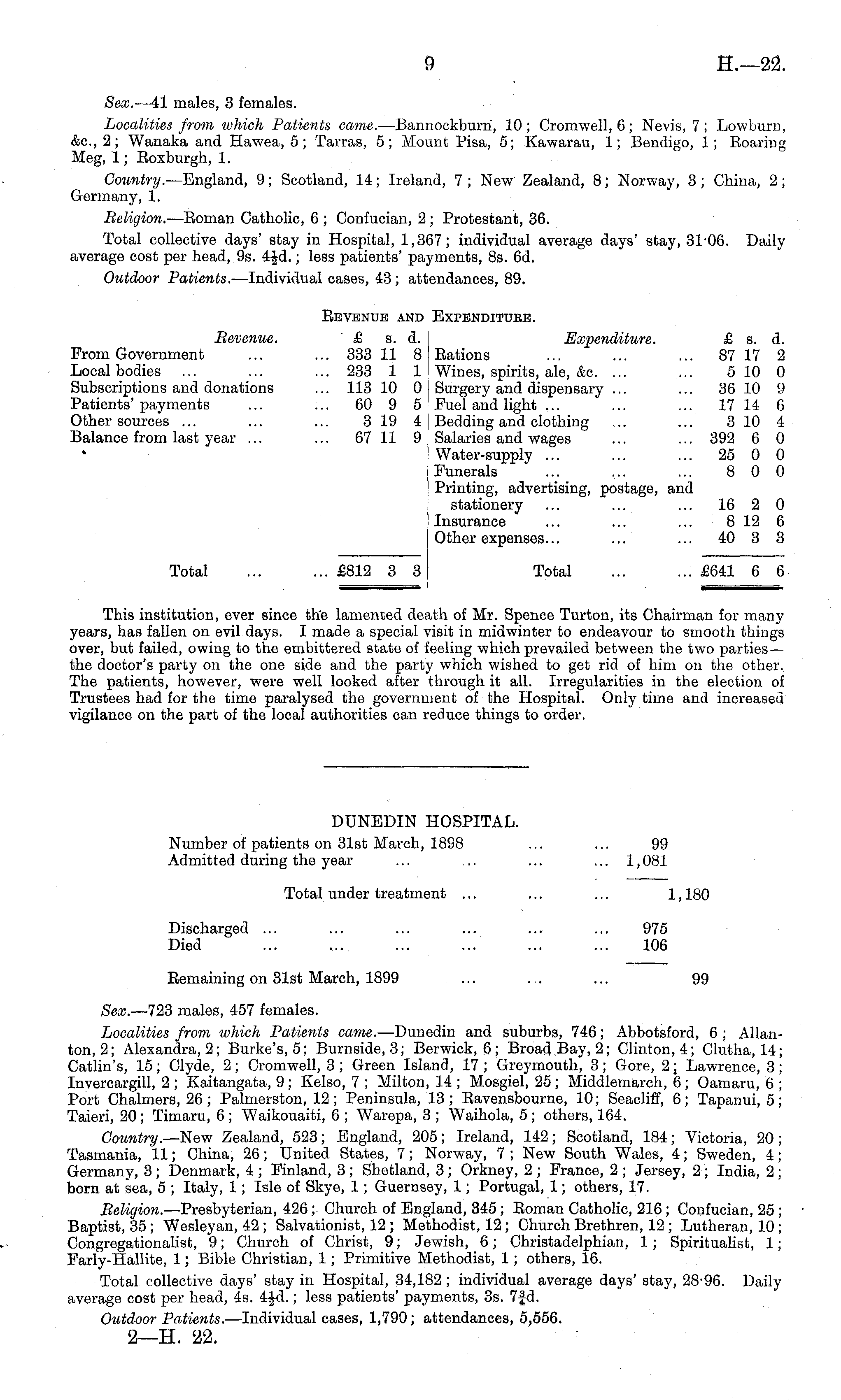 DUNEDIN HOSPITAL. Number of patients on 31st March, 1898 ... ... 99 Admitted during the year ... ... ... ... 1,081 Total under treatment ... ... ... 1,180 Discharged ... ... ... ... ... ... 975 Died ... ... ... ... ... ... 106 Remaining on 31st March, 1899 ... ~. ... 99 Sex. —723 males, 457 females. Localities from which Patients came. —Dunedin and suburbs, 746; Abbotsford, 6; Allanton, 2; Alexandra, 2; Burkes, 5; Burnside, 3; Berwick, 6; Broad Bay, 2; Clinton, 4; Clutha, 14; Catlin's, 15; Clyde, 2; Cromwell, 3; Green Island, 17; Greymouth, 3; Gore, 2; Lawrence, 3; Invercargill, 2 ; Kaitangata, 9; Kelso, 7 ; Milton, 14 ; Mosgiel, 25; Middlemarch, 6; Oamaru, 6 ; Port Chalmers, 26 ; Palmerston, 12; Peninsula, 13; Ravensbourne, 10; Seacliff, 6; Tapanui, 5; Taieri, 20; Timaru, 6; Waikouaiti, 6 ; Warepa, 3 ; Waihola, 5 ; others, 164. Country. —New Zealand, 523; England, 205 ; Ireland, 142 ; Scotland, 184; Victoria, 20 ; Tasmania, 11; China, 26; United States, 7; Norway, 7 ; New South Wales, 4; Sweden, 4; Germany, 3; Denmark, 4; Finland, 3; Shetland, 3; Orkney, 2; France, 2; Jersey, 2; India, 2; born at sea, 5 ; Italy, 1; Isle of Skye, 1; Guernsey, 1; Portugal, 1; others, 17. Religion. —Presbyterian, 426 ; Church of England, 345; Roman Catholic, 216; Confucian, 25 ; Baptist, 35 ; Wesleyan, 42 ; Salvationist, 12; Methodist, 12; Church Brethren, 12 ; Lutheran, 10; Congregationalist, 9; Church of Christ, 9; Jewish, 6; Christadelphian, 1 ; Spiritualist, 1; Farly-Hallite, 1; Bible Christian, 1; Primitive Methodist, 1; others, 16. Total collective days' stay in Hospital, 34,182 ; individual average days' stay, 28-96. Dailyaverage cost per head, 4s. 4£d.; less patients' payments, 3s. 7fd. Outdoor Patients. —lndividual cases, 1,790; attendances, 5,556. 2—H. 22.