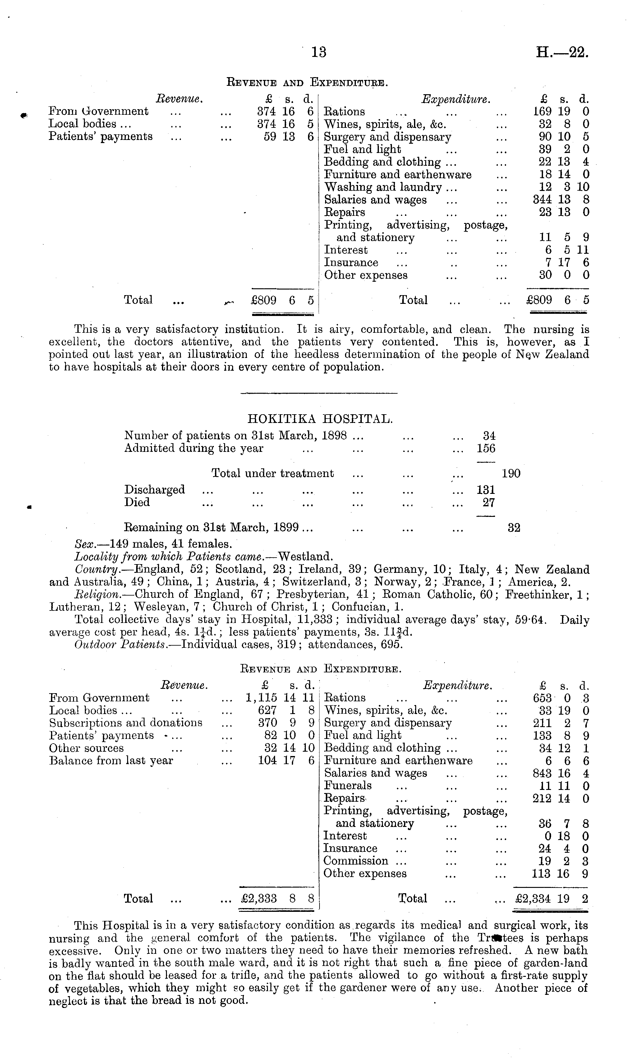 HOKITIKA HOSPITAL. Number of patients on 31st March, 1898 ... ... ... 34 Admitted during the year ... ... ... ... 156 Total under treatment ... ... ... 190 Discharged ... ... ... ... ... ... 131 Died ... ... ... ... ... ... 27 Remaining on 31st March, 1899 ... ... ... ... 32 Sex. —149 males, 41 females. Locality from which Patients came. —Westland. Country. —England, 52; Scotland, 23 ; Ireland, 39; Germany, 10; Italy, 4; New Zealand and Australia, 49 ; China, 1; Austria, 4 ; Switzerland, 3; Norway, 2; France, 1 ; America, 2. Religion. —Church of England, 67 ; Presbyterian, 41; Roman Catholic, 60; Freethinker, 1 ; Lutheran, 12 ; Wesleyan, 7 ; Church of Christ, 1 ; Confucian, 1. Total collective days' stay in Hospital, 11,333 ; individual average days' stay, 59-64. Daily average cost per head, 4s. ljd.; less patients' payments, 3s. llfd. Outdoor Patients. —lndividual cases, 319 ; attendances, 695. Revenue and Expendituee. Revenue. £ s. d. Expenditure. £ s. d. From Government ... ... 1,115 14 11 I Rations ... ... ... 653 0 3 Local bodies ... ... ... 627 1 8 Wines, spirits, ale, &c. ... 33 19 0 Subscriptions and donations ... 370 9 9 Surgery and dispensary ... 211 2 7 Patients'payments -... ... 82 10 0 Fuel and light ... ... 133 8 9 Other sources ... ... 32 14 10 Bedding and clothing ... ... 34 12 1 Balance from last year ... 104 17 6 Furniture and earthenware ... 6 6 6 Salaries and wages ... ... 843 16 4 Funerals ... ... ... 11 11 0 Repairs ... ... ... 212 14 0 Printing, advertising, postage, and stationery ... ... 36 7 8 Interest ... ... ... 0 18 0 Insurance ... ... ... 24 4 0 Commission ... ... ... 19 2 3 Other expenses ... ... 113 16 9 Total ... ... £2,333 8 8 Total ... ... £2,334 19 2 This Hospital is in a very satisfactory condition as regards its medical and surgical work, its nursing and the general comfort of the patients. The vigilance of the Trifetees is perhaps excessive. Only in one or two matters they need to have their memories refreshed. A new bath is badly wanted in the south male ward, and it is not right that such a fine piece of garden-land on the flat should be leased for a trifle, and the patients allowed to go without a first-rate supply of vegetables, which they might so easily get if the gardener were of any use. Another piece of neglect is that the bread is not good.