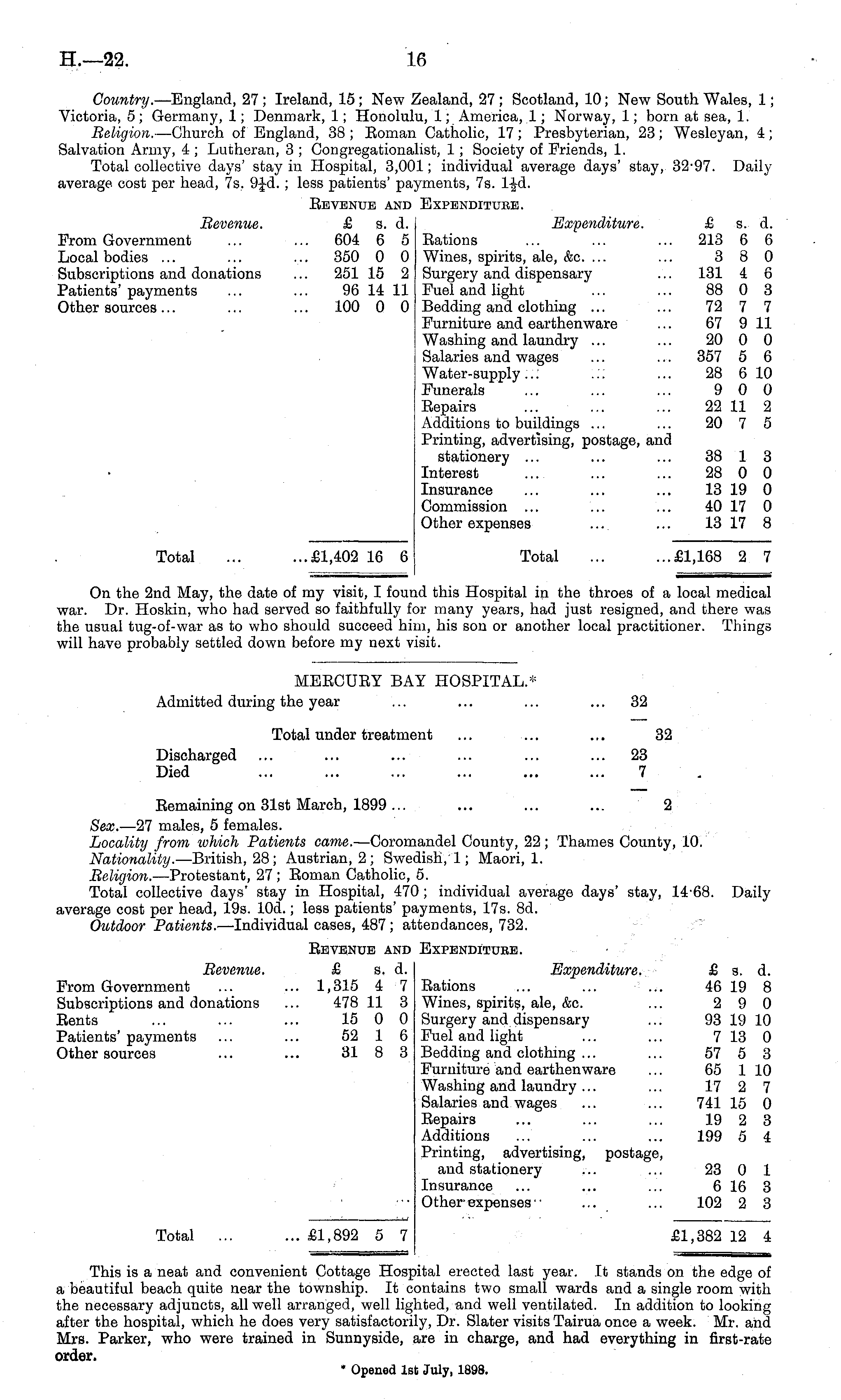 Country. —England, 27 ; Ireland, 15 ; New Zealand, 27 ; Scotland, 10; New South Wales, 1; Victoria, 5 ; Germany, 1; Denmark, 1; Honolulu, 1; America, 1; Norway, 1; born at sea, 1. Religion. —Church of England, 38 ; Roman Catholic, 17; Presbyterian, 23; Wesleyan, 4; Salvation Army, 4 ; Lutheran, 3 ; Congregationalist, 1; Society of Friends, 1. Total collective days' stay in Hospital, 3,001; individual average days' stay, 32-97. Daily average, cost per head, 7s, 9Jd.; less patients' payments, 7s. 1-Jd. Revenue and Expendituee. Revenue. £ s. d. Expenditure. £ s. d. From Government ... ... 604 6 5 Rations ... ... ... 213 6 6 Local bodies ... ... ... 350 0 0 Wines, spirits, ale, &c. ... ... 3 8 0 Subscriptions and donations ... 251 15 2 Surgery and dispensary ... 131 4 6 Patients'payments ... ... 96 14 11 Fuel and light ... ... 88 0 3 Other sources... ... ... 100 0 0 Bedding and clothing ... ... 72 7 7 Furniture and earthenware ... 67 911 Washing and laundry ... ... 20 0 0 Salaries and wages ... ... 357 5 6 Water-supply... ... ... 28 6 10 Funerals ... ... ... 9 0 0 Repairs ... ... ... 22 11 2 Additions to buildings ... ... 20 7 5 Printing, advertising, postage, and stationery ... ... ... 38 1 3 Interest ... ... ... 28 0 0 Insurance ... ... ... 13 19 0 Commission ... ... ... 40 17 0 Other expenses ... ... 13 17 8 Total ... ...£1,402 16 6 Total ... ...£1,168 2 7 On the 2nd May, the date of my visit, I found this Hospital in the throes of a local medical war. Dr. Hoskin, who had served so faithfully for many years, had just resigned, and there was the usual tug-of-war as to who should succeed him, his son or another local practitioner. Things will have probably settled down before my next visit.