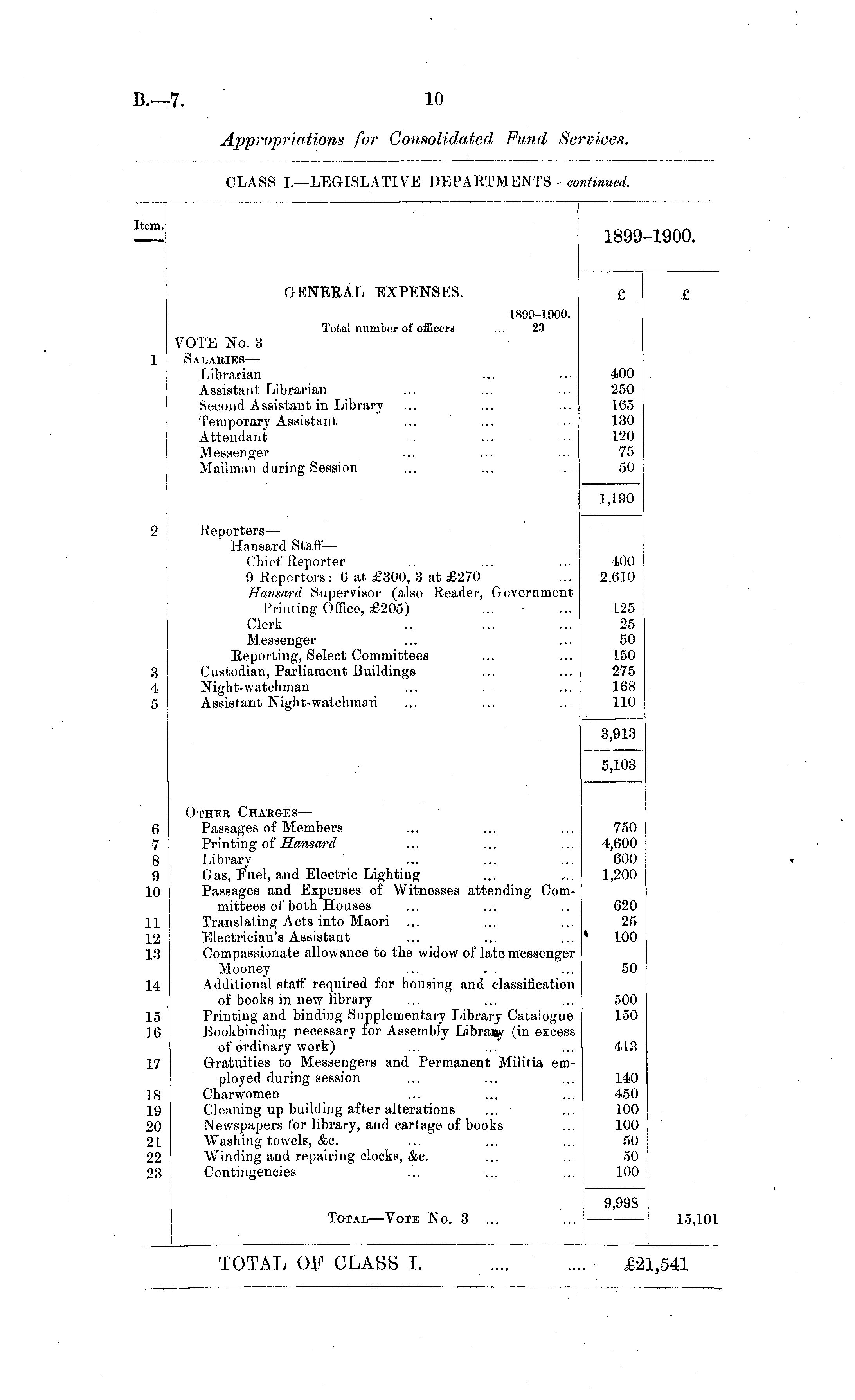 item. 1899-1900. GENEEAL EXPENSES. 1899-1900. Total number of officers ... 23 £ VOTE No. 3 Salaries — Librarian Assistant Librarian Second Assistant in Library Temporary Assistant Attendant Messenger Mailman during Session 400 250 165 130 120 75 50 1,190 Beporters — Hansard Staff — Chief Beporter 9 Beporters: 6 at £300, 3 at £270 Hansard Supervisor (also Reader, Government Printing Office, £205) Clerk Messenger Beporting, Select Committees Custodian, Parliament Buildings Night-watchman Assistant Night-watchman 400 2.610 125 25 50 150 275 168 110 3 4 5 3,913 5,103 6 7 8 9 10 11 12 13 14 Other Charges— Passages of Members Printing of Hansard Library Gas, Fuel, and Electric Lighting Passages and Expenses of Witnesses attending Committees of both Houses Translating Acts into Maori Electrician's Assistant Compassionate allowance to the widow of late messenger Mooney Additional staff required for housing and classification of books in new library Printing and binding Supplementary Library Catalogue Bookbinding necessary for Assembly Library (in excess of ordinary work) Gratuities to Messengers and Permanent Militia employed during session Charwomen Cleaning up building after alterations Newspapers for library, and cartage of books Washing towels, &c. Winding and repairing clocks, &c. Contingencies 750 4,600 600 1,200 620 25 * 100 50 500 150 15 16 413 17 140 450 100 100 50 50 100 18 19 20 21 22 23 15,101 Total —Vote No. 3 ... 9,998 TOTAL OF CLASS I. £21,641