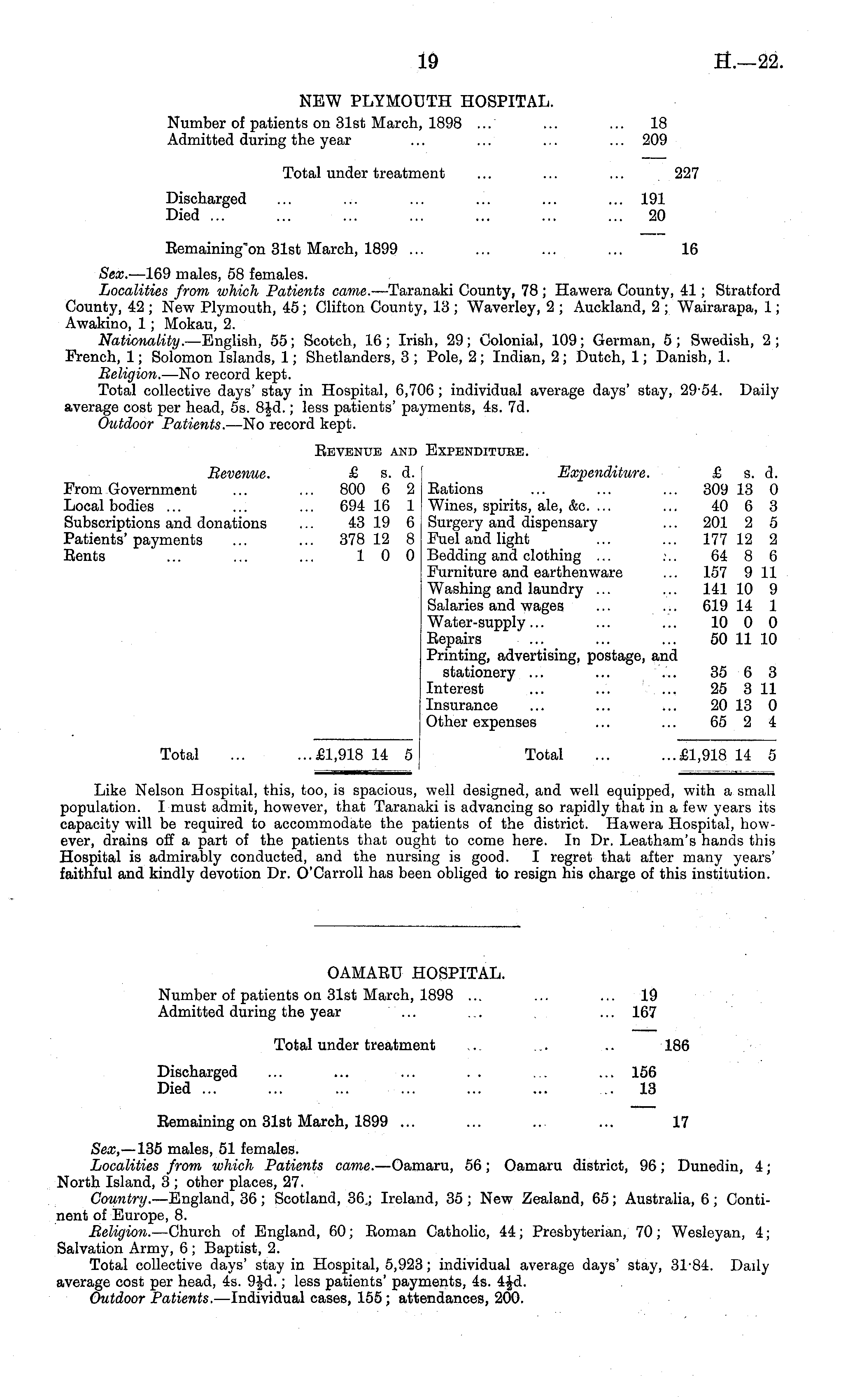 NEW PLYMOUTH HOSPITAL. Number of patients on 31st March, 1898 ... ... ... 18 Admitted during the year ... ... ... ... 209 Total under treatment ... ... ... 227 Discharged ... ... ... ... ... ... 191 Died ... ... ... ... ... ... ... 20 Remaining'on 31st March, 1899 ... ... ... ... 16 Sex. —l 69 males, 58 females. Localities from which Patients came. —Taranaki County, 78 ; Hawera County, 41; Stratford County, 42 ; New Plymouth, 45; Clifton County, 13 ; Waverley, 2 ; Auckland, 2 ; Wairarapa, 1; Awakino, 1; Mokau, 2. Nationality. —English, 55 ; Scotch, 16 ; Irish, 29; Colonial, 109; German, 5 ; Swedish, 2 ; French, 1; Solomon Islands, 1; Shetlanders, 3 ; Pole, 2; Indian, 2; Dutch, 1; Danish, 1. Religion. —No record kept. Total collective days' stay in Hospital, 6,706; individual average days' stay, 29-54. Daily average cost per head, ss. 8-Jd.; less patients' payments, 4s. 7d. Outdoor Patients. —No record kept. Revenue and Expendituee. Revenue. £ s. d. [ Expenditure. £ s. d. From Government ... ... 800 6 2 Rations ... ' ... ... 309 13 0 Local bodies ... ... ... 694 16 1 Wines, spirits, ale, &c. ... ... 40 6 3 Subscriptions and donations ... 43 19 6 Surgery and dispensary ... 201 2 5 Patients'payments ... ... 378 12 8 Fuel and light ... ... 177 12 2 Rents ... ... ... 10 0 Bedding and clothing ... :.. 64 8 6 Furniture and earthenware ... 157 9 11 Washing and laundry ... ... 141 10 9 Salaries and wages ... ... 619 14 1 Water-supply... ... ... 10 0 0 Repairs ... ... ... 50 11 10 Printing, advertising, postage, and stationery ... ... ... 35 6 3 Interest ... ... ! \ ... 25 3 11 Insurance ... ... ... 20 13 0 Other expenses ... ... 65 2 4 Total ... ...£1,918 14 5 Total ... ...£1,918 14 5 Like Nelson Hospital, this, too, is spacious, well designed, and well equipped, with a small population. I must admit, however, that Taranaki is advancing so rapidly that in a few years its capacity will be required to accommodate the patients of the district. Hawera Hospital, however, drains off a part of the patients that ought to come here. In Dr. Leatham's hands this Hospital is admirably conducted, and the nursing is good. I regret that after many years' faithful and kindly devotion Dr. O'Carroll has been obliged to resign his charge of this institution.