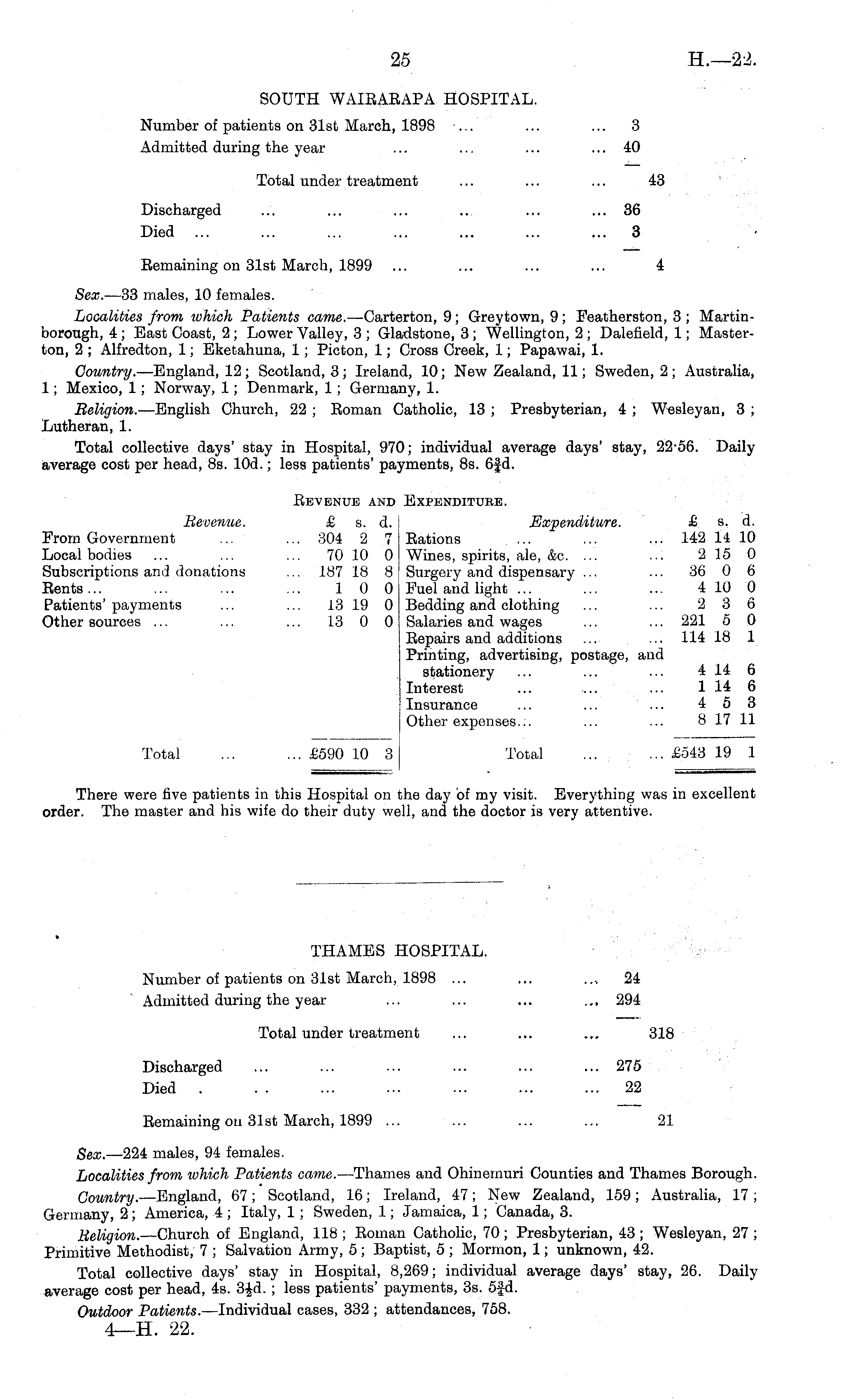 SOUTH WAIRARAPA HOSPITAL. Number of patients on 31st March, 1898 ... ... ... 3 Admitted during the year ... ... ... ... 40 Total under treatment ... ... ... 43 Discharged ... ... ... .. ... ... 36 Died ... ... ... ... ... ... ... 3 Remaining on 31st March, 1899 ... ... ... ... 4 Sex. —33 males, 10 females. Localities from which Patients came. —Carterton, 9; Greytown, 9 ; Featherston, 3 ; Martinborough, 4 ; East Coast, 2 ; Lower Valley, 3 ; Gladstone, 3; Wellington, 2 ; Dalefield, 1; Masterton, 2 ; Alfredton, 1; Eketahuna, 1; Picton, 1; Cross Creek, 1; Papawai, 1. Country. —England, 12; Scotland, 3; Ireland, 10; New Zealand, 11; Sweden, 2 ; Australia, 1; Mexico, 1; Norway, 1; Denmark, 1; Germany, 1. Religion. —English Church, 22 ; Roman Catholic, 13 ; Presbyterian, 4 ; Wesleyan, 3 ; Lutheran, 1. Total collective days' stay in Hospital, 970; individual average days' stay, 22-56. Daily average cost per head, Bs. lOd.; less patients' payments, Bs. 6f d. Revenue and Expendituee. Revenue. £ s. d. Expenditure. £ s. d. From Government ... ... 304 2 7 Rations ... ... ... 142 14 10 Local bodies ... ... ... 70 10 0 Wines, spirits, ale, &c. ... ... 215 0 Subscriptions and donations ... 187 18 8 Surgery and dispensary ... ... 36 0 6 Rents... ... ... ... 10 0 Fuel and light ... ... ... 4 10 0 Patients'payments ... ... 13 19 0 Bedding and clothing ... ... 2 3 6 Other sources ... ... ... 1300 Salaries and wages ... ... 221 5 0 Repairs and additions ... ... 114 18 1 Printing, advertising, postage, and stationery ... ... ... 414 6 Interest ... ... ... 1 14 6 Insurance ... ... ... 453 Other expenses... ... ... 8 17 11 Total ... ... £590 10 3 Total ... ... £543 19 1 There were five patients in this Hospital on the day of my visit. Everything was in excellent order. The master and his wife do their duty well, and the doctor is very attentive.