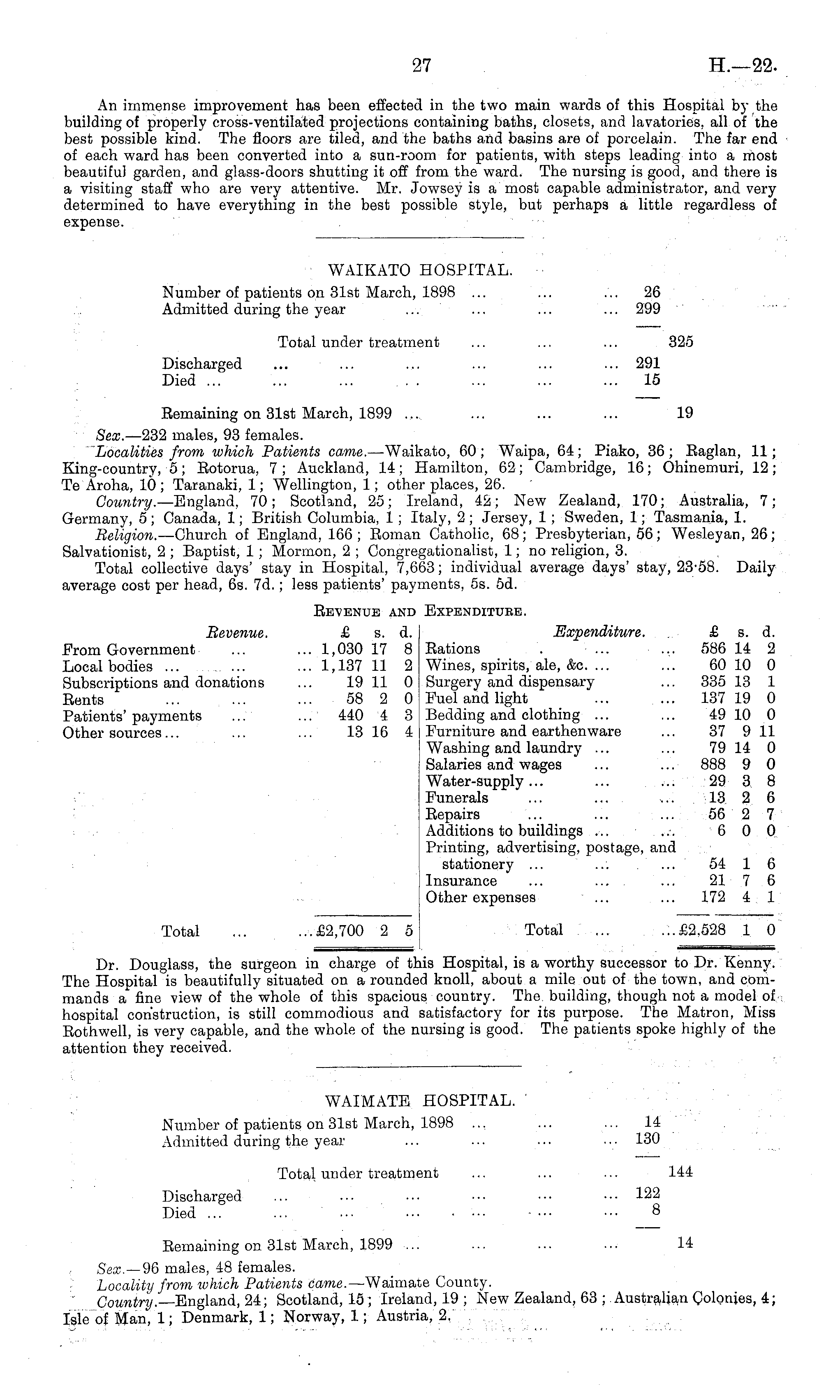 WAIKATO HOSPITAL. Number of patients on 31st March, 1898 ... ... ... 26 Admitted during the year ... ... ... ... 299 Total under treatment ... ... ... 325 Discharged ... ... ... ... ... ... 291 Died ... ... ... . . ... ... ... 15 Remaining on 31st March, 1899 ... ... ... ... 19 Sex. —232 males, 93 females. Localities from which Patients came. —Waikato, 60 ; Waipa, 64; Piako, 36 ; Raglan, 11; King-country, 5; Rotorua, 7; Auckland, 14; Hamilton, 62; Cambridge, 16; Ohinemuri, 12; Te Aroha, 10 ; Taranaki, 1; Wellington, 1; other places, 26. Country. —England, 70; Scotland, 25; Ireland, 42; New Zealand, 170; Australia, 7; Germany, 5; Canada, 1; British Columbia, 1 ; Italy, 2; Jersey, 1 ; Sweden, 1; Tasmania, 1. Religion. —Church of England, 166; Roman Catholic, 68; Presbyterian, 56; Wesleyan, 26; Salvationist, 2 ; Baptist, 1; Mormon, 2 ; Congregationalist, 1; no religion, 3. Total collective days' stay in Hospital, 7,663; individual average days' stay, 23-58. Daily average cost per head, 6s. 7d.; less patients' payments, ss. sd. Revenue and Expendituee. Revenue. £ s. d. Expenditure. £ s. d. From Government ... ...1,030 17 8 Rations . ... ... 586 14 2 Local bodies ...1,137 11 2 Wines, spirits, ale, &c. ... ... 60 10 0 Subscriptions and donations ... 19 11 0 Surgery and dispensary ... 335 13 1 Rents ... ... ... 58 2 0 Fuel and light ... ... 137 19 0 Patients'payments ... ... 440 4 3 Bedding and clothing ... ... 49 10 0 Other sources... ... ... 13 16 4 Furniture and earthenware ... 37 9 11 Washing and laundry ... ... 79 14 0 Salaries and wages ... ... 888 9 0 Water-supply... ... ... 29 3 8 Funerals ... ... ... 13 2 6 Repairs ... ... ... 56 2 7 Additions to buildings ... ... 6 0 0 Printing, advertising, postage, and stationery ... ... ... 54 1 6 Insurance ... ... ... 21 7 6 Other expenses ... ... 172 4 1 Total ... ...£2,700 2 5 Total ... ...£2,528 1 0 Dr. Douglass, the surgeon in charge of this Hospital, is a worthy successor to Dr. Kenny. The Hospital is beautifully situated on a rounded knoll, about a mile out of the town, and commands a fine view of the whole of this spacious country. The building, though not a model of hospital construction, is still commodious and satisfactory for its purpose. The Matron, Miss Rothwell, is very capable, and the whole of the nursing is good. The patients spoke highly of the attention they received.
