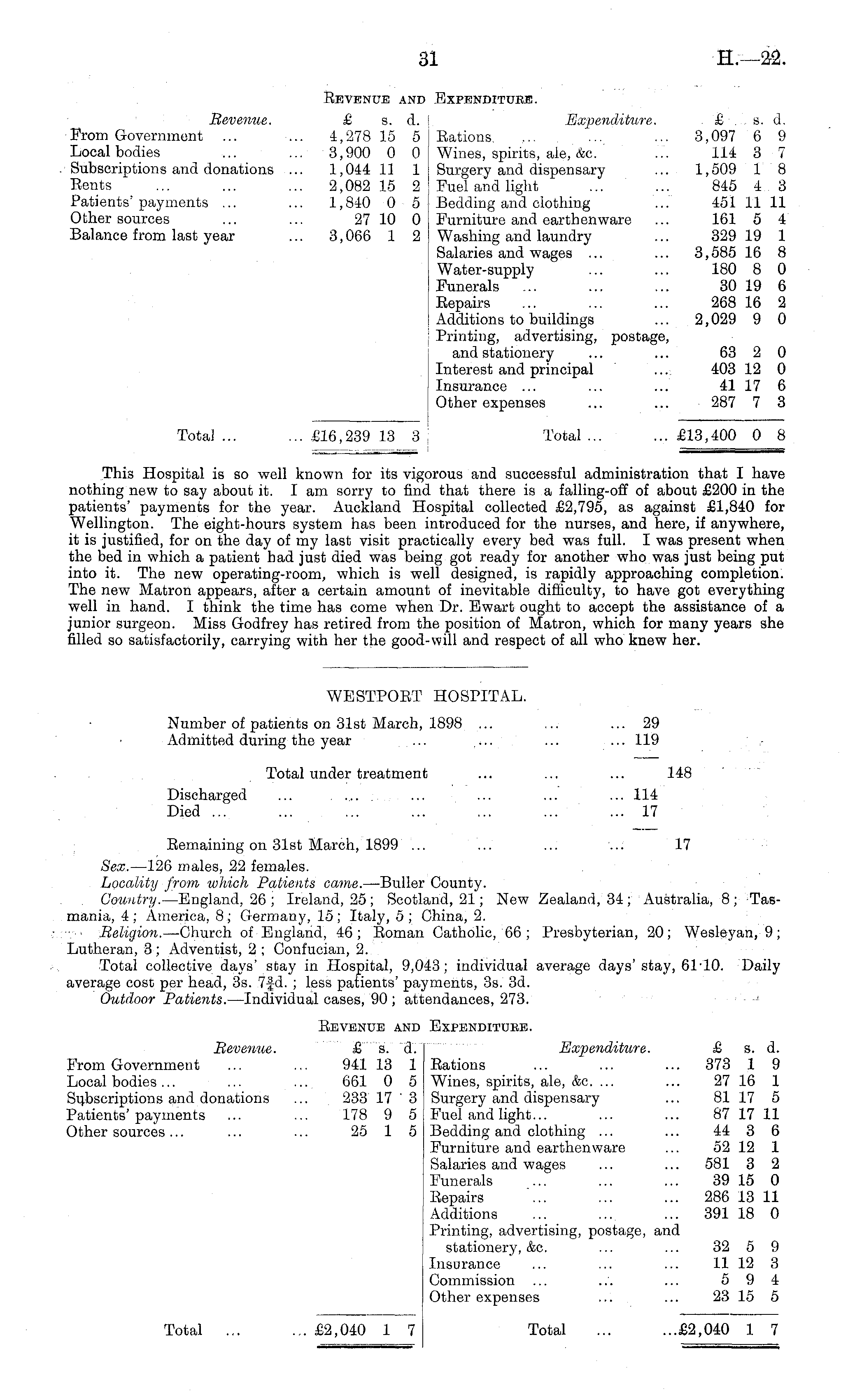 Revenue and Expendituee. Revenue. £ s. d. ' Expenditure. £ ~, s. d. From Government ... ... 4,278 15 5 i Rations. ... ... ... 3,097 6 9 Local bodies ... ... 3,900 0 0 Wines, spirits, ale, &c. ... 114 3 7 Subscriptions and donations ... 1,044 11 1 Surgery and dispensary ... 1,509 1 8 Rents ... ... ... 2,082 15 2 Fuel and light ... ... 845 4 3 Patients'payments ... ... 1,840 0 5 Bedding and clothing ... 451 11 11 Other sources ... ... 27 10 0 Furniture and earthenware ... 161 5 4 Balance from last year ... 3,066 1 2 Washing and laundry ... 329 19 1 Salaries and wages ... ... 3,585 16 8 Water-supply ... ... 180 8 0 Funerals ... ... ... 30 19 6 Repairs ... ... ... 268 16 2 Additions to buildings ... 2,029 9 0 Printing, advertising, postage, and stationery ... ... 63 2 0 Interest and principal ... 403 12 0 Insurance ... ... ... 41 17 6 Other expenses ... ... 287 7 3 Total... ...£16,239 13 3' Total... ...£13,400 0 8 This Hospital is so well known for its vigorous and successful administration that I have nothing new to say about it. I am sorry to find that there is a falling-off of about £200 in the patients' payments for the year. Auckland Hospital collected £2,795, as against £1,840 for Wellington. The eight-hours system has been introduced for the nurses, and here, if anywhere, it is justified, for on the day of my last visit practically every bed was full. I was present when the bed in which a patient had just died was being got ready for another who was just being put into it. The new operating-room, which is well designed, is rapidly approaching completion. The new Matron appears, after a certain amount of inevitable difficulty, to have got everything well in hand. I think the time has come when Dr. Ewart ought to accept the assistance of a junior surgeon. Miss Godfrey has retired from the position of Matron, which for many years she filled so satisfactorily, carrying with her the good-will and respect of all who knew her.