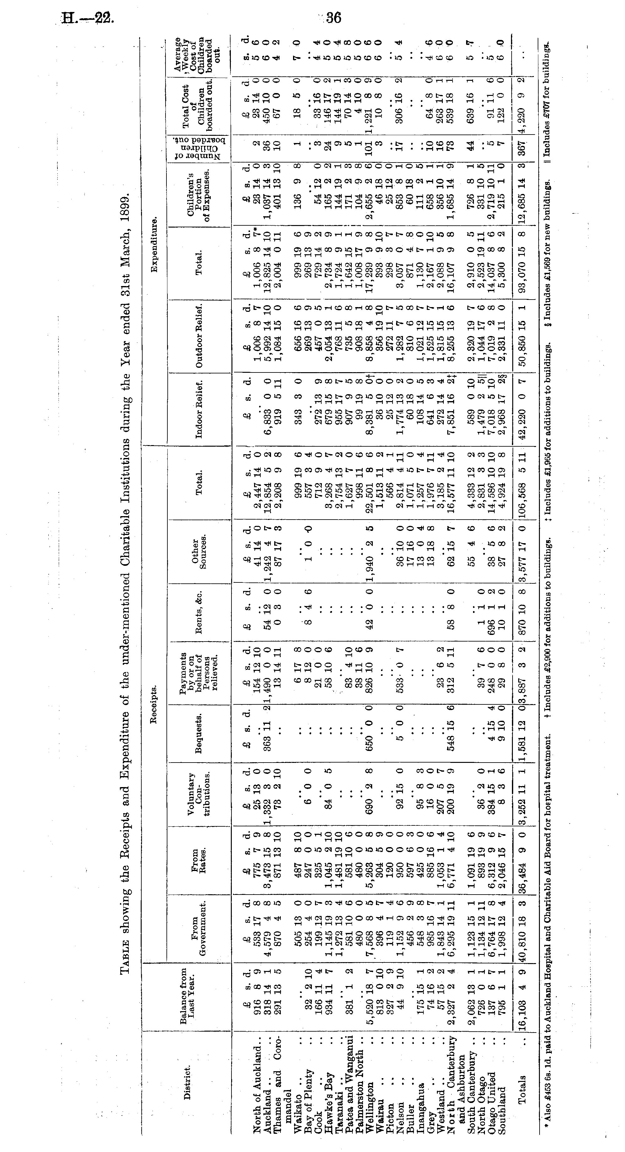 Eeceipts. Expenditure. District. Balance from Last Year. From Government. From Bates. Voluntary Contributions. Bequests. Payments by or on behalf of Persons relieved. Eents, &c. Other Sources. Total. Indoor Belief. Outdoor Belief. Total. Children's Portion of Expenses. ■g -g Average n g o Total Cost • Weekly 8 £ -a of Cost of | S® Children Children a a % boarded out. boarded Z;°o out. North of Auckland.. Auckland Thames and Coromandel Waikato Bay of Plenty Cook Hawke's Bay Taranaki Patea and Wanganui Palmerston North .. Wellington Wairau Picton Nelson Buller Inangahua Grey Westland North Canterbury and Ashburton South Canterbury .. North Otago Otago United Southland £ s. d. 916 8 9 318 14 1 [ 291 13 5 £ s. d. 533 17 8 4,579 4 8 870 4 5 £ s. d. 775 7 9 3,473 15 8 871 13 10 £ s. d. 25 13 0 1,332 3 0 73 2 10 £ s. d. 363 11 2 £ s. d. 154 12 10 1,490 0 0 13 14 11 £ s. d. 54 12 0 0 3 0 £ s. d. 41 14 0 1,242 4 7 87 17 3 £ s. d. 2,447 14 0 12,854 5 2 2,208 9 8 £ s. d. 6,833 0 0 919 5 11 £ s. d. 1,006 8 7 5,992 14 10 1,084 15 0 £ s. d. 1,006 8 7* 12,825 14 10 2,004 0 11 £ s. d. 23 14 0 1,037 14 3 401 13 10 2 36 10 £ s. d. 23 14 0 450 10 0 67 0 0 s. d. 5 6 6 0 4 2 32 2 10 166 11 4 934 11 7 505 13 0 254 4 0 199.12 7 1,145 19 3 1,272 13 4 581 10 6 480 0 0 7,568 8 5 396 4 7 119 1 4 1,152 9 6 456 2 9 548 3 8 985 16 7 1,843 14 1 6,295 19 11 487 8 10 247 0 0 325 5 1 1,045 2 10 1,481 19 10 581 10 6 480 0 0 5,263 5 8 304 5 9 120 0 0 950 0 0 597 6 3 425 0 0 885 16 6 1,053 1 4 6,771 4 10 6 *0 0 6 17 8 8 12 0 21 0 0 58 10 6 8 *4 6 i"o -0 999 19 6 557 3 4 712 9 0 3,268 4 7 2,754 13 2 1,627 7 0 998 11 6 22,501 8 6 1,513 11 2 566 4 1 2,814 4 11 1,071 5 0 1,257 7 4 1,976 7 11 3,185 2 4 16,577 11 10 343 3 0 272 13 9 679 15 8 955 17 7 907 9 5 99 19 8 8,381 5 Of 36 10 0 25 12 0 1,774 13 2 60 18 0 108 14 5 641 6 3 272 14 4 7,851 16 2{ 656 16 6 269 13 9 457 0 5 2,054 13 1 768 11 6 735 5 8 908 18 1 8,858 4 8 356 19 10 272 11 7 1,282 7 5 810 6 8 1,021 12 7 1,525 15 7 1,815 15 1 8,255 13 6 999 19 6 269 13 9 729 14 2 2,734 8 9 1,724 9 1 1,642 15 1 | 1,008 17 9 i 17,239 9 8 393 9 10 298 3 7 3,057 0 7 871 4 8 1,130 7 0 2,167 1 10 2,088 9 5 16,107 9 8 136 9 8 54 12 0 165 2 2 144 19 1 171 2 3 104 9 8 2,655 2 6 46 18 0 25 12 0 853 8 1 60 18 0 111 2 5 658 1 1 356 10 1 1,685 14 9 1 3 24 9 5 1 101 3 18 5 0 33 16 0 146 17 2 144 19 1 70 14 3 4 10 0 1,221 8 9 10 8 0 7 0 4 4 5 0 5 4 5 8 5 0 6 6 6 0 84 0 5 " 381 "l 2 690* 2 8 650 0 0 83 4 10 38 11 6 826 10 9 42 0 0 5,520 18 7 813 0 10 327 2 9 44 9 10 1,940 2 5 92 15 0 5*0 0 533' 0 7 36 10 0 17 16 0 13 0 4 13 18 8 17 306 16 2 5* 4 175 15 1 74 16 2 57 15 2 2,327 2 4 95 8 3 16 0 0 207 5 7 200 19 9 23 "6 2 312 5 11 10 16 73 64 8 0 263 17 1 539 18 1 i 6 6 0 6 0 548*15 6 58 *8 0 62*15 7 2,062 13 1 726 0 1 137 6 7 795 1 1 1,123 15 1 1,134 12 11 6,764 17 8 1,998 12 4 1,091 19 6 893 19 9 6,312 9 6 2,046 15 7 36 2 0 384 15 1 8 3 6 39 7 6 248 0 0 29 8 0 110 696 1 2 10 1 0 55 4 6 4,333 12 2 2,831 3 3 14,586 10 10 4,924 19 8 589 0 10 1,479 2 5|| 7,018 5 10 2,968 17 2§ 2,320 19 7 1,044 17 6 7,019 2 8 2,331 11 0 2,910 0 5 2,523 19 11 14,037 8 6 5,300 8 2 726 8 1 331 10 5 2,719 10 11 215 1 0 44 639 16 1 5 7 415 4 9 10 0 38**5 6 27 8 2 7 I 91*11 6 I 122 0 0 5 6 0 Totals 16,103 4 9 L 40,810 18 3 — 36,484 9 0 3,252 11 1 1,581 12 0 3,887 3 2 42,220 0 7 50,850 15 1 367 | 4,220 9 2 ... 870 10 8 3,577 17 0 106,568 5 11 93,070 15 8 12,685 14 8 * Also £453 6s. Id. paid to Auckland Hospital and Charitable Aid Board for hospital treatment. t Includes £2,900 for additions to buildings. I Includes £1,965 for additions to buildings. § Includes £1,569 for new buildings. 8 Includes £707 for buildings.