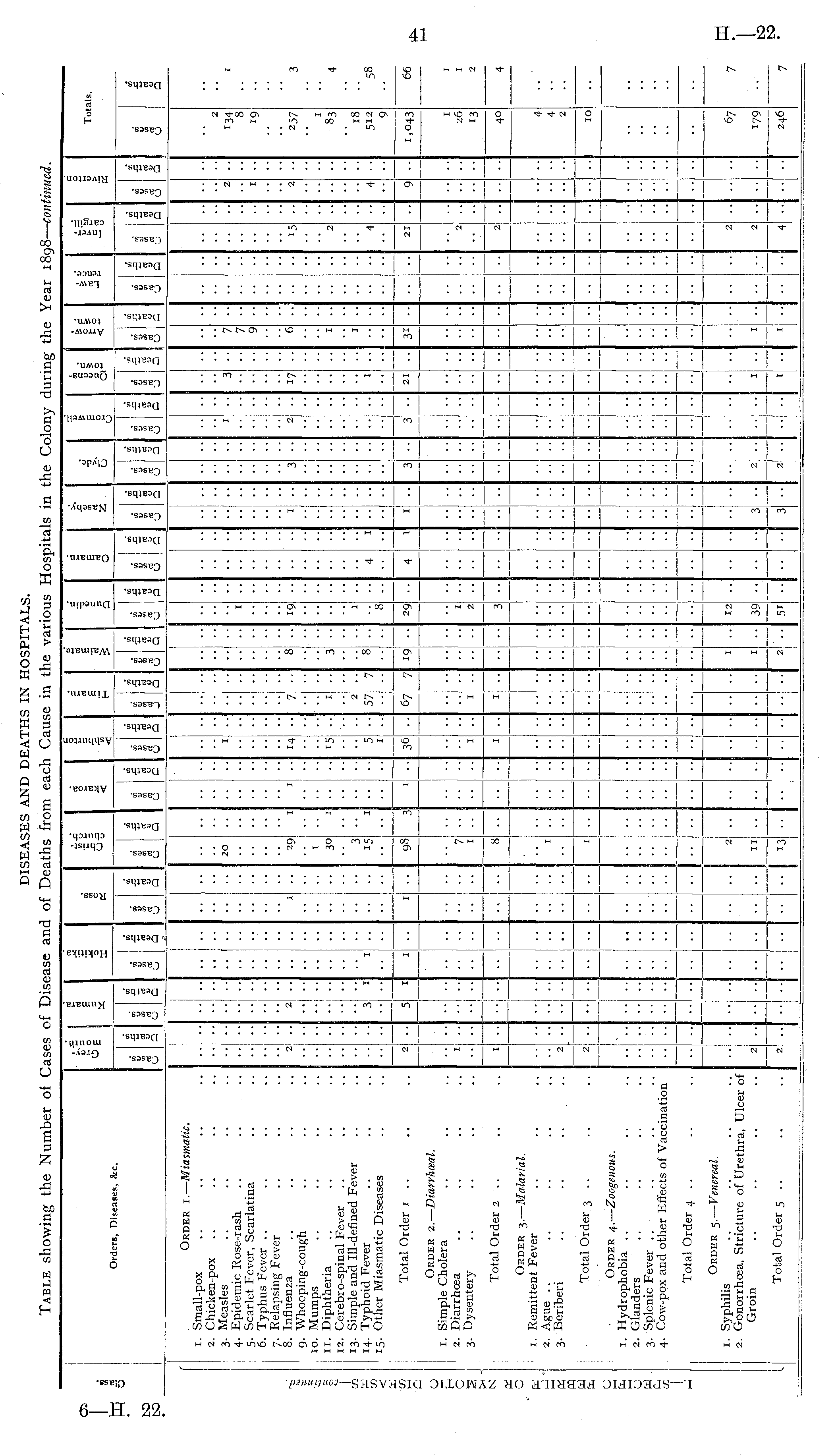 DISEASES AND DEATHS IN HOSPITALS. Table showing the Number of Cases of Disease and of Deaths from each Cause in the various Hospitals in the Colony during the Year 1898— continued.