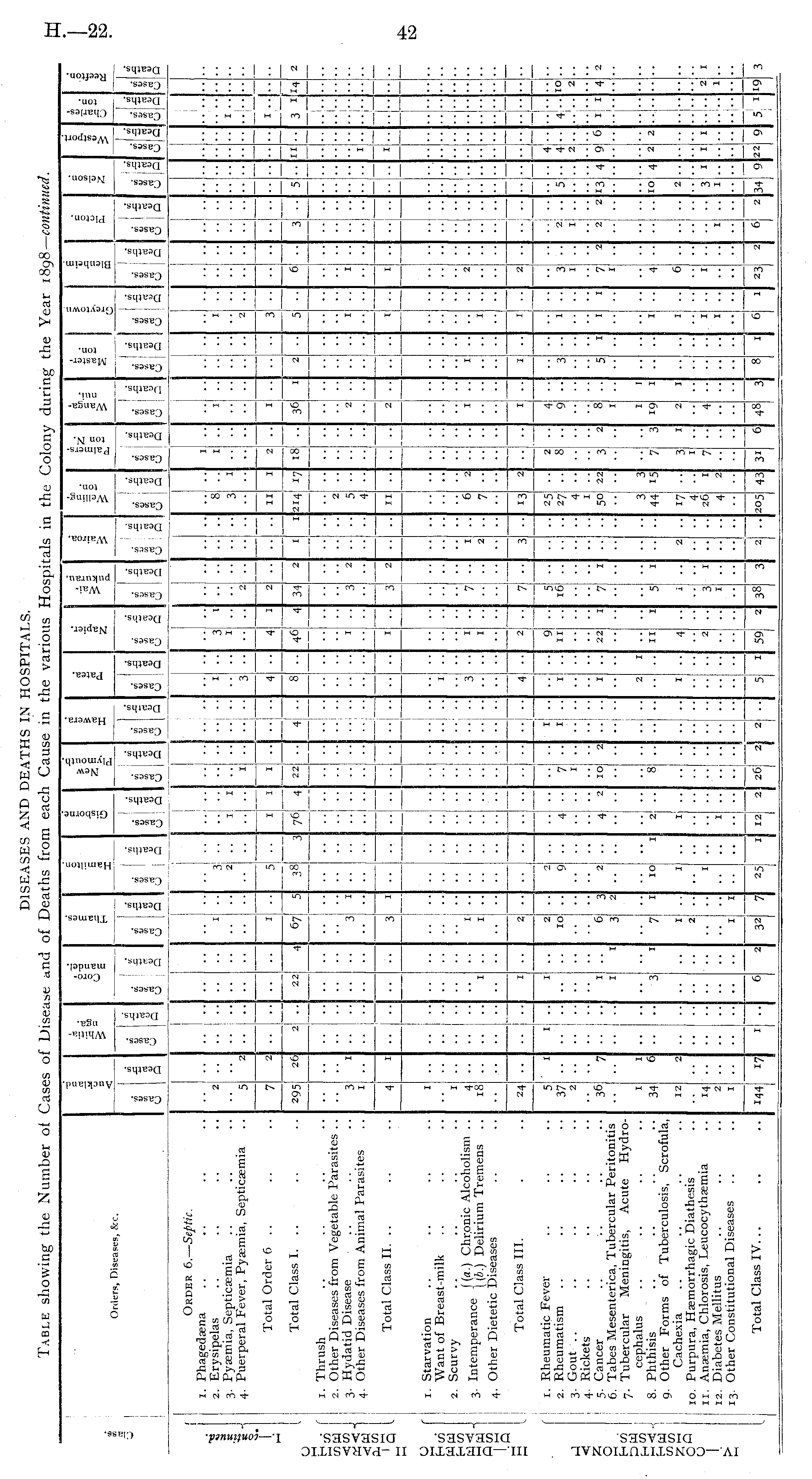 DISEASES AND DEATHS IN HOSPITALS. Table showing the Number of Cases of Disease and of Deaths from each Cause in the various Hospitals in the Colony during the Year 1898— continued.