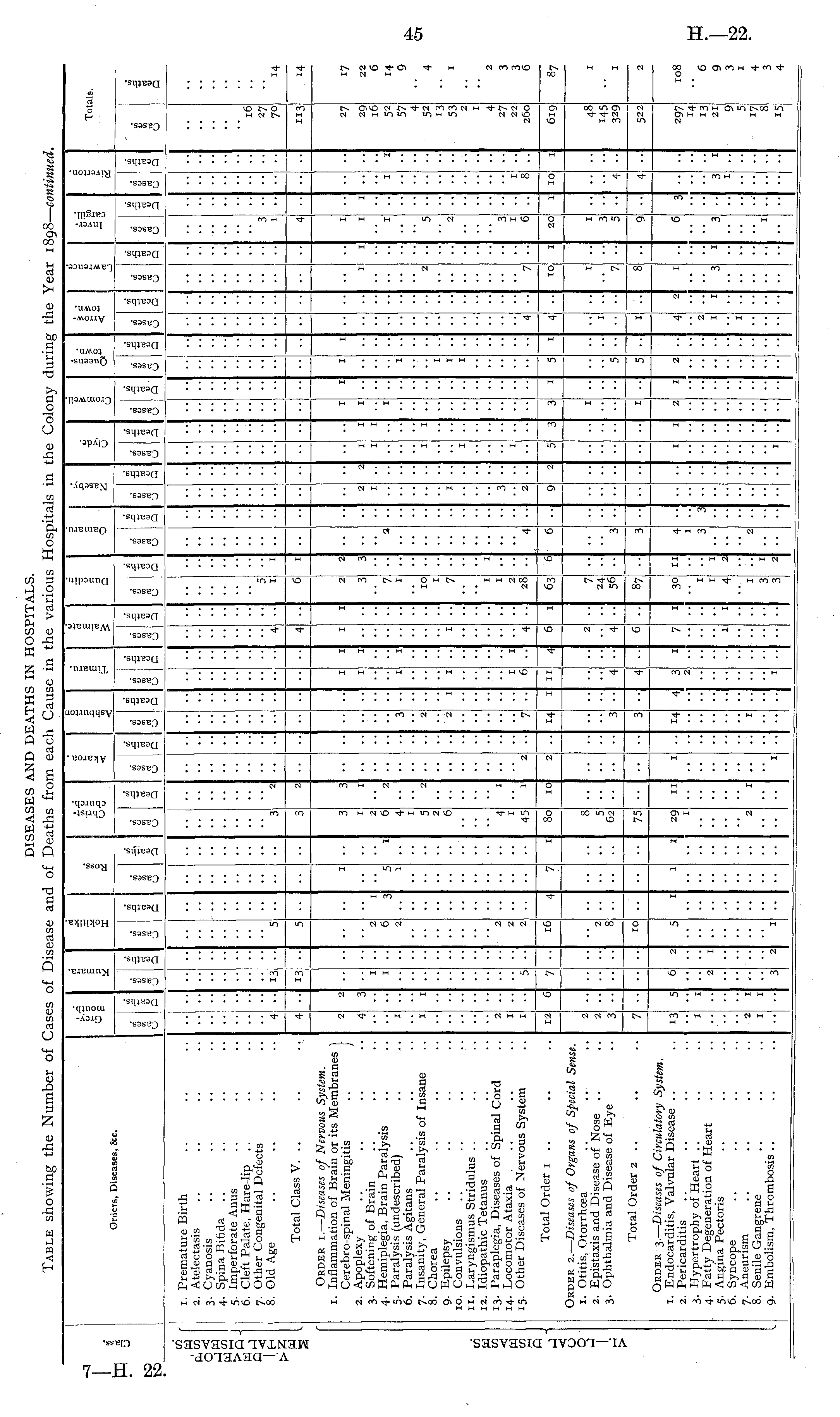 DISEASES AND DEATHS IN HOSPITALS. Table showing the Number of Cases of Disease and of Deaths from each Cause in the various Hospitals in the Colony during the Year 1898— continued.