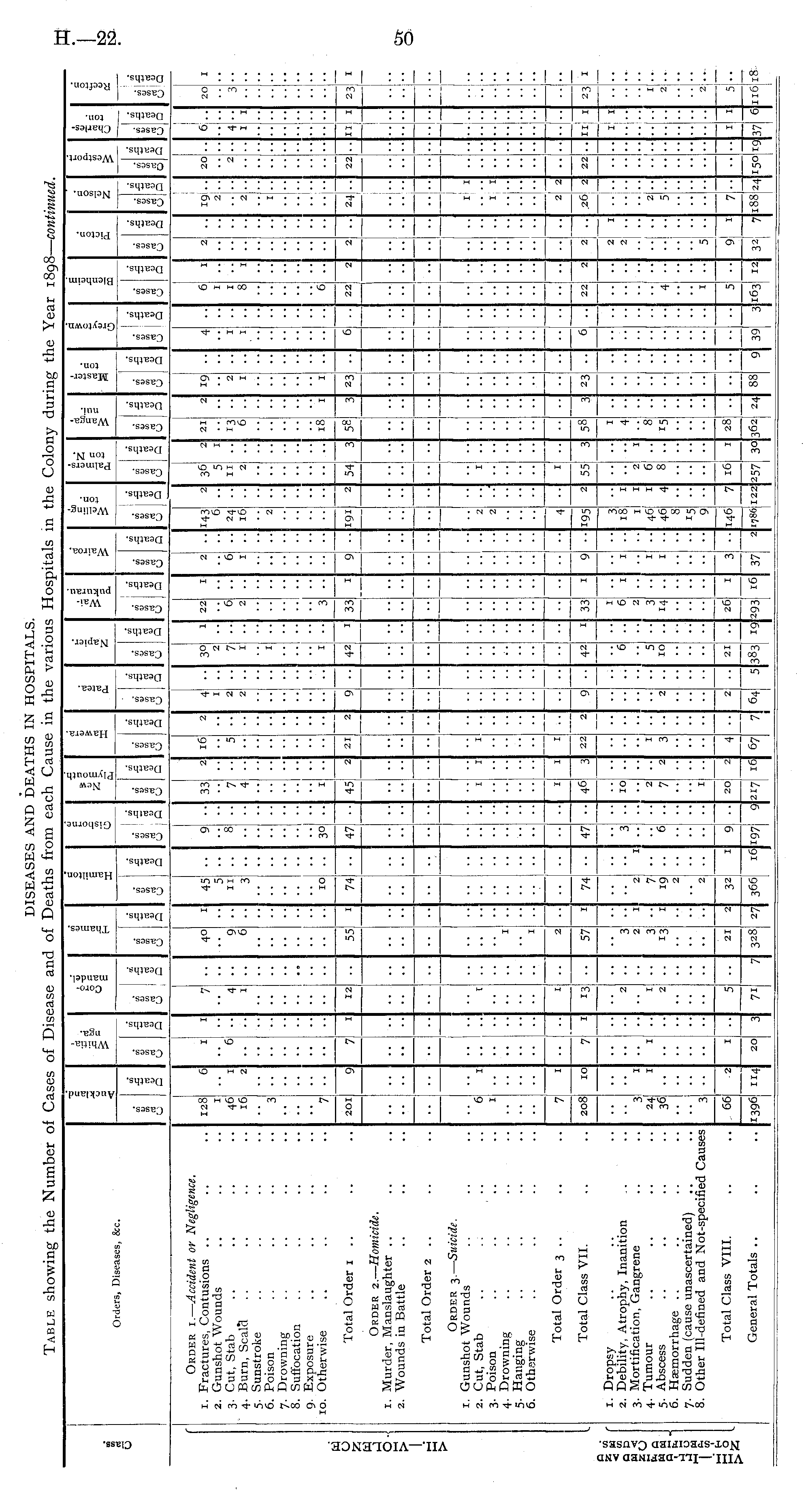 DISEASES AND DEATHS IN HOSPITALS. Table showing the Number of Cases of Disease and of Deaths from each Cause in the various Hospitals in the Colony during the Year 1898— continued.