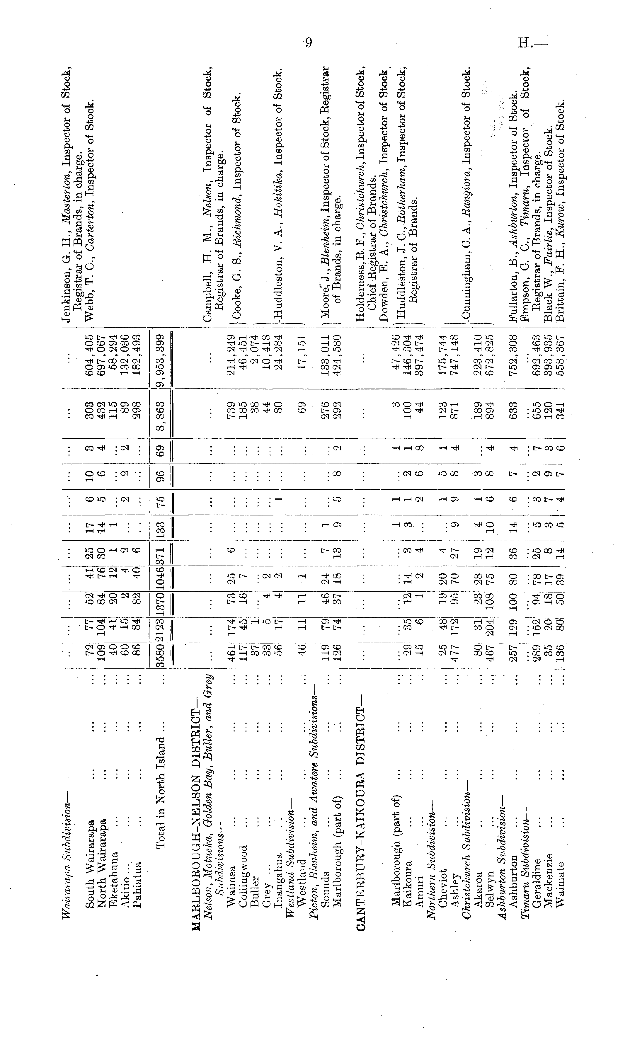Wairarapa Subdivision — .. ... | South Wairarapa ... ... ... 72 77 North Wairarapa ... ... ... 109 104! Bketahuna ... ... ... ... 40 41 Akitio... ... ... ... ... 60 15 Pahiatua ... ... ... ... 86 84 i i - 72 109 40 60 86 77 104 15 84 52 84 20 82 41 76 12 40 25 30 1 2 6 j 17 14 1 6 5 10 6 3 4 303 432 115 89 298 j 604,405 697,067 58,294 132,036 182, 493 Jenkinson, G. H., Masterton, Inspector of Stock, Eegistrar of Brands, in charge. Webb, T. C., Carterton, Inspector of Stock. 2 2 Q 1 Total in North Island ... ... 3580 2123 I ! ! ! MAELBOEOUGH-NELSON DISTEICT— Nelson, Motueka, Golden Bay, Butter, and Grey S twdiv isions — Waimea ... ... ... ... 461 174 Collingwood ... ... ... ... 117 45 Buller ... ... ... ... 37! 1 Grey ... ... ... ... ... 33J 5 Inangahua ... ... ... ... 56J 17 Westland Subdivision — Westland ... ... ... ... 46 11 Picton, Blenheim, and Awatere Subdivisions — Sounds ... ... ... ... 119 79 Marlborough (part of) ... ... ... 126 74 3580 2123 1370 1046 371 ! 1133 75 96 69 8,863 [9,953,399 Campbell, H. M., Nelson, Inspector of Stock, Eegistrar of Brands, in charge. I 461 174 117 45 37! 1 33i 5 56J 17 73 16 25 7 2 2 6 ... I ■" ... ... 739 185 38 44 80 214,249 46,451 2,074 10,418 24,284 Cooke, G. S., Richmond, Inspector of Stock. J-Huddleston, V. A., Hokitika, Inspector of Stock. 4 4 ... i ... 1 j 46 11 11 1 I ... I ... 69 17,151 i 119 79 126 74 46 37 24 18 7 J 1 13 I 9 5 8 2 276 292 133,011 424,580 I Moore", J., Blenheim, Inspector of Stock, Eegistrar I of Brands, in charge. ! CANTEEBUEY-KAIKOUEA DISTEICT— ... j ... I Holderness,E.]?., Ghristchurch, Inspector of Stock, Chief Eegistrar of Brands. Dowden, E. A., Ghristchurch, Inspector of Stock ... I I i 3 100 44 47,426 146,304 397,474 Marlborough (part of) ... ... i ... Kaikoura ... ... ... ... 29} 35 Amuri ... ... ... ... 18 6 Northern Subdivision — Cheviot ... ... ... ... 25 48 Ashley ... ... ... ... 477| 172 Ghristchurch Subdivision — Akaroa ., ... ... ... 80 31 Selwyn ... ... ... ... 467 204 Ashburton Subdivision — Ashburton ... ... ... ... 257 129 Timaru Subdivision — ... I ... Geraldine ... ... ... ... 289 152 Mackenzie ... ... ... ... 35 20 Waimate ... ... ... ... ! 136 80 12 14 1 2 19 20 95 70 23 28 108 75 ... 1 3 3 4 ... 4 ... 27 9 19 4 12 i 10 1 1 2 1 9 1 6 1 2 1 6 8 5 1 8 4 3 ... 8 ! 4 123 871 189 894 175,744 747,148 223,410 672,825 j Huddleston, J. C, Botherham, Inspector of Stock, j' Eegistrar of Brands. -Cunningham, C. A., Bangiora, Inspector of Stock. 100 80 941 78 18! 17 50i 39 36 I 14 25 J 5 8 I 3 14 5 6 3 7 4 7 4 2 I 7 9 3 7 ' 6 633 655 120 341 752,308 692,463 393,935 558,367 Fullarton, B., Ashburton, Inspector of Stock. Bmpson, C. C, Timaru, Inspector of Stock, Eegistrar of Brands, in charge. Black W., Fairlie, Inspector of Stock. Brittain, F. H., Kuroiv, Inspector of Stock.