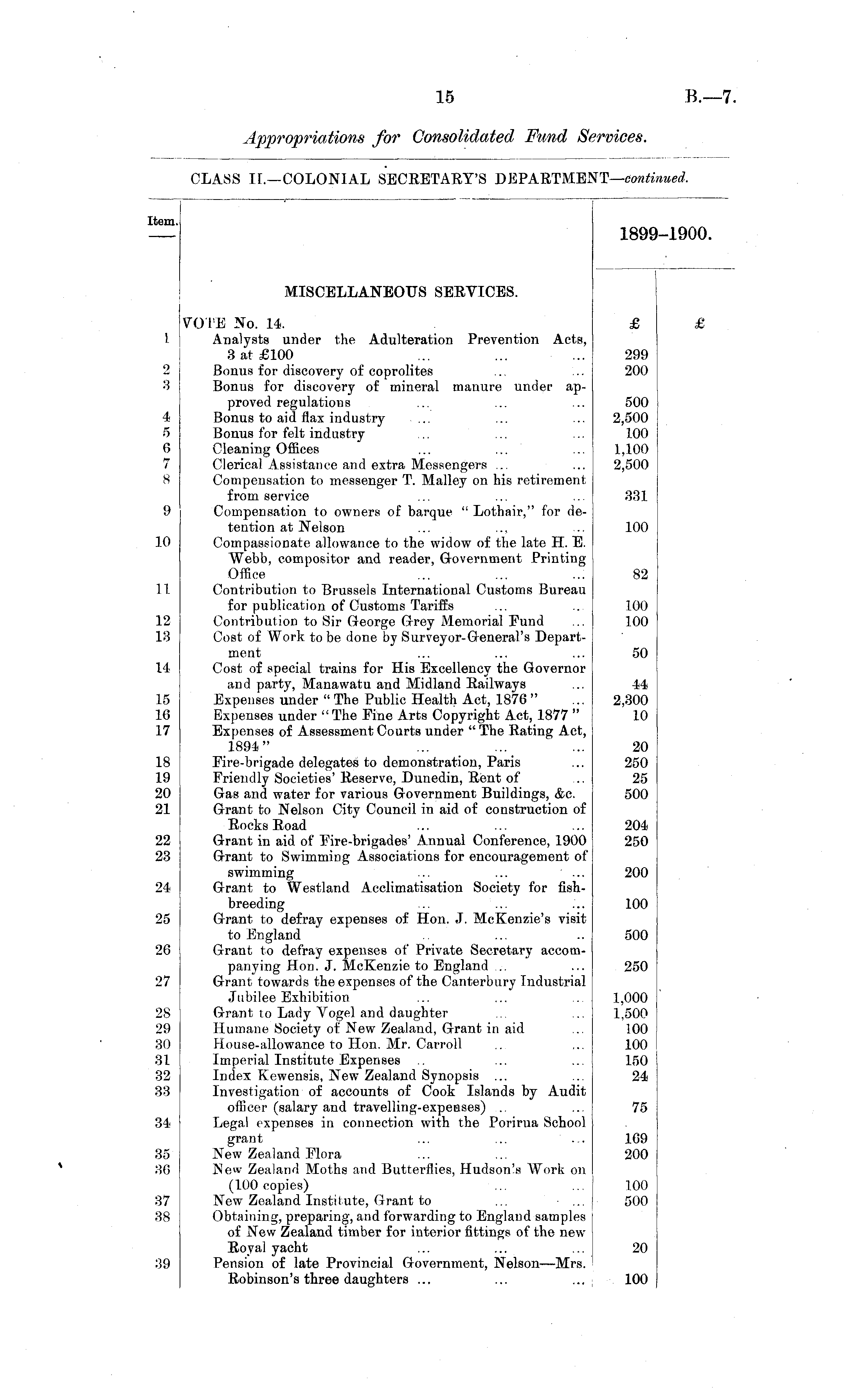 ;em. 189' 1-1900 MISCELLANEOUS SEEVICES. £ £ I 2 3 4 5 0 7 8 9 10 11 12 13 11 15 16 17 18 19 20 21 VOTE No. 14. Analysts under the Adulteration Prevention Acts, 3 at £100 Bonus for discovery of coprolites Bonus for discovery of mineral manure under approved regulations Bonus to aid flax industry ... Bonus for felt industry Cleaning Offices ... ... Clerical Assistance and extra Messengers ... Compensation to messenger T. Malley on his retirement from service Compensation to owners of barque " Lothair," for detention at Nelson Compassionate allowance to the widow of the late H. E. Webb, compositor and reader, Government Printing Office Contribution to Brussels International Customs Bureau for publication of Customs Tariffs Contribution to Sir George Grey Memorial Fund Cost of Work to be done by Surveyor-General's Department Cost of special trains for His Excellency the Governor and party, Manawatu and Midland Bailways Expenses under " The Public Health Act, 1876 " Expenses under "The Fine Arts Copyright Act, 1877 " Expenses of Assessment Courts under " The Bating Act, 1894" Fire-brigade delegates to demonstration, Paris Friendly Societies' Beserve, Dunedin, Bent of Gas and water for various Government Buildings, &c. Grant to Nelson City Council in aid of construction of Bocks Boad Grant in aid of Fire-brigades' Annual Conference, 1900 Grant to Swimming Associations for encouragement of swimming ... ... ... Grant to Westland Acclimatisation Society for fishbreeding Grant to defray expenses of Hon. J. McKenzie's visit to England Grant to defray expenses of Private Secretary accompanying Hon. J. McKenzie to England Grant towards the expenses ofthe Canterbury Industrial Jubilee Exhibition Grant to Lady Vogel and daughter Humane Society of New Zealand, Grant in aid House-allowance to Hon. Mr. Carroll Imperial Institute Expenses Index Kewensis, New Zealand Synopsis ... Investigation of accounts of Cook Islands by Audit officer (salary and travelling-expenses) .. Legal expenses in connection with the Porirua School grant New Zealand Flora New Zealand Moths and Butterflies, Hudson's Work on (100 copies) New Zealand Institute, Grant to ... ... Obtaining, preparing, and forwarding to England samples of New Zealand timber for interior fittings of the new Boyal yacht Pension of late Provincial Government, Nelson—Mrs. Bobinson's three daughters ... ... ... 299 200 500 2,500 100 1,100 2,500 331 100 82 100 100 50 44 2,300 10 20 250 25 500 22 23 204 250 24 200 25 100 26 500 27 250 28 29 30 31 32 3:1 1,000 1,500 100 100 150 24 75 34 35 36 169 200 37 38 100 500 20 39 100