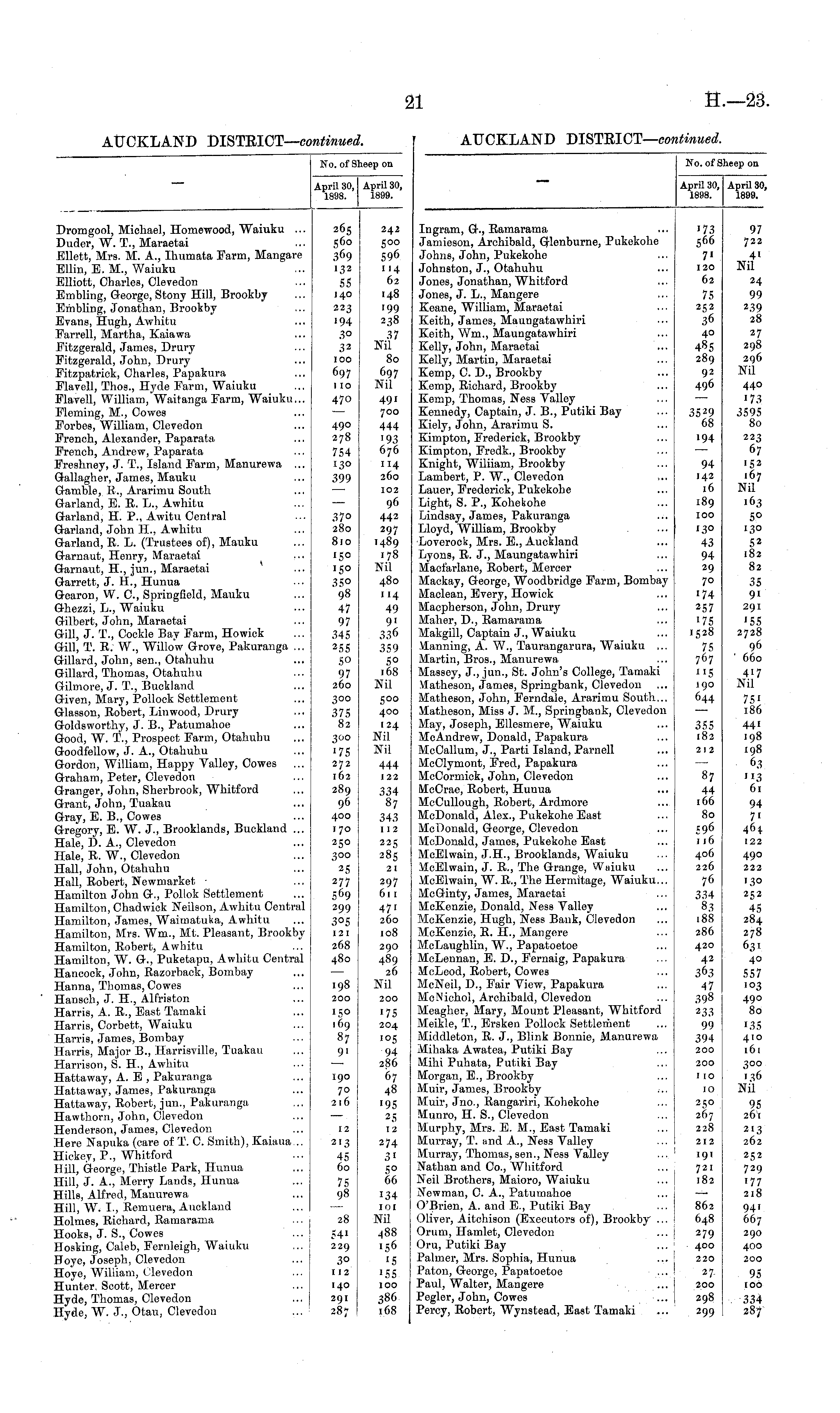 No. of Sheep on April 30, April 30, 1898. 1899. Dromgool, Michael, Homewood, Waiuku ... Duder, W. T., Maraetai Ellett, Mrs. M. A., Ihumata Farm, Mangare Ellin, E. M., Waiuku Elliott, Charles, Clevedon Enabling, George, Stony Hill, Brookby Embling, Jonathan, Brookby Evans, Hugh, Awhitu Farrell, Martha, Kaiawa Fitzgerald, James, Drury Eitzgerald, John, Drury Fitzpatrick, Charles, Papakura Plavell, Thos., Hyde Farm, Waiuku Flavell, William, Waitanga Farm, Waiuku... Fleming, M., Cowes Forbes, William, Clevedon French, Alexander, Paparata French, Andrew, Paparata Freshney, J. T., Island Farm, Manurewa ... Gallagher, James, Mauku Gamble, R., Ararimu South. Garland, E. E. L., Awhitu Garland, H. P., Awitu Ceniral Garland, John H., Awhitu Garland, E. L. (Trustees of), Mauku Garnaut, Henry, Maraetai Garnaut, H., jun., Maraetai Garrett, J. H., Hunua Gearon, W. 0., Springfield, Mauku Ghezzi, L., Waiuku Gilbert, John, Maraetai Gill, J. T., Cockle Bay Farm, Howick Gill, T. E. W., Willow Grove, Pakuranga ... Gillard, John, sen., Otahuhu Gillard, Thomas, Otahuhu Gilmore, J. T., Buckland Given, Mary, Pollock Settlement Glasson, Eobert, Lin wood, Drury Goldsworthy, J. B., Patumahoe Good, "W. T., Prospect Farm, Otahuhu Goodfellow, J. A., Otahuhu Gordon, William, Happy Valley, Cowes Graham, Peter, Clevedon Granger, John, Sherbrook, Whitford Grant, John, Tuakau Gray, E. B., Cowes Gregory, E. W. J., Brooklands, Buckland ... Hale, D. A., Clevedon Hale, E. "W., Clevedon Hall, John, Otahuhu Hall, Robert, Newmarket • Hamilton John G., Pollok Settlement Hamilton, Chadwick Neilson, Awhitu Central Hamilton, James, Waimatuka, Awhitu Hamilton, Mrs. Wm., Mt. Pleasant, Brookby Hamilton, Eobert, Awhitu Hamilton, W. G., Puketapu, Awhitu Central Hancock, John, Eazorback, Bombay Hanna, Thomas, Cowes Hansen, J. H., Alfriston Harris, A. K., East Tamaki Harris, Corbett, Waiuku Harris, James, Bombay Harris, Major B., Harrisville, Tuakau Harrison, S. H., Awhit\i Hattaway, A. E , Pakuranga Hattaway, James, Pakuranga Hattaway, Eobert, jun., Pakuranga Hawthorn, John, Clevedon Henderson, James, Clevedon Here Napuka (care of T. C. Smith), Kaiaua... Hickey, P., Whitford Hill, George, Thistle Park, Hunna Hill, J. A., Merry Lands, Hunua Hills, Alfred, Manurewa Hill, W. I., Eemuera, Auckland Holmes, Eichard, Bamarama Hooks, J. S., Cowes Hosking, Caleb, Fernleigh, Waiuku Hoye, Joseph, Clevedon Hoye, William, Clevedon Hunter. Scott, Mercer Hyde, Thomas, Clevedon Hyde, W. J., Otau, Clevedou 265 560 3 6 9 132 55 140 223 194 30 32 100 697 110 470 490 278 754 130 399 37° 280 810 '5° '5° 35° 98 47 97 345 2 55 50 97 260 300 375 82 300 '75 272 162 289 96 400 170 250 300 25 277 5 6 9 299 3°5 121 268 480 242 500 596 114 62 148 199 238 37 Nil 80 697 Nil 49' 700 444 '93 676 114 260 102 96 442 297 1489 178 Nil 480 114 49 9' 336 359 5° 168 Nil 500 400 124 Nil Nil 444 122 334 87 343 112 225 285 21 297 611 47' 260 108 290 489 26 Nil 198 200 200 15° ■ 69 87 9> 175 204 ■°5 94 286 67 48 •95 2 5 12 274 31 5° 66 190 70 216 12 213 45 60 75 98 28 541 229 3° 112 134 101 Nil 488 156 '5 '55 100 386 168 140 291 287