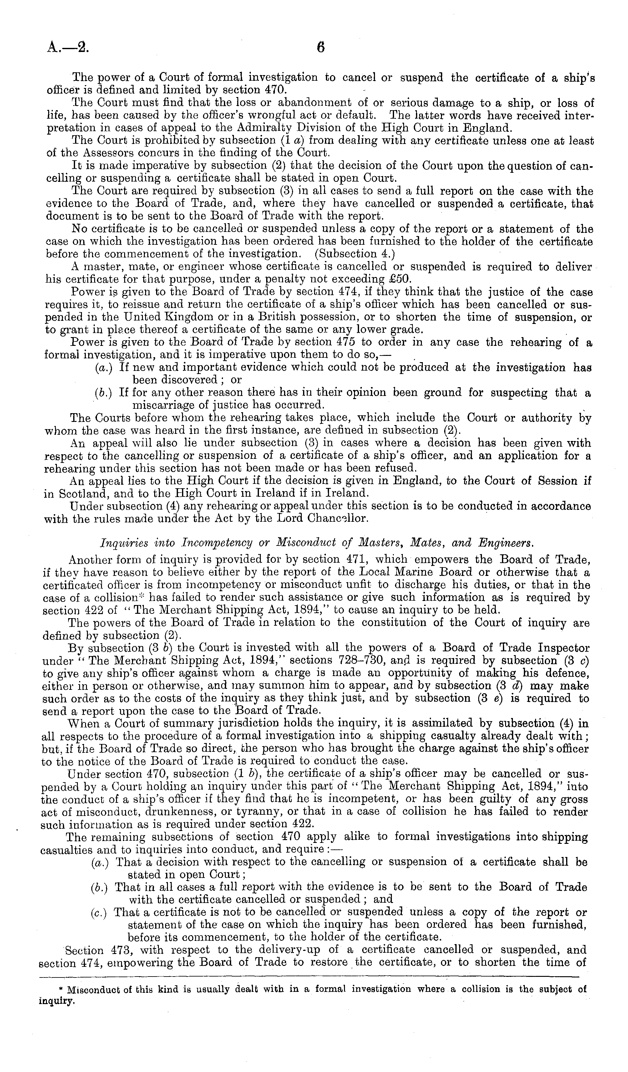 The power of a Court of formal investigation to cancel or suspend the certificate of a ship's officer is defined and limited by section 470. The Court must find that the loss or abandonment of or serious damage to a ship, or loss of life, has been caused by the officer's wrongful act or default. The latter words have received interpretation in cases of appeal to the Admiralty Division of the High Court in England. The Court is prohibited by subsection (1 a) from dealing with any certificate unless one at least of the Assessors concurs in the finding of the Court. It is made imperative by subsection (2) that the decision of the Court upon the question of cancelling or suspending a certificate shall be stated in open Court. The Court are required by subsection (3) in all cases to send a full report on the case with the evidence to the Board of Trade, and, where they have cancelled or suspended a certificate, that document is to be sent to the Board of Trade with the report. No certificate is to be cancelled or suspended unless a copy of the report or a statement of the case on which the investigation has been ordered has been furnished to the holder of the certificate before the commencement of the investigation. (Subsection 4.) A master, mate, or engineer whose certificate is cancelled or suspended is required to deliver his certificate for that purpose, under a penalty not exceeding £50. Power is given to the Board of Trade by section 474, if they think that the justice of the case requires it, to reissue and return the certificate of a ship's officer which has been cancelled or suspended in the United Kingdom or in a British possession, or to shorten the time of suspension, or to grant in place thereof a certificate of the same or any lower grade. Power is given to the Board of Trade by section 475 to order in any case the rehearing of a formal investigation, and it is imperative upon them to do so, — (a.) If new and important evidence which could not be produced at the investigation has been discovered; or (6.) If for any other reason there has in their opinion been ground for suspecting that a miscarriage of justice has occurred. The Courts before whom the rehearing takes place, which include the Court or authority by whom the case was heard in the first instance, are defined in subsection (2). An appeal will also lie under subsection (3) in cases where a decision has been given with respect to the cancelling or suspension of a certificate of a ship's officer, and an application for a rehearing under this section has not been made or has been refused. An appeal lies to the High Court if the decision is given in England, to the Court of Session if in Scotland, and to the High Court in Ireland if in Ireland. Under subsection (4) any rehearing or appeal under this section is to be conducted in accordance with the rules made under the Act by the Lord Chancellor. Inquiries into Incompetency or Misconduct of Masters, Mates, and Engineers. Another form of inquiry is provided for by section 471, which empowers the Board of Trade, if they have reason to believe either by the report of the Local Marine Board or otherwise that a certificated officer is from incompetency or misconduct unfit to discharge his duties, or that in the case of a collision* has failed to render such assistance or give such information as is required by section 422 of " The Merchant Shipping Act, 1894," to cause an inquiry to be held. The powers of the Board of Trade in relation to the constitution of the Court of inquiry are defined by subsection (2). By subsection (3 b) the Court is invested with all the powers of a Board of Trade Inspector under " The Merchant Shipping Act, 1894," sections 728-730, and is required by subsection (3 c) to give any ship's officer against whom a charge is made an opportunity of making his defence, either in person or otherwise, and may summon him to appear, and by subsection (3 d) may make such order as to the costs of the inquiry as they think just, and by subsection (3 c) is required to send a report upon the case to the Board of Trade. When a Court of summary jurisdiction holds the inquiry, it is assimilated by subsection (4) in all respects to the procedure of a formal investigation into a shipping casualty already dealt with; but, if the Board of Trade so direct, the person who has brought the charge against the ship's officer to the notice of the Board of Trade is required to conduct the case. Under section 470, subsection (1 b), the certificate of a ship's officer may be cancelled or suspended by a Court holding an inquiry under this part of " The Merchant Shipping Act, 1894," into the conduct of a ship's officer if they find that he is incompetent, or has been guilty of any gross act of misconduct, drunkenness, or tyranny, or that in a case of collision he has failed to render such information as is required under section 422. The remaining subsections of section 470 apply alike to formal investigations into shipping casualties and to inquiries into conduct, and require : — (a.) That a decision with respect to the cancelling or suspension of a certificate shall be stated in open Court; (b.) That in all cases a full report with the evidence is to be sent to the Board of Trade with the certificate cancelled or suspended ; and (c.) That a certificate is not to be cancelled or suspended unless a copy of the report or statement of the case on which the inquiry has been ordered has been furnished, before its commencement, to the holder of the certificate. Section 473, with respect to the delivery-up of a certificate cancelled or suspended, and section 474, empowering the Board of Trade to restore the certificate, or to shorten the time of