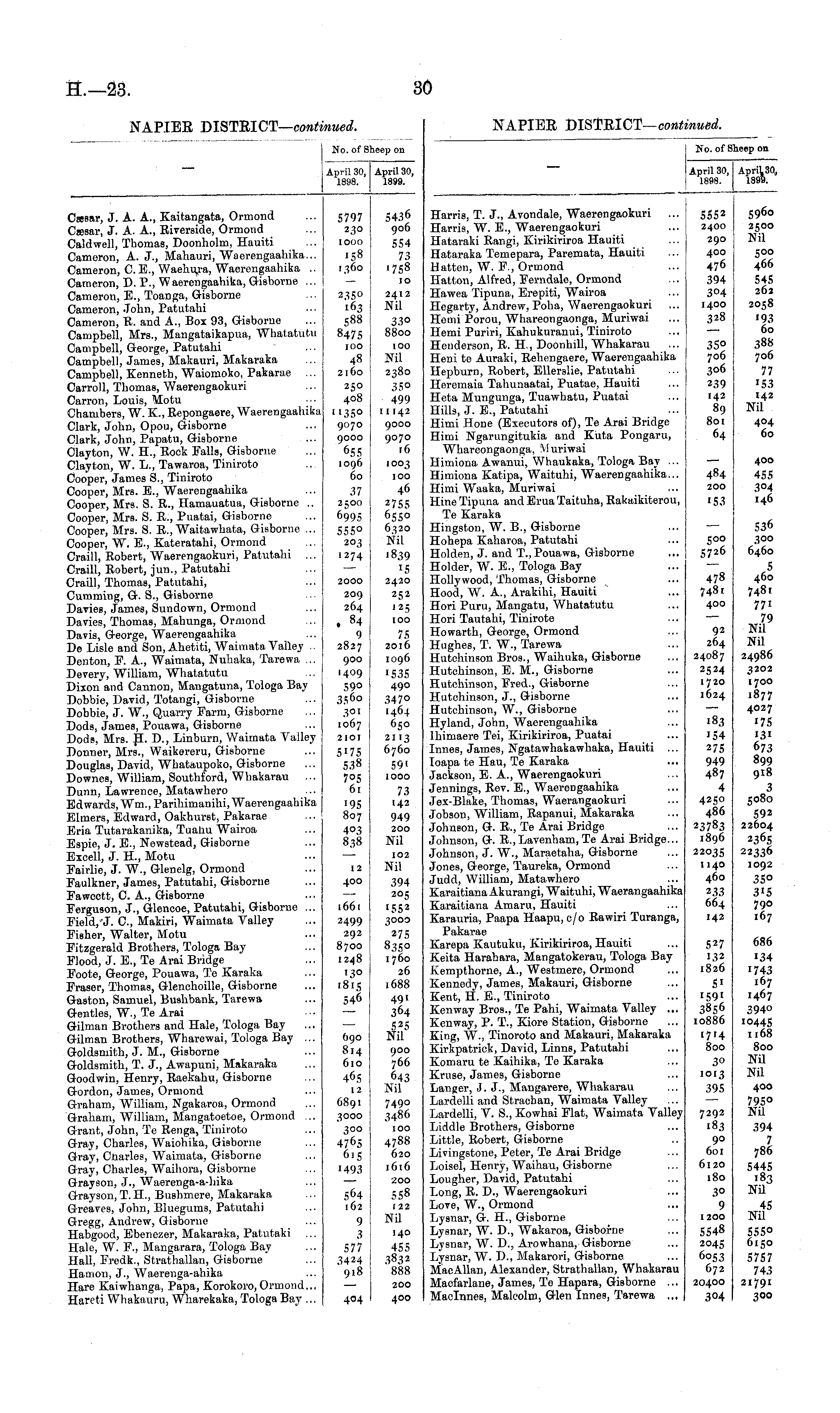 No. of Sheep on April 30, April 30, 1898. 1899. Cesar, J. A. A., Kaitangata, Ormond Cesar, J. A. A., Riverside, Ormond Caldwell, Thomas, Doonholm, Hauiti Cameron, A. J., Mahauri, "Waerengaahika... Cameron, C.E., Waehu,ra, Waerengaahika .. Cameron, D. P., Waerengaahika, G-isborne ... Cameron, B., Toanga, Gisborne Cameron, John, Patutahi Cameron, R. and A., Box 93, G-isborne Campbell, Mrs., Mangataikapua, Whatatutu Campbell, George, Patutahi Campbell, James, Makauri, Makaraka Campbell, Kenneth, Waiomoko, Pakarae ... Carroll, Thomas, Waerengaokuri Carron, Louis, Motu Chambers, W. K., Repongaere, Waerengaahika Clark, John, Opou, Gisborne Clark, John, Papatu, Giaborne Clayton, W. H., Rook Falls, Gisborne Clayton, W. L., Tawaroa, Tiniroto Cooper, James S., Tiniroto Cooper, Mrs. E., Waerengaahika Cooper, Mrs. S. R., Hamauatua, Gisborne .. Cooper, Mrs. S. R., Puatai, Giaborne Cooper, Mrs. 8. R., Waitawhata, Gisborne ... Cooper, W. E., Kateratahi, Ormond Craill, Robert, Waerengaokuri, Patutahi ... Craill, Robert, jun., Patutalii Craill, Thomas, Patutahi, Cumming, G. S., Gisborne Davies, James, Sundown, Ormond Davies, Thomas, Mahunga, Ormond Davis, George, Waerengaahika De Lisle and Son, Ahetiti, "Waimata Valley .. Denton, F. A., Waimata, Nuhaka, Tarewa ... Devery, William, Whatatutu Dixon and Cannon, Mangatuna, Tologa Bay Dobbie, David, Totangi, Gisborne Dobbie, J. W., Quarry Farm, Gisborne Dods, James, Pouawa, Gisborne Dods, Mrs. H. D., Linburn, Waimata Valley Donner, Mrs., Waikereru, Gisborne Douglas, David, Whataupoko, Gisborne Downes, William, Southford, Whakarau Dunn, Lawrence, Matawhero Edwards, Wm., Parihimanihi, Waerengaahika Elmers, Edward, Oakhurst, Pakarae Eria Tutarakanika, Tuahu Wairoa Espie, J. E., Newstead, Gisborne Eicell, J. H., Motu Fairlie, J. W., Glenelg, Ormond Faulkner, James, Patutahi, Gisborue Fawcett, C. A., Gisborne Ferguson, J., Glencoe, Patutahi, Gisborne ... Field, 'J. C, Makiri, Waimata Valley Fisher, Walter, Motu Fitzgerald Brothers, Tologa Bay Flood, J. E., Te Arai Bridge Foote, George, Pouawa, Te Karaka Fraser, Thomas, Glenehoille, Gisborne Gaston, Samuel, Buslibank, Tarewa Gentles, W., Te Arai G-ilman Brothers and Hale, Tologa Bay Gilman Brothers, Wharewai, Tologa Bay ... Goldsmith, J. M., Gisborne Goldsmith, T. J., Awapuni, Makaraka Goodwin, Henry, Raekahu, Gisborne Gordon, James, Ormond Graham, William, Ngakaroa, Ormond Graham, William, Mangatoetoe, Ormond ... Grant, John, Te Renga, Tiniroto Gray, Charles, Waiohika, Gisborne Gray, Cnarles, Waimata, Gtsborne Gray, Charles, Waihora, Gisborne Grayson, J., Waerenga-a-hika Grayson, T. H., Bushmere, Makaraka Greaves, John, Bluegums, Patutahi Gregg, Andrew, Gisborne Habgood, Ebenezer, Makaraka, Patutaki ... Hale, W. F., Mangarara, Tologa Bay Hall, Fredk., Strathallan, Gisborne Hamon, J., Waerenga-ahika Hare Kaiwhanga, Papa, Korokoro, Ormond... Hareti Wliakauru, Wharekaka, Tologa Bay ... 5797 230 1000 136° 235° 163 588 8475 100 48 2160 250 408 "35° 9070 9000 655 1096 60 37 2500 6995 555° 203 1274 2000 209 264 . 84 9 2827 900 1409 59° 35 6o 301 1067 2101 5'75 538 705 61 5436 906 554 73 '758 10 2412 Nil 33° 8800 too Nil 2380 35° 499 11142 9000 9070 16 1003 100 46 2755 6 55° 6^20 Nil 1839 15 2420 252 '25 100 75 2016 1096 IS35 49° 347° 1464 650 2113 6760 591 1000 '95 807 4°3 838 73 142 949 200 Nil 12 400 1661 2499 292 8700 1248 130 1815 546 102 Nil 394 205 '552 3000 275 835° 1760 26 1688 49 1 364 525 Nil 690 814 610 465 12 6891 3000 300 4765 6>5 '493 900 766 643 Nil 749° 3486 100 4788 620 1616 564 162 9 3 577 3424 918 200 558 122 Nil 140 455 3832 888 404 200 400