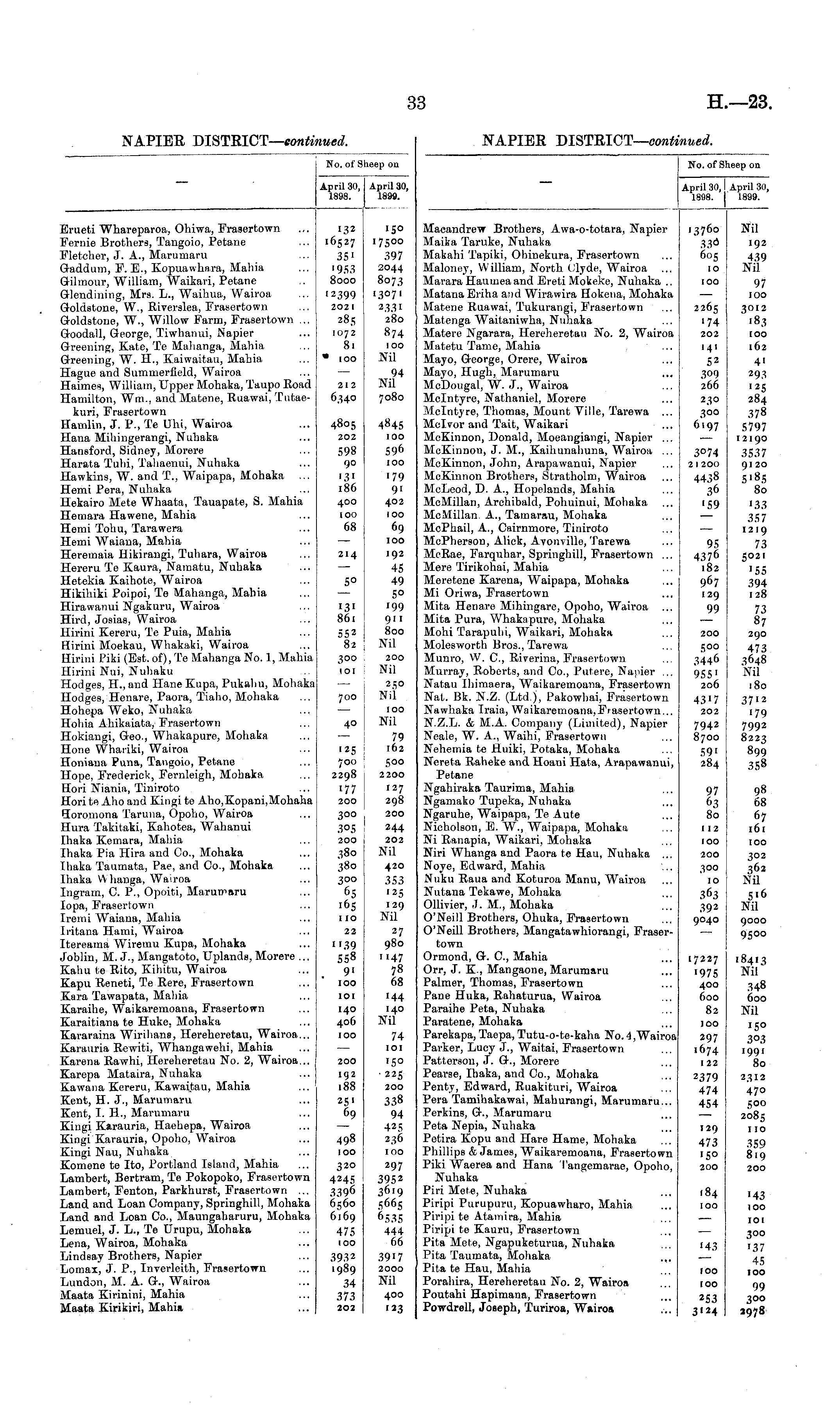 No. of 81 teep on April 30, April 30, 1898. 1899. Erueti Whareparoa, Ohiwa, Frasertown Fernie Brothers, Tangoio, Petane Fletcher, J. A., Marumaru Gaddum, I , . E., Kopuawhara, Maliia Gilmour, William, Waikari, Petane Glendiriing, Mrs. L., Waihua, Wairoa Goldstone, W., Riverslea, Frasertown β-oldstone, W., Willow Farm, Frasertown ... Groodall, George, Tiwhanui, Napier Greening, Kate, Te Malianga, Mahia Greening, W. H., Kaiwaitau, Mahia Hague and Summerfield, Wairoa Haimes, William, Upper Mohaka, Taupo Road Hamilton, Win., and Matene, Ruawai, Tiitaekuri, Frasertown Hamlin, J. P., Te Uhi, Wairoa Hana Mihingerangi, Nuhaka Hansford, Sidney, Morere Harata Tuhi, Taliaenui, Nuhaka Hawkins, W. and T., Waipapa, Mohaka ... Hemi Pera, Nuhaka Hekairo Mete Whaata, Tauapate, S. Maliia Hemara Hawene, Mahia Hemi Tohu, Tarawera Hemi Waiana, Mahia Heremaia Hikirangi, Tuhara, Wairoa Hereru Te Kaura, Naraatu, Nuhaka Hetekia Kaihote, Wairoa Hikihiki Poipoi, Te Mahanga, Mahia Hirawanui Ngakuru, Wairoa Hird, Josias, Wairoa Hirini Kereru, Te Puia, Mahia Hirini Moekau, Whakaki, Wairoa Hirini Piki (Est. of), Te Mahanga No. 1, Mahia Hirini Nui, Nuliaku Hodges, H., and Hane Kupa, Pukalm, Mohaka Hodges, Henare, Paora, Tiaho, Mohaka Hohepa Weko, Nuhaka Hohia Ahikaiata, Frasertown Hokiangi, Geo., Whakapure, Mohaka Hone Whariki, Wairoa Honiana Puna, Tangoio, Petane Hope, Frederick, Fernleigh, Mohaka Hori Niania, Tiniroto Hori te Aho and Kingi te Aho,Kopani,Mohaha Soromona Taruna, Opoho, Wairoa Hura Takitaki, Kahotea, Wahanui thaka Kemara, Mahia Ihaka Pia Hira and Co., Mohaka Ihaka Taumata, Pae, and Co., Mohaka Ihaka W hanga, Wairoa Ingram, C. P., Opoiti, Marumaru Iopa, Frasertown Iremi Waiana, Mahia Iritana Hami, Wairoa Itereama Wiremu Kupa, Mohaka Joblin, M. J., Mangatoto, Uplands, Morere ... Kahu te Bito, Kihitu, Wairoa Kapu Reneti, Te Rere, Frasertown Kara Tawapata, Mahia Karaihe, Waikaremoana, Frasertown Karaitiana te Huke. Mohaka Kararaina Wirihane, Hereheretau, Wairoa... Karauria Rewiti, Whangawehi, Mahia Karena Rawhi, Hereheretau No. 2, Wairoa... Karepa Mataira, Nuhaka Kawaua Kereru, Kawaitau, Mahia Kent, H. J., Marumaru Kent, I. H., Marumaru Kingi Karauria, Haehepa, Wairoa Kingi Karauria, Opoho, Wairoa Kingi Nau, Nuhaka Komene te Ito, Portland Island, Mahia Lambert, Bertram, Te Pokopoko, Frasertown Lambert, Fenton, Parkhurst, Frasertown ... Land and Loan Company, Springhill, Mohaka Land and Loan Co., Maungaharuru, Mohaka Lemuel, J. L., Te Urupu, Mohaka Lena, Wairoa, Mohaka Lindsay Brothers, Napier Lomax, J. P., Inverleith, Frasertown Lundon, M. A. G., Wairoa Maata Kirinini, Mahia Maata Kirikiri, Mahia r 3 2 16527 35' 1 953 8000 12399 2021 28 S 1072 81 15° 17500 397 2044 8073 13071 23.SI 280 874 100 Nil • 100 212 6340 94 Nil 7080 4805 202 598 90 131 186 400 100 68 4845 100 596 100 '79 9i 402 100 69 100 192 45 49 5° '99 911 800 Nil 214 5° «3< 861 82 300 101 200 Nil 250 Nil 700 40 ■25 700 2298 177 200 100 Nil 79 162 500 2200 127 298 200 300 3°5 200 380 380 300 65 >6 5 no 244 202 Nil 420 353 '25 129 Nil 27 980 1147 78 68 22 "39 558 9' 100 101 140 406 100 •44 140 Nil 74 101 200 192 188 '5° 225 200 338 94 425 236 100 25' _! 9 498 100 320 4245 339 6 6560 6169 475 100 3932 1989 34 373 202 297 3952 3619 5665 6535 444 66 39'7 2000 Nil 400 '23
