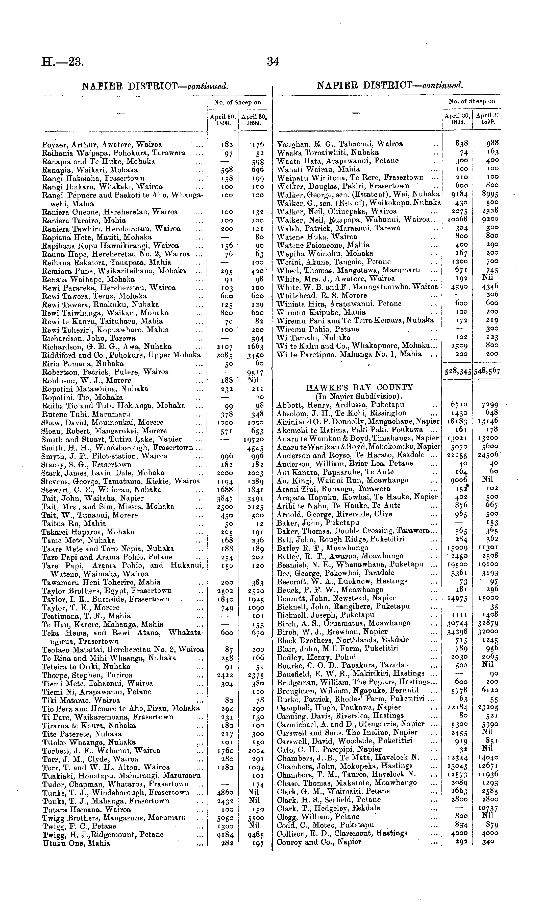 No. of Sheep on April 30, April 30, 1898. 1898. Poyzer, Arthur, Awatere, Wairoa Raihania Waipapa, Pohokura, Tarawera Ranapia and Te Huke, Mohaka Ranapia, Waikari, Mobaka Rangi Hakaialia, Frasertown Rangi Ihakara, Whakaki, Wairoa Rangi Pepuere and Paekoti te Aho, Whangawehi, Mahia Raniera Oneone, Hereheretau, Wairoa Raniera Tarairo, Maliia Raniera Tawliiri, Hereheretau, Wairoa Rapiana Heta, Matiti, Mohaka Rapihana Kopu Hawaikirangi, Wairoa Rauna Hape, Hereheretau No. 2, Wairoa ... Reihana Rakaiora, Tauapata, Maliia Remiora Puna, Waikariteihana, Mohaka Renata Waihape, Mohaka Rewi Parareka, Hereheretau, Wairoa Rewi Tawera, Terua, Mohaka Rewi Tawera, Ruakuku, Nuhaka Rewi Taiwhanga, Waikari, Mohaka Rewi te Kauru, Taituharu, Mahia Rewi Toheriri, Kopuawharo, Mahia Richardeon, John, Tarewa Richardson, Q-. B. G\, Awa, Nuhaka Riddiford and Co., Pohokura, Upper Mohaka Riria Pomana, Nuhaka Robertson, Patrick, Putere, Wairoa Robinson, W. J., Morere Ropotini Matawhina, Nuhaka Ropolini, Tio, Mohaka Ruiha Tio and Tutu Hokianga, Mohaka Rutene Tuhi, Marumaru Shaw, David, Moumoukai, Morere Sloan, Robert, Marigarukai, Morere Smith and Stuart, Tutira Lake, Napier Smith, H. H., Windsborough, Frasertown ... Smyth, J. F., Pilot-atation, Wairoa Stacey, S. &., Frasertown Stark, James, Lavin Dale, Mohaka Stevens, G-eorge, Tamatama, Kiekie, Wairoa Stewart, C. E., Whiorau, Nuhaka Tait, John, Waitaha, Napier Tait, Mrs., and Sim, Misses, Mohaka Tait, W., Tunanui, Morere Taitua Ru, Maliia Takarei Haparoa, Mohaka Tame Mete, Nuhaka Taare Mete and Toro Nepia, Nuhaka Tare Papi and Arama Pohio, Petane Tare Papi, Arama Pohio, and Hukanui, Watene, Waimaka, Wairoa Tawamaru Heni Toherire, Mahia Taylor Brothers, Egypt, Frasertown Taylor, I. E., Burnside, Frasertown Taylor, T. E., Morere Teatimana, T. R., Mahia Te Hau, Karere, Mahanga, Mahia Teka Hema, and Rewi Atana, Whakatangirua, Frasertown Teotaeo Mataitai, Hereheretau No. 2, Wairoa Te Rina and Mihi Whaanga, Nuhaka Teteira te Oriki, Nuhaka Thorpe, Stephen, Turiroa Tiemi Mete, Tahaenui, Wairoa Tiemi Ni, Arapawanui, Petane Tiki Matarae, Wairoa Tio Pera and Henare te Aho, Pirau, Mohaka Ti Pare, Waikaremoana, Frasertown Tirarua te Kaura, Nuhaka Tite Paterete, Nuhaka Titoko Whaanga, Nuhaka Torbett, J. F., Wahanui, Wairoa Torr, J. M., Clyde, Wairoa Torr, T. and W. H., Alton, Wairoa TuakiaM, Honatapu, Mahurangi, Marumaru Tudor, Chapman, Whataroa, Frasertown ... Tunks, T. J., Windsborough, Frasertown ... Tunks, T. J., Mahanga, Frasertown Tutara , Hamana, Wairoa Twigg Brothers, Mangaruhe, Marumaru Twigg, F. C, Petane Twigg, H. J.,Ridgemount, Petane Utuku One, Mahia 182 97 598 ■58 100 100 100 100 200 >56 76 2 95 9' i°3 600 ,2 5 800 70 100 2107 2085 5° 188 232 99 378 1000 57' 996 182 2000 "94 1688 3847 2500 45° 5° 205 168 188 176 5 2 598 696 '99 100 100 132 100 101 80 90 f>3 100 400 98 100 600 129 600 82 200 394 1663 345° 60 95 "7 Nil 211 20 98 348 1000 653 19720 4S45 996 182 2003 1289 1841 3491 212; 500 12 191 236 189 202 2.54 15° 120 200 2502 1840 749 383 2510 '925 1090 101 600 'S3 670 87 258 9i 2422 3°4 82 294 234 180 217 101 1760 280 1180 200 166 2375 380 no 78 290 '3° 100 300 '5° 2024 291 1094 101 '74 Nil Nil 4860 2432 100 S°5 0 1300 9184 282 •5° 55°° Nil 9485 197