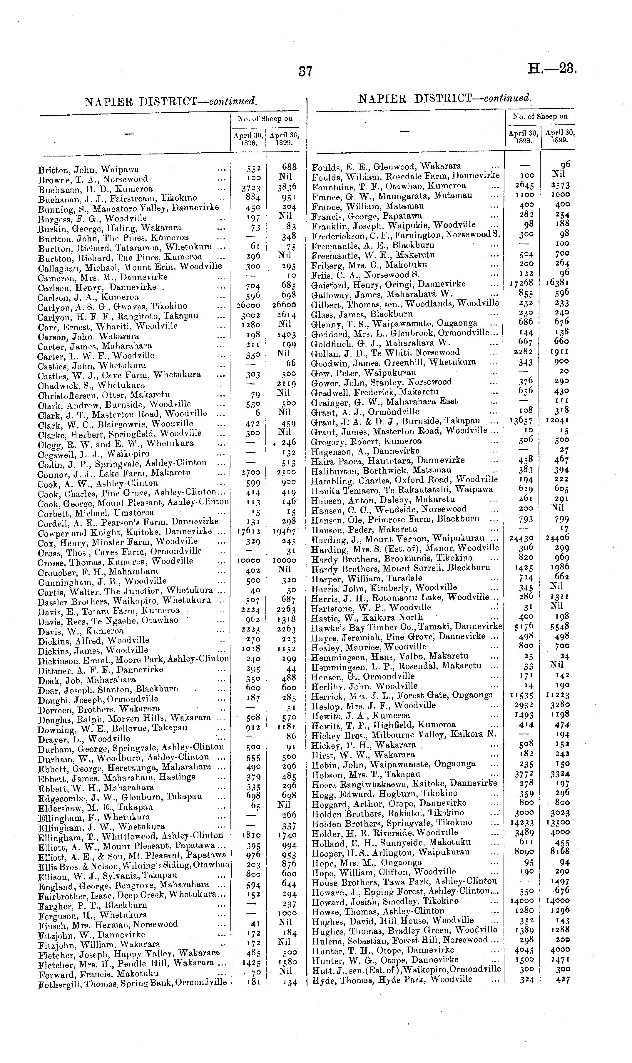 No. of Sheep on April 30, 1898. April 30, 1899. Britten, John, Waipawa Browne, T. A., Norsewood Buchanan, H. D., Kumeroa Buchanan, J. J., Fairstream, Tikokino Bunning, S., Mangatoro Valley, Dannevirke Burgess, F. G., Woodville Burkin, George, Haling, Wakarara Burtton, John, The Pines, Kftmeroa Burtton, Richard, Tatttramoa, Whetukura ... Burtton, Richard, The Pines, Kumeroa Callaghan, Michael, Mount Erin, Woodville Cameron, Mrs. M., Dannevirke Carlson, Henry, Dannevirke . Carlson, J. A., Kumeroa Carlyon, A. S. GK, G-wavas, Tikokino Carlyon, H. F. F., Rangitoto, Takapau Carr, Ernest, Whariti, Woodville Carson, John, Wakarara Carter, James, Maharahara Carter, L. W. F., Woodville Castles, John, Whetukura Castles, W. J., Cave Farm, Whetukura Chadwick, S., Whetukura Christoffersen, Otter, Makaretu Clark, Andrew, Burnaide, Woodville Clark, J. T., Masterton Boad, Woodville ... Clark, W. 0., Blairgowrie, Woodville Clarke, Herbert, Springfield, Woodville Clegg, R. W. and E. W., Whetukura Cogswell, L. J., Waikopiro Collin, J. P., Springvale, Ashley-Clinton ... Connor, J. J., Lake Farm, Makaretu Cook, A. W., Ashley-Clinton Cook, Charles, Pine Grove, Ashley-Clinton... Cook, George, Mount Pleasant, Ashley-Clinton Corbett, Michael, Umatoroa Cordell, A. E., Pearson's Farm, Dannevirke Cowper and Knight, Kaitoke, Dannevirke ... Cox, Henry, Minster Farm, Woodville Cross, Thos., Caves Farm, Ormondville Crosse, Thomas, Kumeroa, Woodville Croucher, F. H., Maharaliara Cunningham, J. B., Woodville Curtis, Walter, The Junction, Whetukura ... Dassler Brothers, Waikopiro, Whetukuru ... Davis, E., Totara Farm, Kumeroa Davis, Rees, Te Ngaehe, Otawhao Davis, W., Kumeroa Dickins, Alfred, Woodville Dickins, James, Woodville Dickinson, Emml., Moore Park, Ashley-Clinton Dittmer, A. F. F., Dannevirke Doak, Job, Maharahara Doar, Joseph, Slanton, Blackburn Donghi. Joseph, Ormondville Dorreen, Brothers, Wakarara Douglas, Ralph, Morven Hills, Wakarara ... Downing, W. E., Bellevue, Takapau Drayer, L., Woodville Durham, G-eorge, Springvale, Ashley-Clinton Durham, W., Woodburn, Ashley-Clinton ... Ebbett, George, Heretaunga, Maharahara ... Ebbett, James, Mib.arab.ava, Hastings Ebbett, W. H., Maharahara Edgecombe, J. W., Glenbuvn, Takapau Eldershaw, M. E., Takapau Ellingham, F., Whetukura Ellingham, J. W., Whetukura Ellingham, T., Whittlewood, Ashley-Clinton Elliott, A. W., Mount Pleasant, Papatawa ... Elliott, A. E., & Son, Mt. Pleasant, Papatawa Ellis Bros. & Nelson, VVildiug'sSiding, Otawhao Ellison, W. J., Sylvania, Takapau England, George, Bengrove, Maharahara ... Fairbrother, Isaac, Deep Creek, Whetukura... Fargher, P. T., Blackburn Ferguson, H., Whetukura Finsch, Mrs. Herman, Norsewood Fitzjohn, W., Dannevirke Fitz'john, William, Wakarara Fletcher, Joseph, Happy Valley, Wakarara Fletcher, Mrs. H., Pendle Hill, Wakarara ... Forward, Francis, Makotuku Fothergill, Tlionias, Spring Bank, Ormondville 552 100 3723 88 4 45° 197 73 688 Nil 95' 204 Nil 83 348 75 Nil 6i 2 9 6 300 704 59 6 26000 295 10 685 698 26600 2614 Nil 3002 1280 198 211 '4°3 "99 Nil 66 500 2119 Nil 33° 303 79 53° 6 Nil 472 300 459 Nil . 246 '32 5 "3 2500 900 419 I4 6 '5 298 19467 245 3' 10000 Nil 2700 599 414 "3 ■3 131 17612 329 10000 402 500 40 5°7 2224 go 2 2223 270 1018 320 3° 687 2263 1318 2263 223 1152 '99 44 488 600 283 M 57° 1181 86 240 2 95 35° 600 '87 508 912 500 555 49° 379 335 698 _69' 500 296 48S 296 698 Nil 266 337 1740 994 953 876 600 644 294 237 1000 Nil 184 Nil 1810 395 976 203 800 594 '52 4' 172 172 485 «425 ■ 7° 181 500 1580 Nil '34