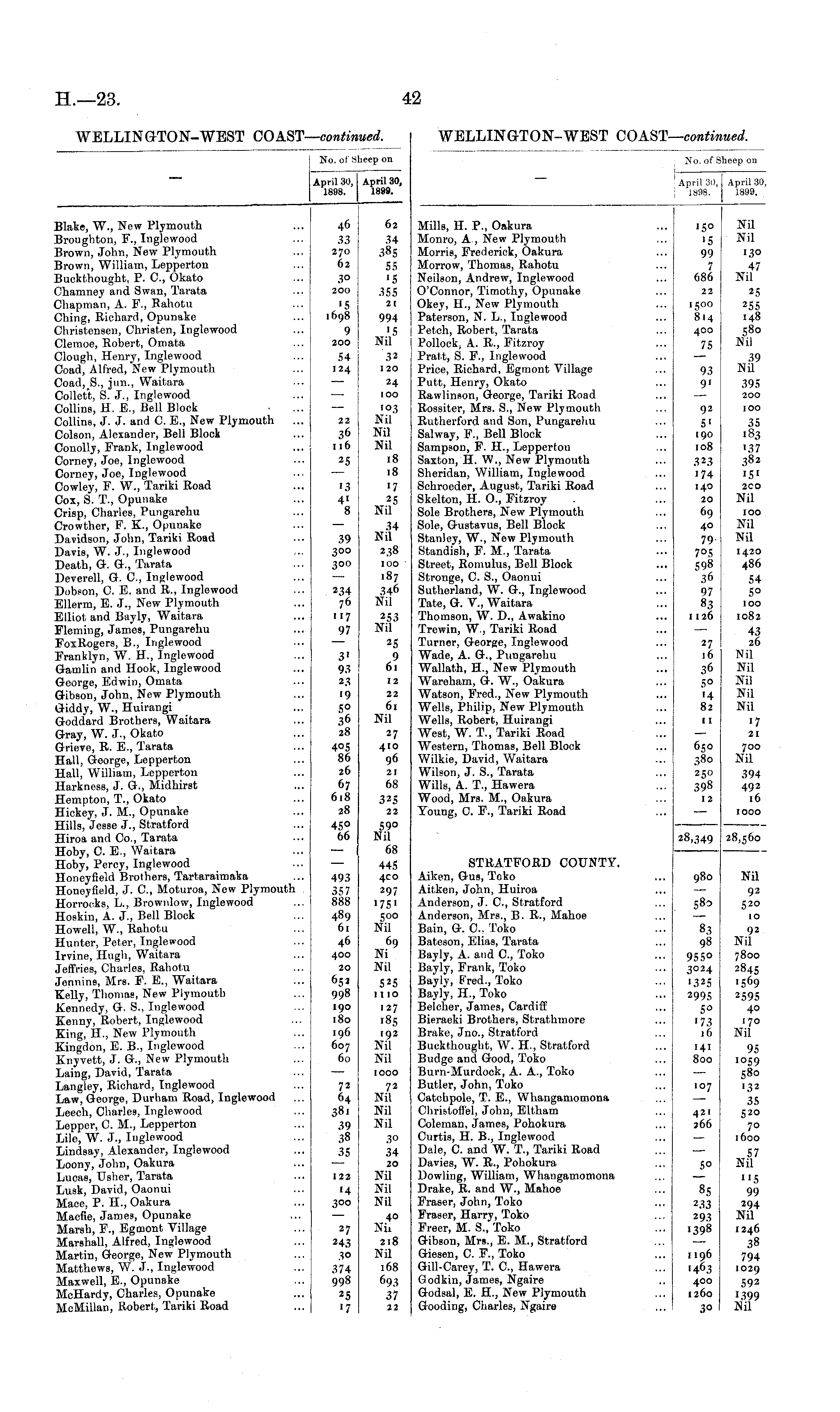 [o. o ieep on April 30, April 30, 1898. 1889. Blake, W., New Plymouth Broughton, F., Inglewood Brown, John, New Plymouth Brown, William, Lepperton Buckthought, P. 0., Okato Chamney and Swan, Tarata Chapman, A. F., Rahotu Ching, Richard, Opunake Christensen, Christen, Inglewood Clemoe, Robert, Omata Clough, Henry, Inglewood Coad, Alfred, New Plymouth Coad, S., jun., Waitara Collett, S. J., Inglewood Collins, H. B., Bell Block Collins, J. J. and C. E., New Plymouth ... Colson, Alexander, Bell Block Conolly, Prank, Inglewood Corney, Joe, Inglewood Corney, Joe, Inglewood Cowley, F. W., Tariki Road Cox, S. T., Opunake Crisp, Charles, Pungarehu Crowther, F. K., Opunake Davidson, John, Tariki Road Davis, W. J., Inglewood Death, G. &., Tarata Deverell, G. C., Inglewood Dobson, C. E. and B., Inglewood Ellerm, E. J., New Plymouth Elliot and Bayly, Waitara Fleming, James, Pungarehu FoxRogers, B., Inglewood Franklyn, W. H., Inglewood Gamlin and Hook, Inglewood George, Edwin, Omata Gibson, John, New Plymouth Giddy, W., Huirangi Goddard Brothers, Waitara Gray, W. J., Okato Grieve, R. E., Tarata Hall, George, Lepperton Hall, William, Lepperton Harkness, J. G., Midhirst Hempton, T., Okato Hickey, J. M., Opunake Hills, Jesse J., Stratford Hiroa and Co., Tarata Hoby, C. E., Waitara Hoby, Percy, Inglewood Honeyfield Brothers, Tartaraimaka Honeyfield, J. C, Moturoa, New Plymouth Horrocks, L., Browiilow, Inglewood Hoekin, A. J., Bell Block Howell, W., Rahotu Hunter, Peter, Inglewood Irvine, Hugh, Waitara Jeffries, Charles, Rahotu Jennins, Mrs. F. E., Waitara Kelly, Thomas, New Plymouth Kennedy, G. S., Inglewood Kenny, Robert, Inglewood King, H., New Plymouth Kingdon, E. B., Inglewood Knyvett, J. G., New Plymouth Laing, David, Tarata Langiey, Richard, Inglewood Law, George, Durham Road, Inglewood Leech, Charles, Inglewood Lepper, C. M., Lepperton Lile, W. J., Inglewood Lindsay, Alexander, Inglewood Loony, John, Oakura Lucas, Usher, Tarata Lusk, David, Oaonui Mace, P. H., Oakura Macfie, James, Opunake Marsh, F., Egmont Village Marshall, Alfred, Inglewood Martin, George, New Plymouth Matthews, W. J., Inglewood Maxwell, E., Opunake McHardy, Charles, Opunake McMillan, Robert, Tariki Road 46 33 270 62 3° 200 '5 1698 9 200 54 124 22 36 116 25 •3 4 1 8 39 300 300 234 76 117 97 3' 93 23 '9 5° 36 28 4°5 86 26 67 618 28 62 34 385 55 '5 355 21 994 Nil 5 32 120 24 100 103 Nil Nil Nil 18 18 17 Nil 34 Nil 238 100 187 346 Nil 253 Nil 2 5 6? 12 22 61 Nil 27 410 96 21 68 3*5 22 45° 66 493 357 888 489 61 46 400 20 65a 998 190 180 196 607 60 59° Nil 68 44S 4c o 297 •75> 500 Nil 69 Ni Nil 5^5 mo 127 185 192 Nil Nil 72 64 381 39 38 35 1000 72 Nil Nil Nil 122 3° 34 20 Nil Nil Nil '4 300 27 243 3° 374 998 25 >7 40 Nii 218 Nil 168 693 37 22