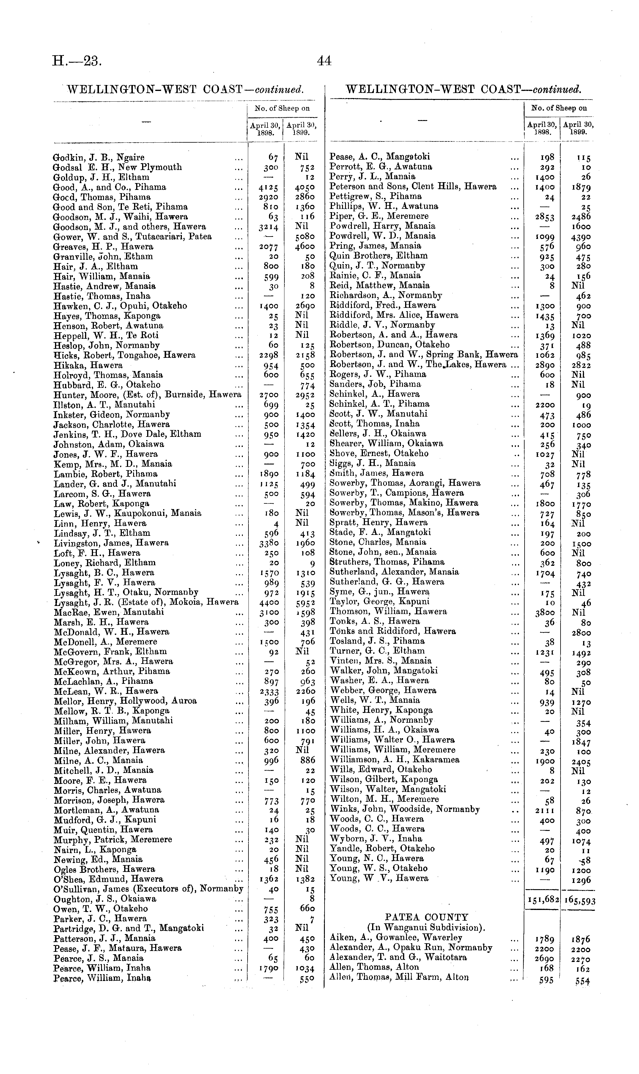 No. of Sheep on April 30, 1898. April 30, 1899. 1 Pease, A. C, Mangatoki Perrott, E. G., Awatuna Perry, J. L., Manaia Peterson and Sons, Clent Hills, Hawera Pettigrew, S., Pihama Phillips, W. H., Awatuna Piper, Gγ. Fj., Meremere Powdrell, Harry, Manaia Powdrell, W. D., Manaia Pring, James, Manaia Quin Brothers, Eltham Quin, J. T., Normanby Rainie, C. F., Manaia Reid, Matthew, Manaia Richardson, A., Normanby Riddiford, Fred., Hawera Riddiford, Mrs. Alice, Hawera Riddle, J. V., Normanby Robertson, A. and A., Hawera Robertson, Duncan, Otakeho Robertson, J. and W., Spring Bank, Hawera Robertson, J. and W., TheJJakes, Hawera ... Rogers, J. W., Pihama Sanders, Job, Pihama Schinkel, A., Hawera Sehinkel, A. T., Pihama Scott, J. W., Manutahi Scott, Thomas, Inaha Sellers, J. H., Okaiawa Shearer, William, Okaiawa Shove, Ernest, Otakeho Siggs, J. H., Manaia Smith, James, Hawera Sowerby, Thomas, Aorangi, Hawera Sowerby, T., Campions, Hawera Sowerby, Thomas, Makino, Hawera Sowerby, Thomas, Mason's, Hawera Spiatt, Henry, Hawera Stade, F. A., Mangatoki Stone, Charles, Manaia Stone, John, sen., Manaia Struthers, Thomas, Pihama Sutherland, Alexander, Manaia Sutherland, G. G., Hawera Syme, G., jun., Hawera Taylor, George, Kapuni Thomson, William, Hawera Tonka, A. S., Hawera Tonks and Riddiford, Hawera Tosland, J. S., Pihama Turner, G. C, Eltham Vinten, Mrs. S., Manaia Walker, John, Mangatoki Washer, E. A., Hawera Webber, George, Hawera Wells, W. T., Manaia White, Henry, Kaponga Williams, A., Normanby Williams, H. A., Okaiawa Williams, W r alter O., Hawera Williams, William, Meretnere Williamson, A. H., Kakaramea Wills, Edward, Otakeho Wilson, Gilbert, Kaponga Wilson, Walter, Mangatoki Wilton, M. H., Meremere Winks, John, Woodside, Normanby Woods, C. C, Hawera Woods, C C, Hawera Wyborn, J. V., Inaha Yandle, Robert, Otakeho Young, N. C, Hawera Young, W. S., Otakeho Young, W V., Hawera 198 292 1400 1400 24 2853 1099 576 925 300 24 8 1300 I43S '3 1369 37' 1062 2890 600 18 2200 473 200 4'S 256 1027 32 708 467 1800 727 164 197 200 600 362 1704 "5 io 26 1879 22 2 5 2486 1600 439° 960 475 280 156 Nil 462 goo 700 Nil 1020 488 985 2822 Nil Nil 900 <9 486 1000 75° 34° Nil Nil 778 "35 306 1770 850 Nil 200 Nil 800 740 432 Nil 46 Nil 80 2800 •75 10 3800 " 36 38 1231 13 1492 290 308 5° Nil 1270 Nil 354 1847 100 495 80 14 939 20 40 230 1900 8 2405 Nil 130 12 26 870 300 400 1074 11 58 1200 1296 ' 6 5.593 202 58 2111 400 497 20 67 1190 151,682 PATEA COUNTY (In Wanganui Subdivision). Aiken, A., Gowanlee, Waverley Alexander, A., Opaku Run, Normanby Alexander, T. and G., Waitotara Allen, Thomas, Alton Allen, Thomas, Mill Farm, Alton 1789 2200 2690 168 595 ( 1876 2200 2270 162 554