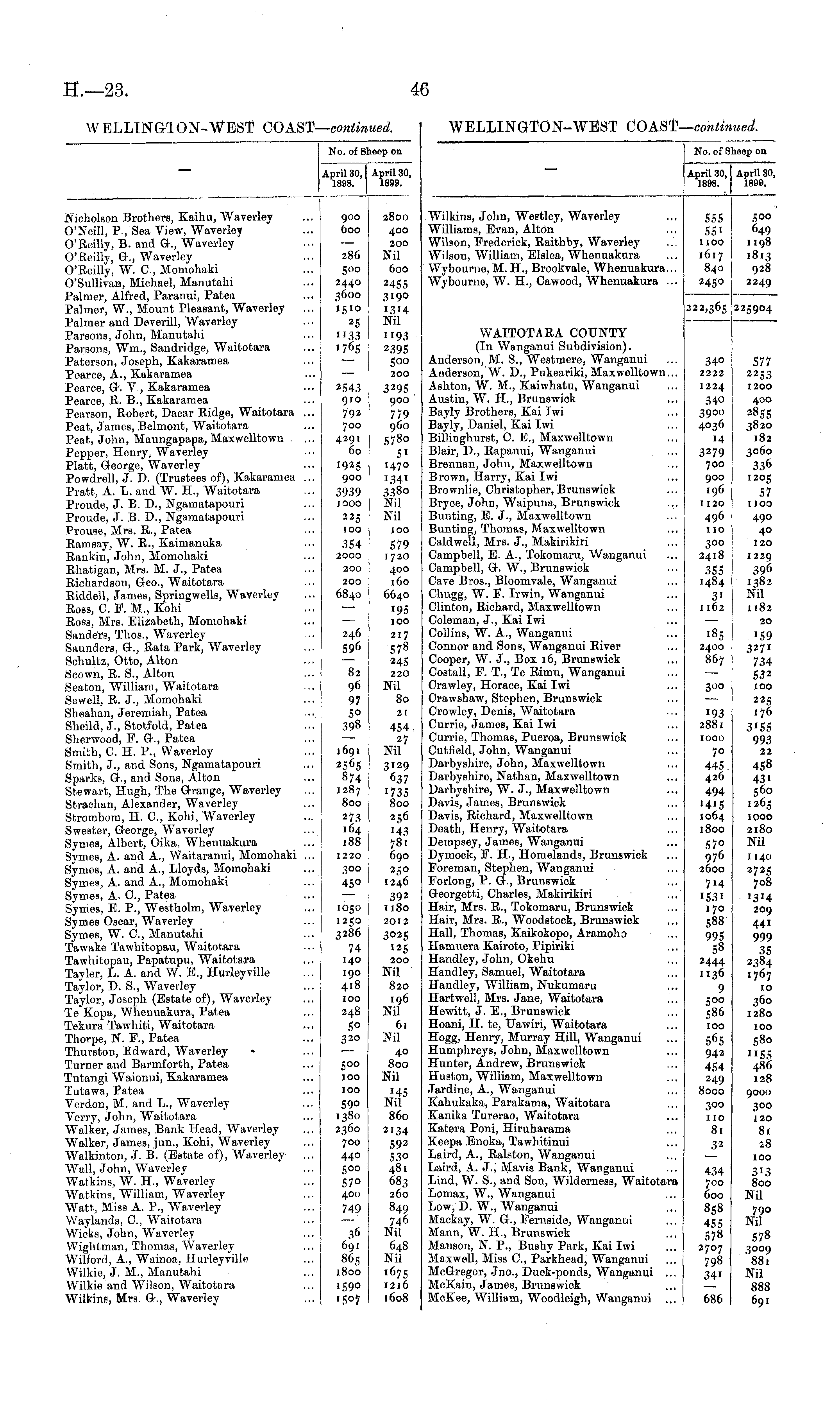 No. of Sheep on April 30, April 30, 1898. 1899. Wilkins, John, Weetley, Waverley Williams, Evan, Alton Wilson, Frederick, Raithby, Waverley Wilson, William, Elslea, Whenuakura Wybourne, M. H., Brookvale, Whenuakura... Wybourne, W. H., Cawood, Whenuakura ... 555 55 1 I 100 I 1617 I 840 2450 222,365 500 649 1198 1813 928 2249 WAITOTARA COUNTY (In Wanganui Subdivision). Anderson, M. S., Westmere, Wanganui Anderson, W. D., Pukeariki, Maxwelltown... Ashton, W. M., Kaiwhatu, Wanganui Austin, W. H., Brunswick Bayly Brothers, Kai Iwi Bayly, Daniel, Kai Iwi Billinghurst, C. K., Maxwelltown Blair, D., Rapanui, Wanganui Brennan, John, Maxwelltown Brown, Harry, Kai Iwi Brownlie, Christopher, Brunswick Bryce, John, Waipuna, Brunswick Bunting, E. J., Maxwelltown Bunting, Thomas, Maxwelltown Caldwell, Mrs. J., Makirikiri Campbell, E. A., Tokomaru, Wanganui Campbell, Or. W., Brunswick Cave Bros., Bloomvale, Wanganui Chugg, W. F. Irwin, Wanganui Clinton, Richard, Maxwelltown Coleman, J., Kai Iwi Collins, W. A., Wanganui Connor and Sons, Wanganui River Cooper, W. J., Box 16, Brunswick Costall, F. T., Te Rimu, Wanganui Crawley, Horace, Kai Iwi Crawshaw, Stephen, Brunswick Crowley, Denis, Waitotara Currie, James, Kai Iwi Currie, Thomas, Pueroa, Brunswick Cutfield, John, Wanganui Darbyshire, John, Maxwelltown Darbyshire, Nathan, Maxwelltown Darbysliire, W. J., Maxwelltown Davis, James, Brunswick Davis, Richard, Maxwelltown Death, Henry, Waitotara Dempsey, James, Wanganui Dymock, F. H., Homelands, Brunswick Foreman, Stephen, Wanganui Forlong, P. Gk, Brunswick Georgetti, Charles, Makirikiri Hair, Mrs. R., Tokomaru, Brunswick Hair, Mrs. R., Woodstock, Brunswick Hall, Thomas, Kaikokopo, Aramoho Hamuera Kairoto, Pipiriki Handley, John, Okehu Handley, Samuel, Waitotara Handley, William, Nukumaru Hartwell, Mrs. Jane, Waitotara Hewitt, J. E., Brunswick Hoani, H. te, Uawiri, Waitotara Hogg, Henry, Murray Hill, Wanganui Humphreys, John, Maxwelltown Hunter, Andrew, Brunswick Huston, William, Maxwelltown Jardine, A., Wanganui Kahukaka, Parakama, Waitotara Kanika Turerao, Waitotara Katera Poni, Hiruharama Keepa Enoka, Tawhitinui Laird, A., Ralston, Wanganui Laird, A. J.,' Mavis Bank, Wanganui Lind, W. S., and Son, Wilderness, Waitotara Lomax, W., Wanganui Low, D. W., Wanganui Mackay, W. Gk, Fernside, Wanganui Mann, W. H., Brunswick Manson, N. P., Bushy Park, Kai Iwi Maxwell, Miss C, Parkhead, Wanganui McGregor, Jno., Duck-ponds, Wanganui ... McKain, James, Brunswick McKee, William, Woodleigh, Wanganui ... 225904 340 2222 1224 34O 3900 4036 14 3279 700 900 196 1120 496 no 300 2418 355 1484 3' 1162 577 2253 1200 400 285S 3820 182 3060 336 1205 57 1100 490 40 120 1229 39 6 1382 Nil 1182 20 185 2400 867 '59 327 1 734 532 100 225 176 3 [ 5S 993 22 458 43> 560 1265 1000 2180 Nil 300 193 2881 1000 70 445 426 494 1415 1064 1800 57° 976 2600 7"4 I53I 170 588 995 58 2444 1136 9 S°° 586 100 565 942 454 249 8000 1140 2725 708 i3'4 209 441 999 35 2384 1767 10 360 1280 100 580 "55 486 128 300 no 81 9000 300 120 81 i8 100 32 434 700 600 858 455 578 2707 798 341 686 313 800 Nil 790 Nil 578 3009 881 Nil 888 691